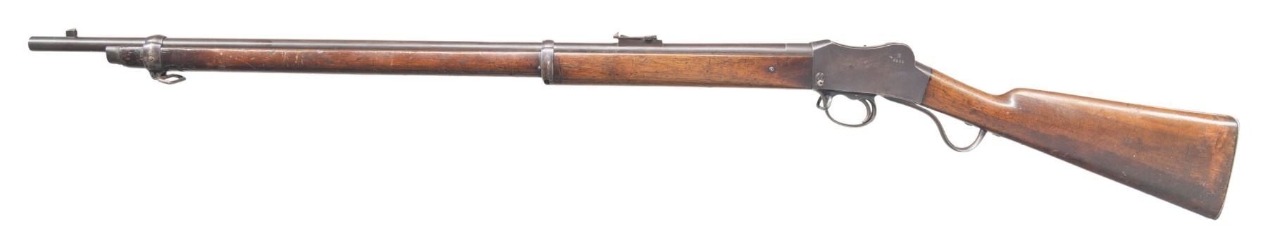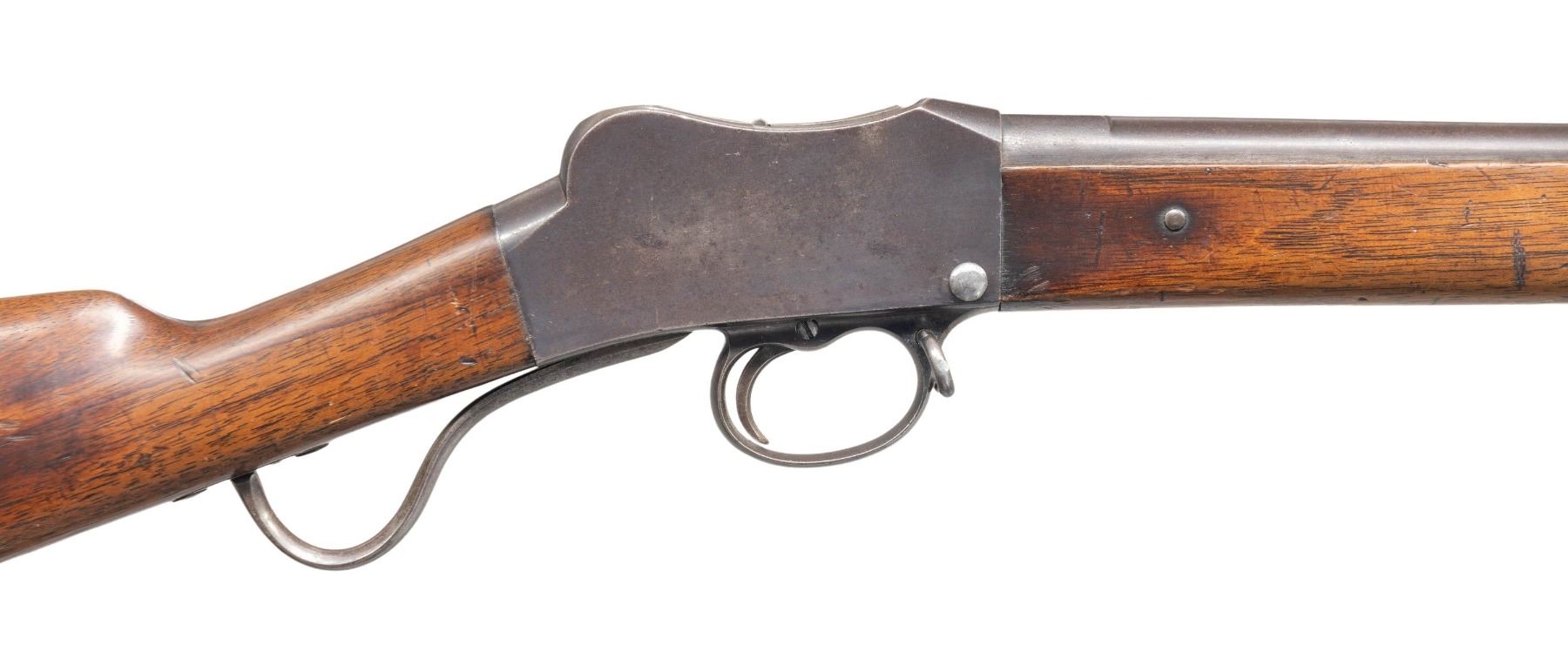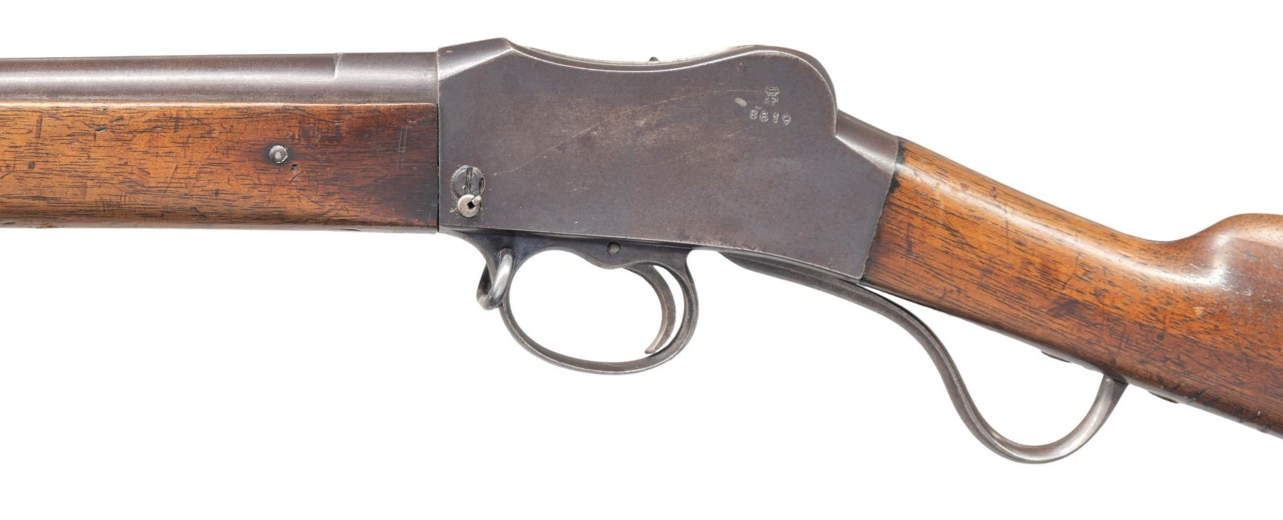 BREECHLOADING RIFLE. Cal. 297/230 Long. S# 8619. Bbl. 27 9/16". Martini Cadet single shot breechloading rifle mfg. by Auguste Francotte. Left side of the receiver is marked stamped with Francotte's Crown/AF proof above the S# "8619", otherwise the rifle is devoid of any identifying markings. Metal components exhibit a blue finish overall, save for on the breechblock, which is polished in-the-white. Near full length 2-band fastened plain wood forearm and straight grip stock with flat steel buttplate. Fixed blade front sight and V-notch ladder rear sight, graduated "3-5" on the ladder and "50", "100", and "200" on the right side of the base. Cleaning rod is absent. CONDITION: metal components retain large amounts of their original blue finish, showing areas of wear and thinning that are fading to gray and brown patina, some superficial handling marks, as well as scattered spots of light surface oxidation and pitting overall. Breechblock exhibits scattered spots of light pitting and spots of age related discoloration. Relatively bright bore, exhibiting consistent light to mild pitting, while retaining good rifling throughout. Proper manual mechanics. Wood furniture shows numerous scattered marks and impressions from handling and storage, but otherwise remains sound. PROVENANCE: From the Buckstix Collection. (25-6516/MLW). CURIO. $500-800.