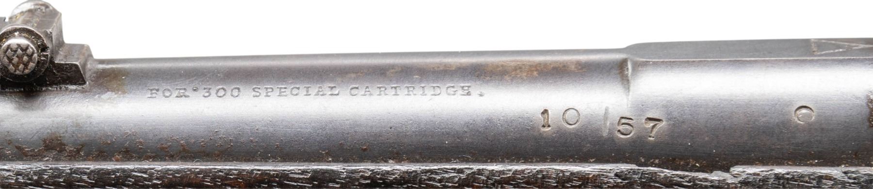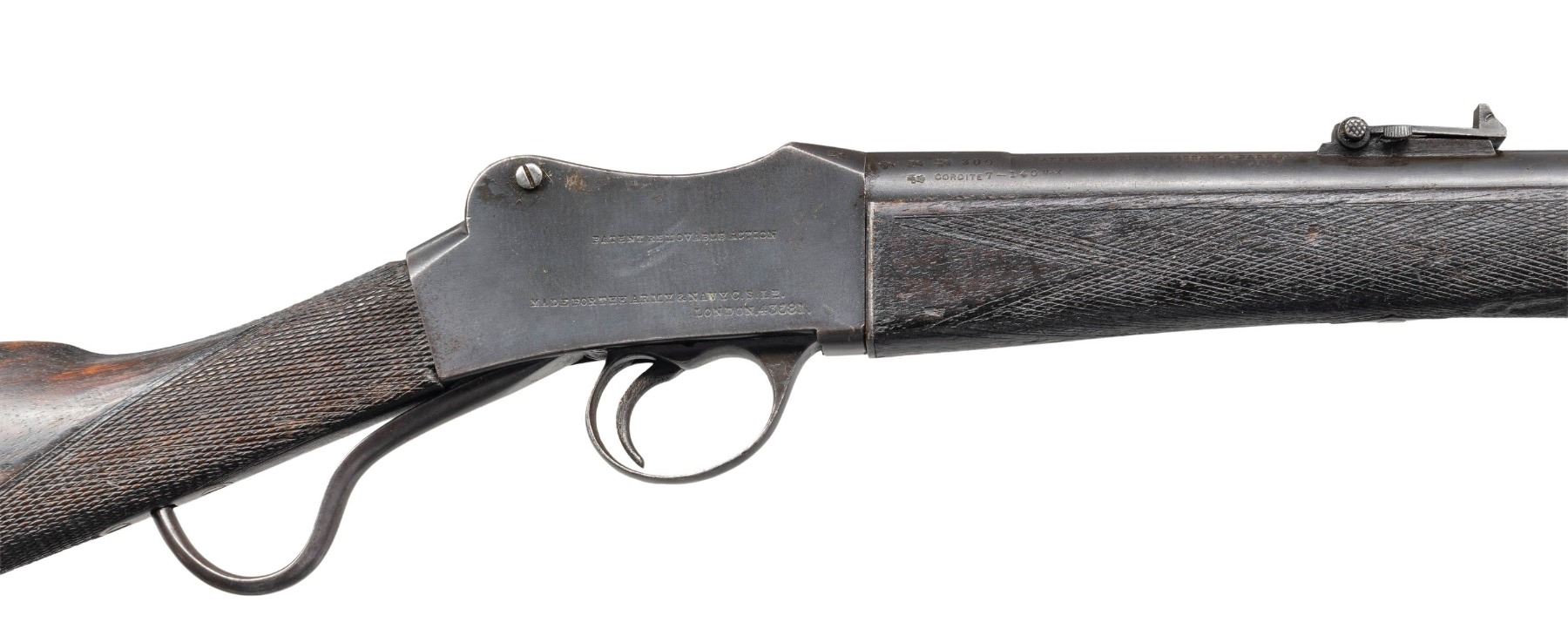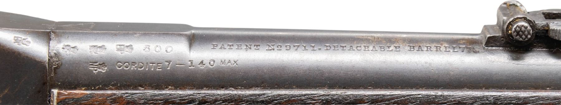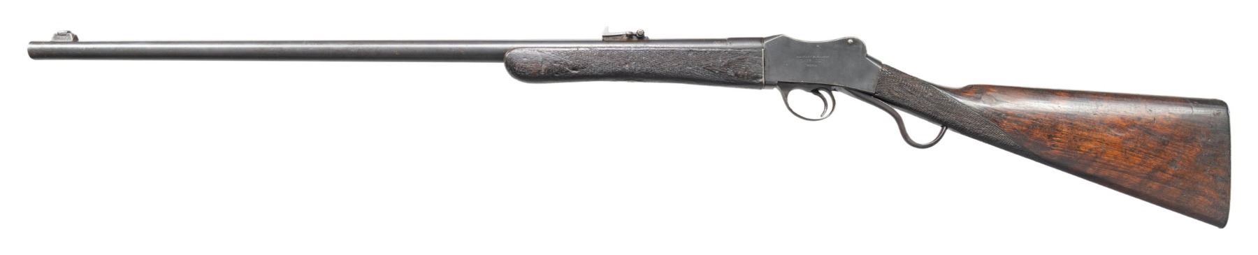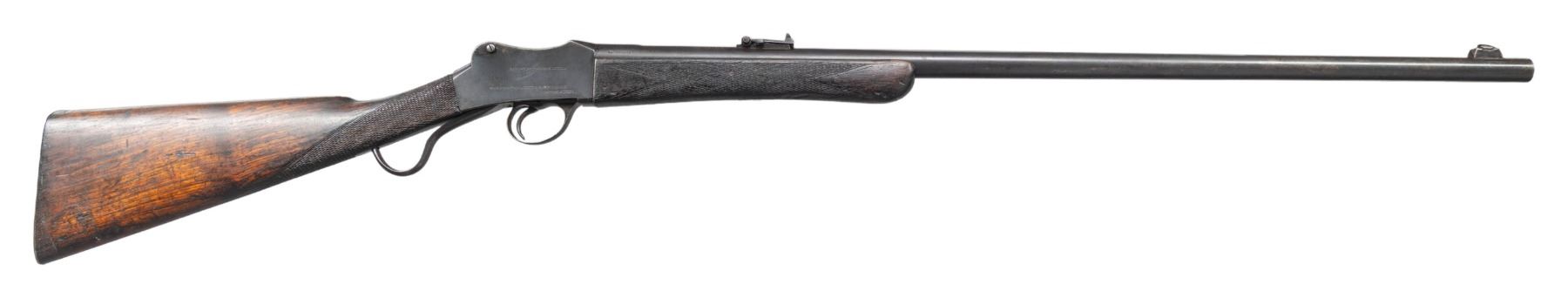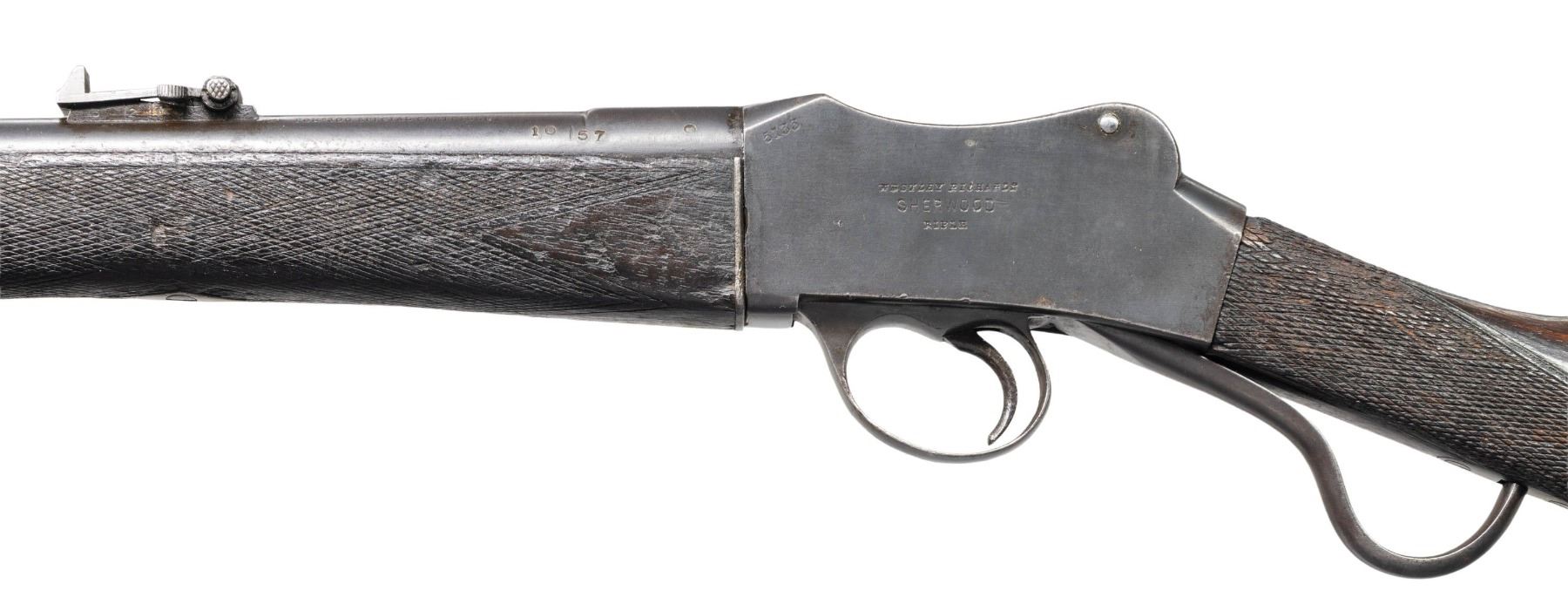 TARGET RIFLE. CAL. 300 Sherwood. S# 5133. Bbl. 25 5/8". Breech section of barrel has patent dates & Birmingham Nitro proofs; along with "10/57" on left side. Blade front sight & ladder rear sight. Martini style action w/ Westley Richards marks on left side, "PATENT REMOVEABLE ACTION" & Army & Navy C.S. Ltd. London #43681 markings. Checkered walnut stock set w/ steel buttplate. CONDITION: fair worn blue mixing with gray/brown patina showing spots of corrosion throughout. Fair worn wood finish with deep gouges throughout forearm, deep gouges around wrist, epoxy repair left side of comb. Fair worn bore. PROVENANCE: From the Buckstix Collection. (25-6393/MD). CURIO. $800-1,200.