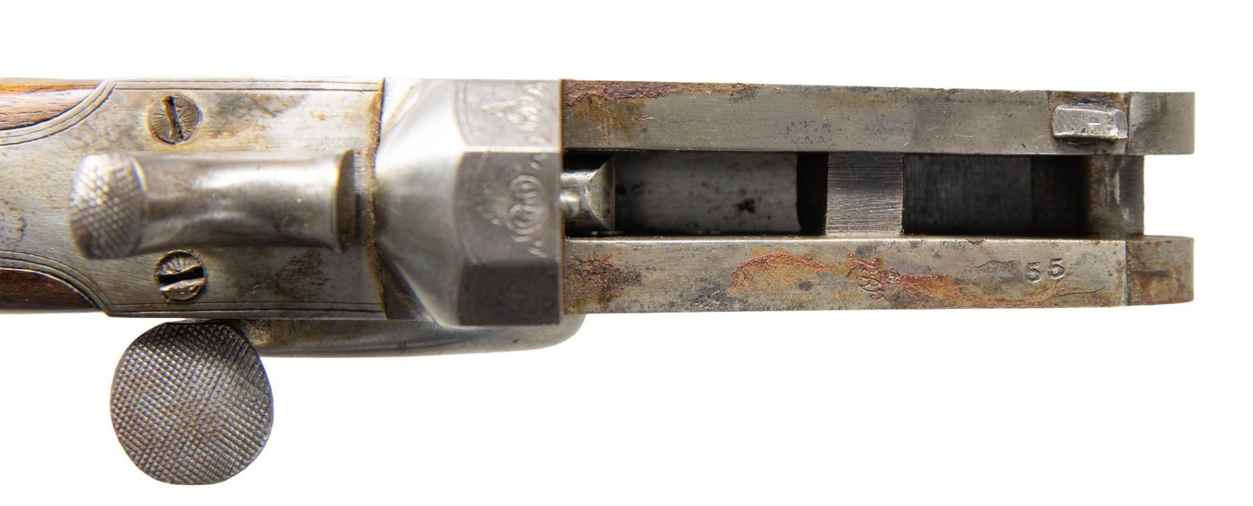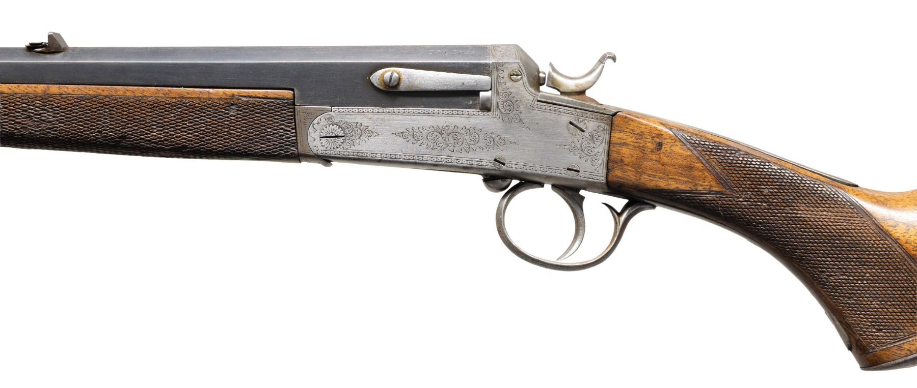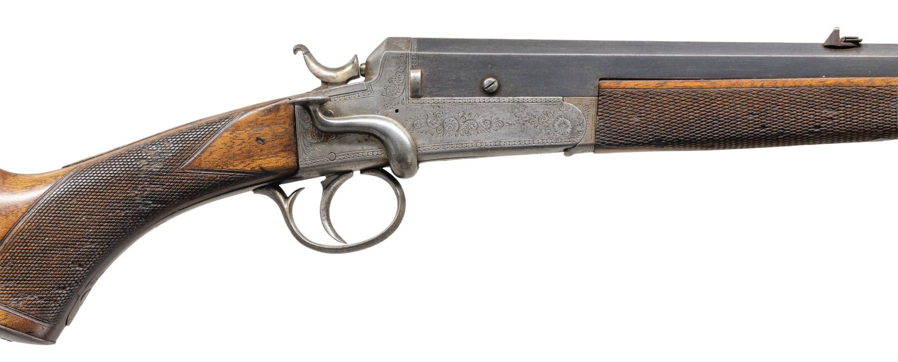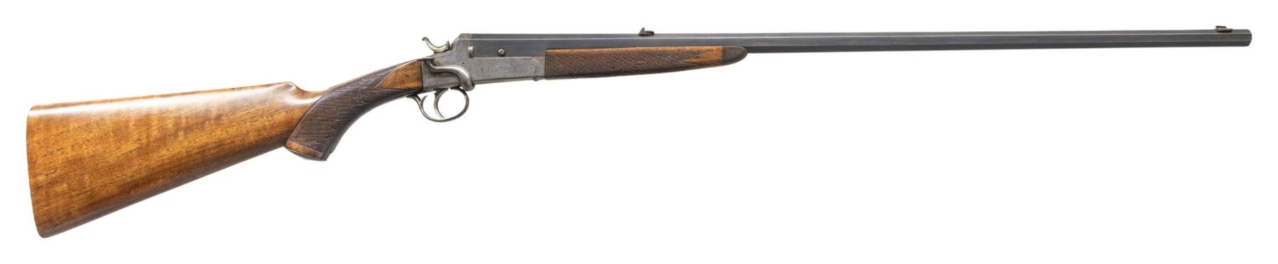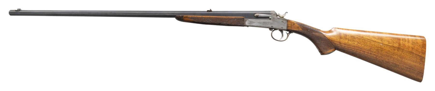 Cal. .250 Bore (297/250 Rook). S# 18857 (on triggerguard bow). Oct. 27" bbl. with matting on top of barrel. Bead front sight & 2 leaf folding rear sight. Side-lever action w/ acanthus scroll engraving. Walnut stock set w/ ebony forearm tip, steel pistol grip cap & grooved bare butt. CONDITION: dull fading blue mixing with brown patina. Receiver has gray patina appearance with light marks. Sanded & refinished wood shows sm. gouges to recut checkering & light marks. Dark bore with pitting. PROVENANCE: Estate of Groves Herrick. (25-5719/MD). CURIO. $500-800.