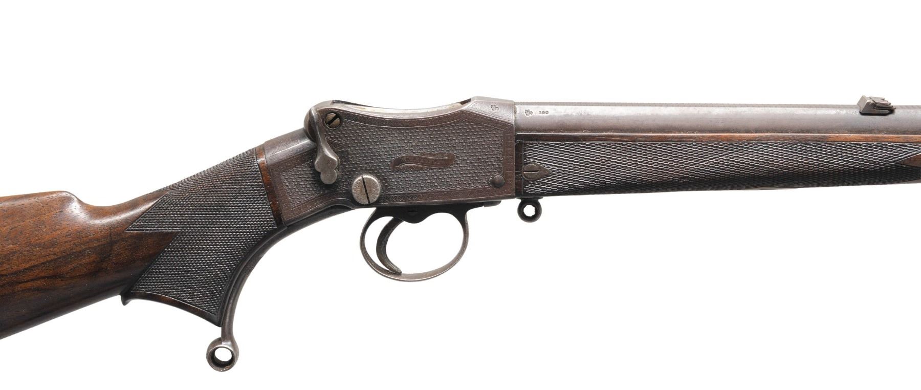 Cal. 297/250 Rook. S# 012645. Bbl. 26"; top of barrel is matted with London address. Blade front sight & 3 leaf rear sight. Martini style takedown action w/ curved opening lever & safety. Sides of action have deep relief basket weave style engraving with "W.W. GREENER" banner in center surrounded by geometric pattern borders. Checkered walnut stock set w/ ebony tip, pistol grip & trapdoor buttplate. CONDITION: barrel has traces of blue with balance of barrel have brown/gray patina appearance with oxidation. Balance of action has gray patina appearance with traces of blue & spots of corrosion. Fair wood finish with numerous dings & marks along with worn checkering to bottom of forearm. Good rifling with light pitting. PROVENANCE: Estate of Groves Herrick. (25-5723/MD). CURIO. $400-600.