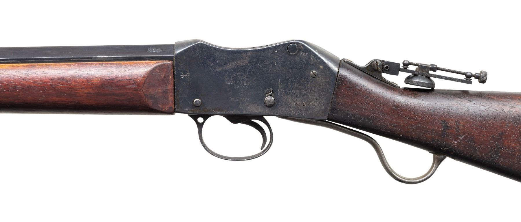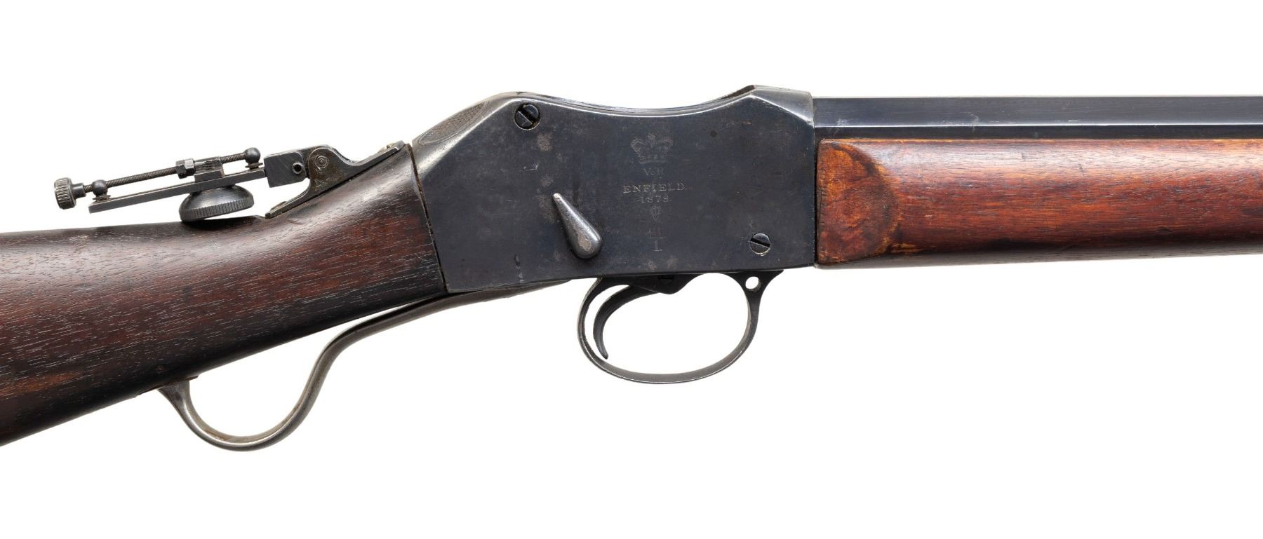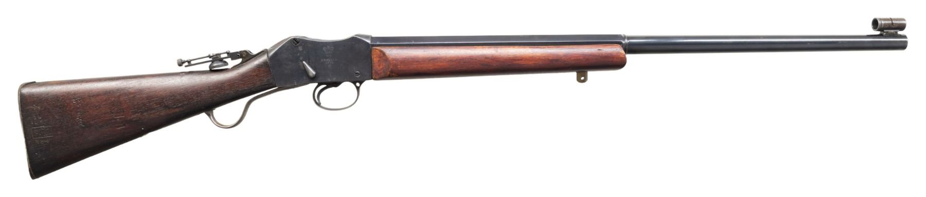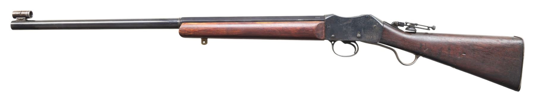 Cal. 45-70. S# 253. Bbl. 26" part-oct & part-rnd. Hawkins marked. Parker Hale FS21 front sight. Tang mounted aperture rear sight. Custom Martini Henry target rifle built using an 1879 dated Enfield MKIII action. Custom blue finish. British military butt stock & custom forend. Large brass front sling stud but no rear sling hardware present. CONDITION: stock set has a dark refinish appearance with some worn finish, some chipping around buttplate, some dings & handling marks. Metal retains 80% reblue with a couple tool marks on bbl., scattered fading to gray most notable on lever, scattered blued over pitting, handling marks, oxidation & edge wear. Action functions properly when hand cycled. Bore shows scattered oxidation & light pitting but strong rifling. PROVENANCE: From the Buckstix Collection. (01-28717/MJC). ANTIQUE. $600-900.