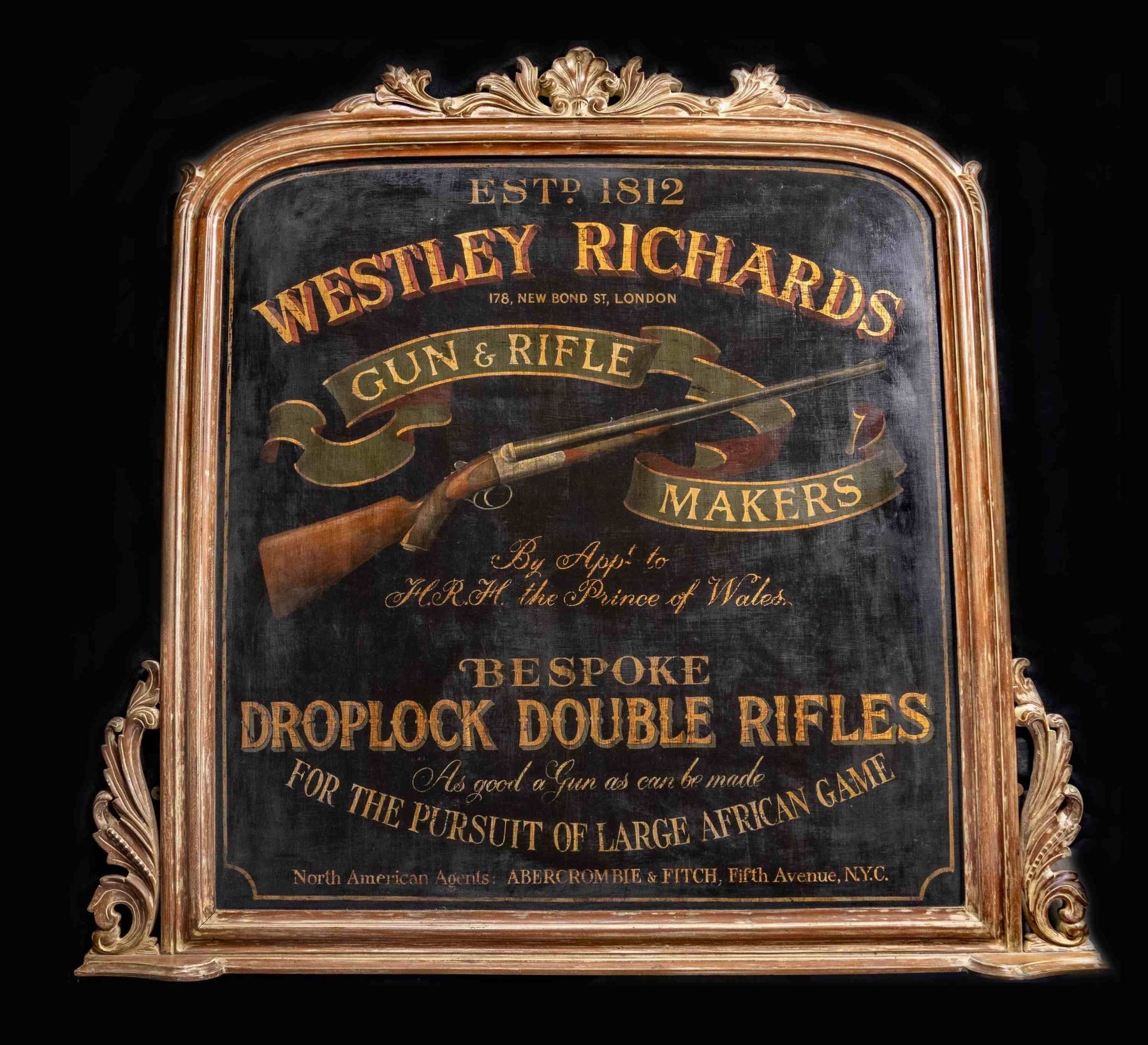 ADVERTISING SIGN. Reads "EST.d 1812" "WESTLEY RICHARDS" "178, NEW BOND ST. LONDON" "GUN & RIFLE MAKERS" "By Appt to" "H.R.H. the Prince of Wales" "BESPOKE" "DROPLOCK DOUBLE RIFLES" "As good a Gun as can be made" "FOR THE PURSUIT OF LARGE AFRICAN GAME" "North American Agents: ABERCROMBIE & FITCH, Fifth Avenue, N.Y.C.". The bold central figure is a wonderful representation of a Westley Richard double rifle. Sign is painted on old wood and is housed in large wooden frame on shelf with moulded edges having carved scrolls at base and along top. The octogenarian consignor of this lot was involved in African safaris from the middle part of the 20th century. Starting in Beina, Mozambique later Botswana. He was involved with Vira Safaris later lived in Zimbabwe and finally President of United African Safaris in U.A.S. Guine-Bissau and U.A.S. Mozambique. His ancestors came from South Coastal England and Ireland and were successful sing, truck and railway artist. This type of artist produced quality billboard signage from the 1870's to 1945. These large artistic billboard signs were painted of course only during the 6 fair weather months. The remaining months were spent painting decorative and commercial signage such as this example. While he was involved in the safari business, he acquired signs such as this one as a decoration for various African lodges. MEASUREMENTS: Sight size 41-1/2" x 43"/ 56" wide 53" high including frame. CONDITION: very fine and has a spectacular presence. (02-25764/JDJ). $2,000-4,000.