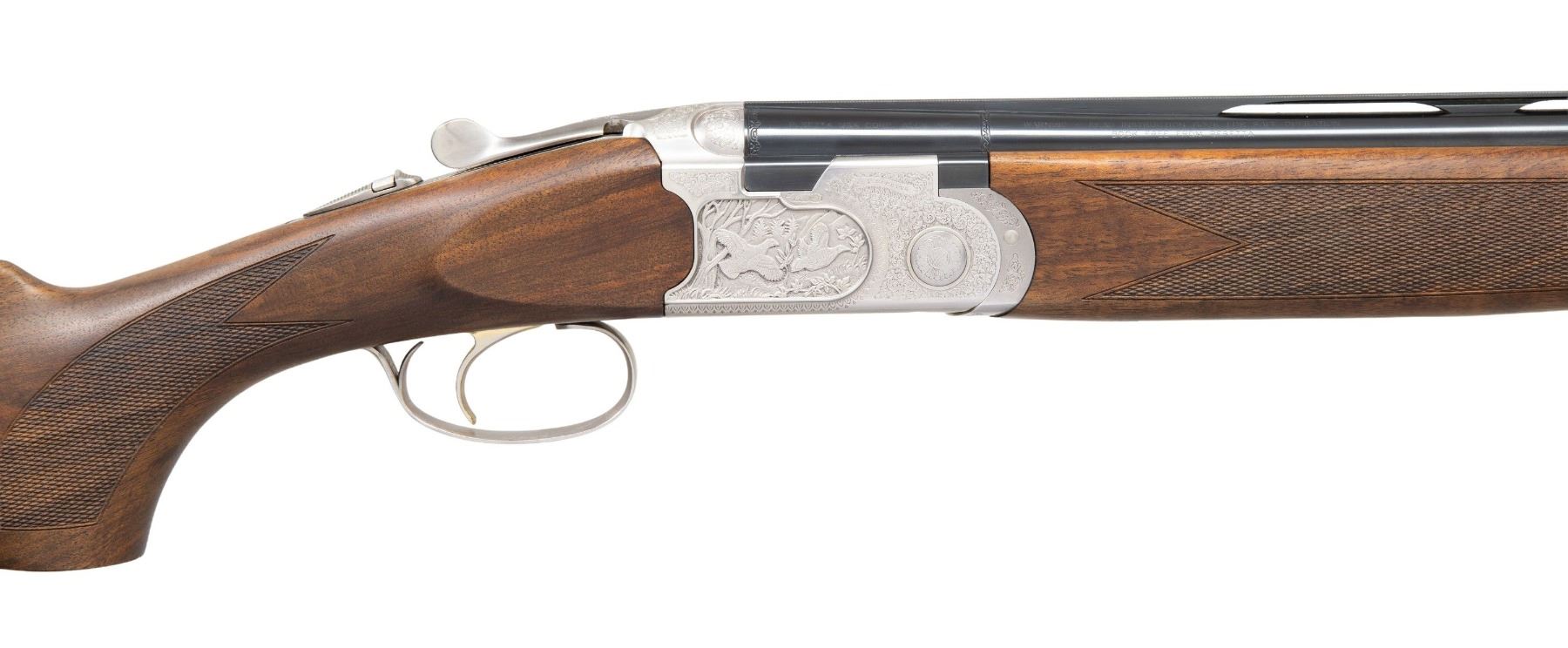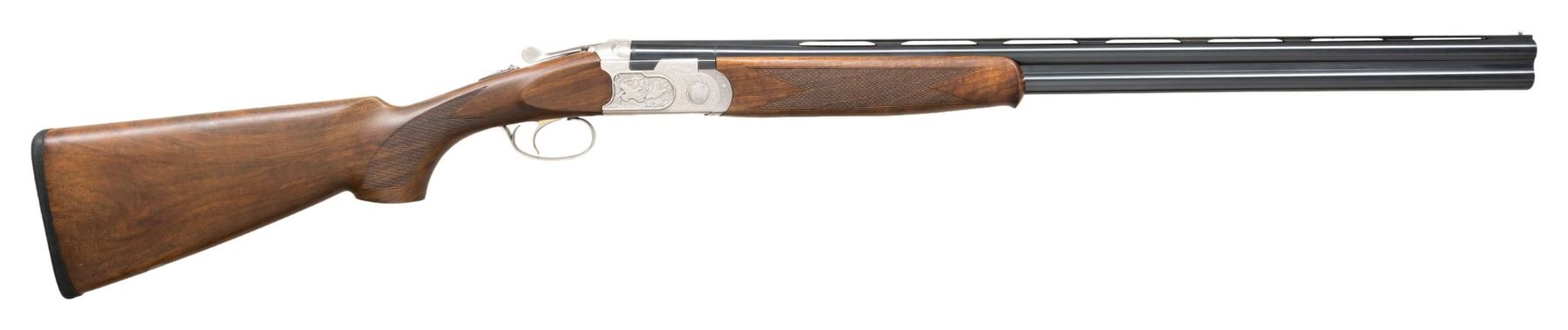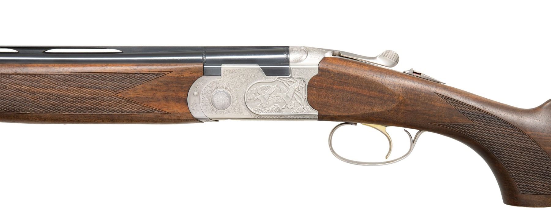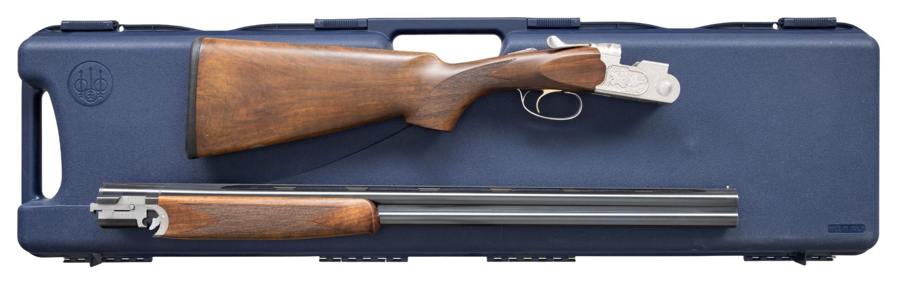 Cal. 20 Ga., 3". S# U21037B. Mfg. 2004. VR 26.5" bbls. w/ steel bead. Full set of 5 Mobilchoke tubes. Silver finished receiver has deep relief engraving of mallards on left side & pigeons on right side; balance of receiver has scroll engraving. Action features gold plated SST & ejectors. Checkered walnut stock set w/ schnabel forearm tip, pistol grip & oval toeplate. LOP: 14.5" to black pad. UNATTACHED ACCESSORIES: Beretta ABS case w/ manual, extra pad, oil, choke tubes, choke wrench & swivels. CONDITION: near excellent wood & metal finish w/ light muzzle wear & a couple of handling marks. Bores show light fouling. (25-6040/MD). MODERN. $2,000-3,000.