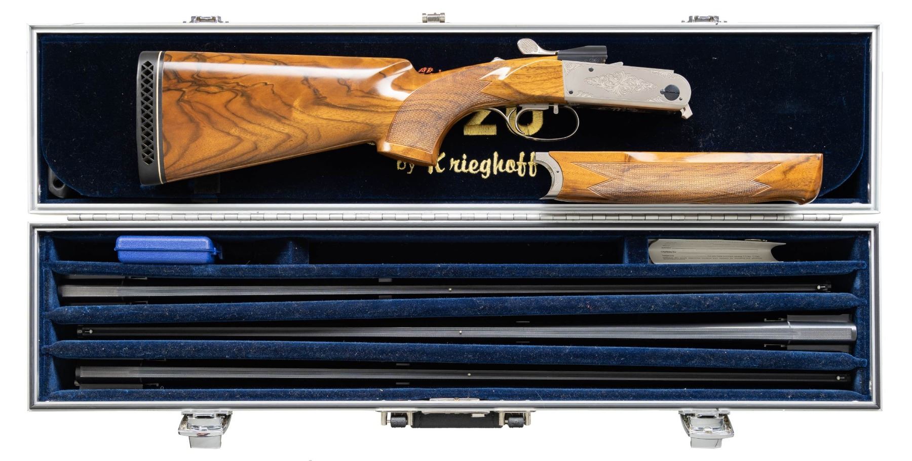 O/U SHOTGUN. Cal. 20 ga. / 28 ga. / 410 ga. All with 3" chambers. S# 020560. All barrel sets are 30" with interchangeable choke tubes, 3/8" vent ribs and open side ribs. White target front sights with steel mid beads. Satin nickel-plated receiver with blued hood has standard scroll engraving. SST. Selective ejectors and non-automatic safety. Schnable tipped forend and pistol grip stock of gloss finished Turkish walnut have point pattern hand checkering. LOP: 14 1/8" over an aftermarket black ventilated White Line pad. DAC: 1 3/8". DAH: 2". Stock has a near neutral cast. Weight with 410 barrels: 8 lbs, 1.4 oz. The K-20 sporting and field with compact 20 gauge frame featured the same technical refinements as the K80. 28 gauge and 410 barrel sets were sold separately, but require fitting. Importation began in 2000. UNATTACHED ACCESSORIES: Krieghoff aluminum three barrel set case with blue fitted interior. Case contains spare choke tubes. 410 and 28 gauge barrels have a total of five choke tubes. the 20 gauge barrels have a total of six choke tubes. Also included is a stock wrench, choke tube wrenches, a canister of grease, a fine bristle cleaning brush, warranty registration card and case keys. CONDITION: near excellent retaining virtually all metal finish. Original stock finish shows a few marks. Tight action. All bores are bright and near excellent. PROVENANCE: Estate of Lloyd Robinson. (25-6688/DS). MODERN. $12,000-17,000.
