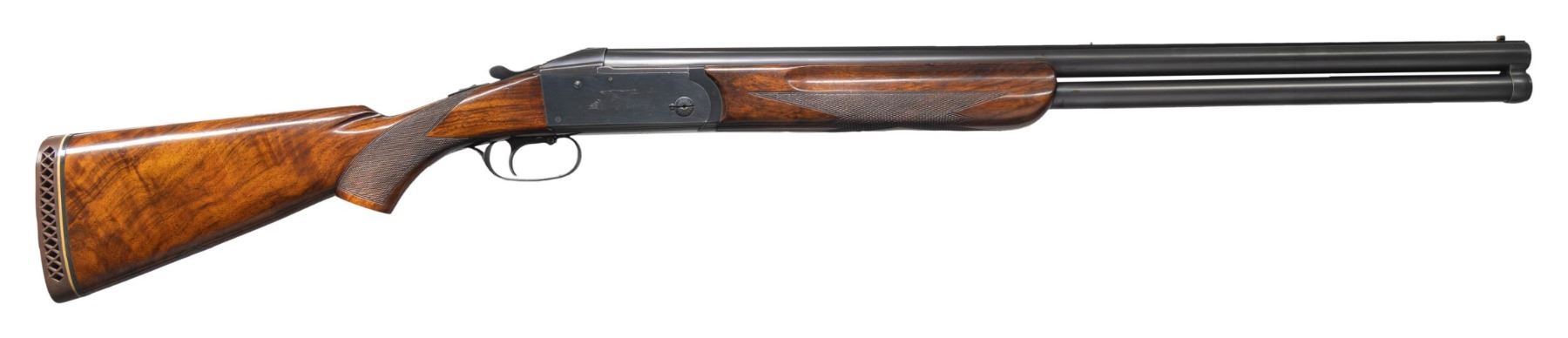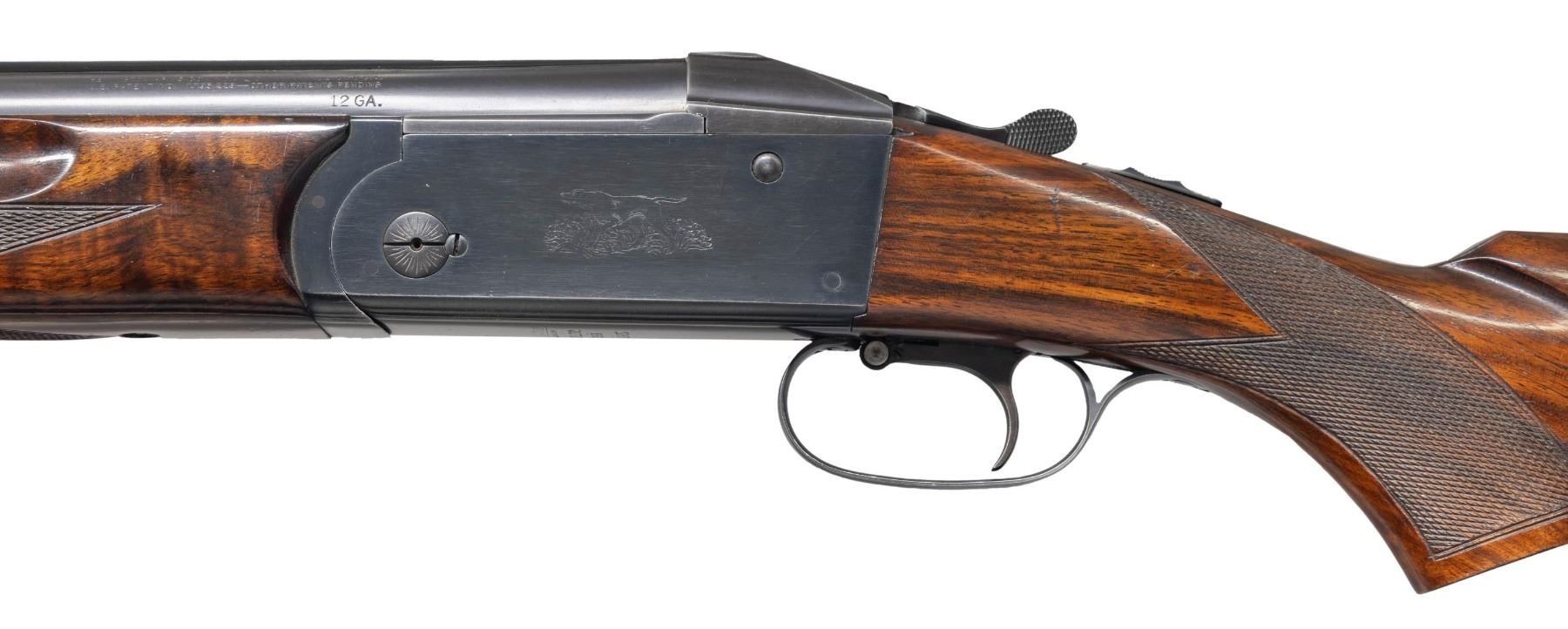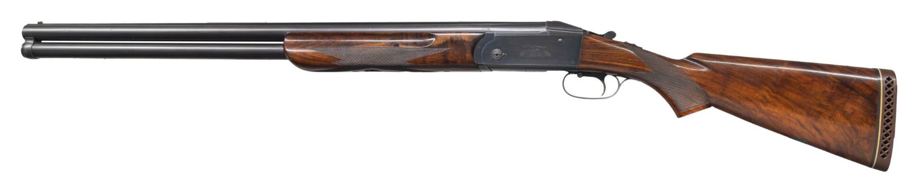 Cal. 12 ga. 2 3/4". S# 3360. Bbls. 26" with solid rib and fixed skeet in and skeet out chokes. Barrels are numbered to the gun. Blue finished action with pointing dogs on its sides. SST. Selective ejectors. Safety is blocked in off position. Forearm and pistol grip stock have point pattern hand checkering. Toeline of stock have oval silver nameplate. LOP: 13 15/16" over an aftermarket brown ventilated White Line pad. DAC: 11/16". DAH: 2 3/8". Neutral cast. WEIGHT: 7 lbs, 11 oz. CONDITION: 80% lightly worn blue showing carry and edge wear. Unsanded stocks have a light coat of added finish over scratches and marks. Sound action. Good bright bores. PROVENANCE: Estate of Lloyd Robinson. (25-6679/DS). MODERN. $1,500-2,000.