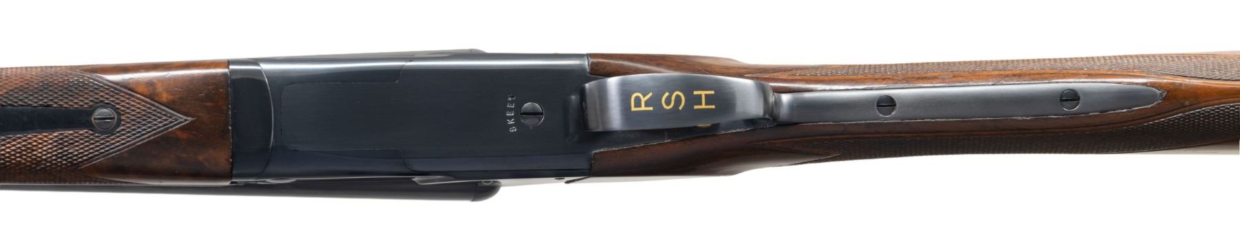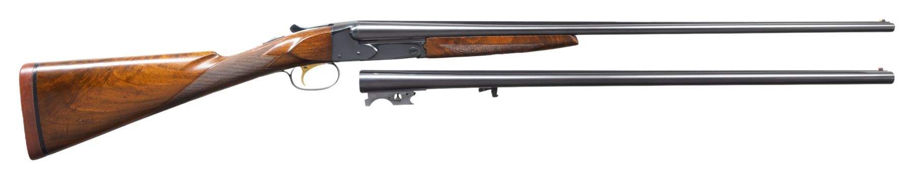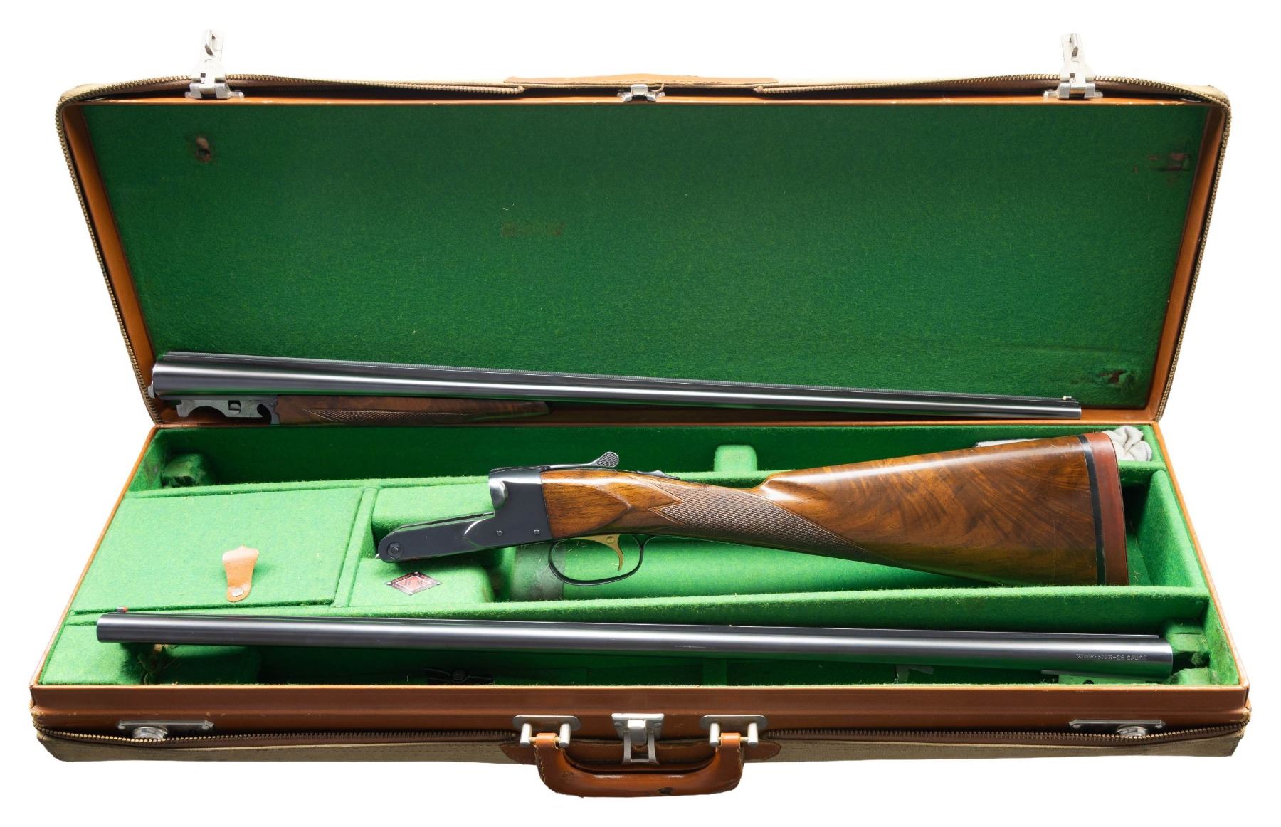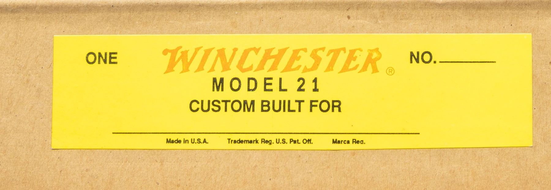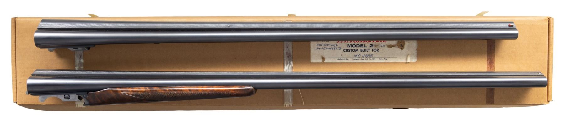SHOTGUN. Cal. 20 ga. / 28 ga. / 410 ga. S# 30865. All barrel sets are Winchester marked and serial numbered to the receiver. Bbls. Set 1: 410 with 3" chambers. 26" with IMP-CYL and MOD chokes. White target front sight. Includes a matching numbered splinter forearm. Inside of forearm iron is machine jeweled. Bbls. Set 2: 28 with 2 3/4" chambers. 26" with skeet and skeet chokes. Red target front sight with brass mid bead. Bbls. Set 3: 20 with 2 3/4" chambers. 28" with "WS-1" and "WS-2" chokes. Red target front sight with steel mid bead. Bbls. Set 4: 20 with 3" chambers. 30" with fixed full and full chokes. Steel front bead with matching numbered beavertail forearm. Blue finished action has gold finished single selective trigger. Selective ejectors. Floorplate is marked "SKEET". Trigger guard bow has gold inlaid initials "RSH". Straight grip stock of fancy walnut. LOP: 13 1/2" over a leather faced solid red pad. DAC: 1 5/8". DAH: 2 1/8". Neutral cast. UNATTACHED ACCESSORIES: leather covered case with metal reinforced corners and green felt fitted two barrel set interior. Lid of case and canvas cover have leather nameplates marked "R.S. HEALY". Both sets of 20 gauge barrels are in a Winchester Model 21 barrel box marked "CUSTOM BUILT". Also included is a Winchester box with Model 21 Custom Built label having no gauge or serial number markings. CONDITION: receiver retains 98% nicely reblued finish. 28" 20 gauge barrels show light carry wear. The other three barrel sets have near excellent blue. All bores are very good and bright. The stock has moderately worn finish showing numerous scratches and marks with a small repair at top of right ear. Beavertail forearm has numerous scratches and marks. Splinter forearm has good finish showing a couple of small marks. Action is tight and on face. PROVENANCE: Estate of Lloyd Robinson. (25-6690/DS). CURIO. $15,000-25,000.