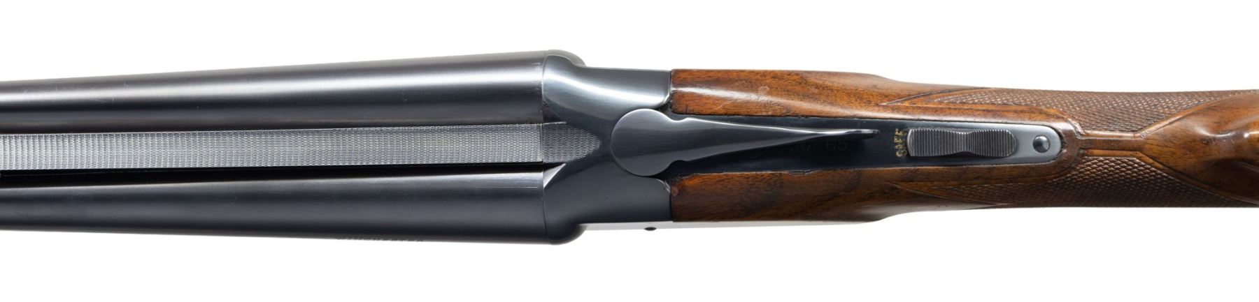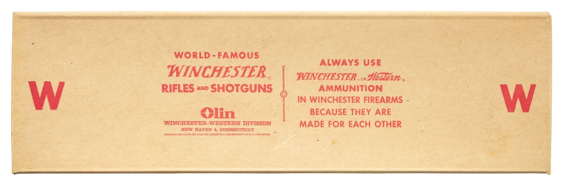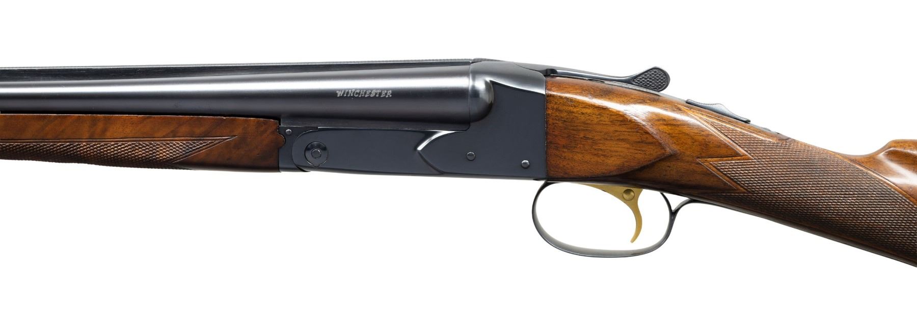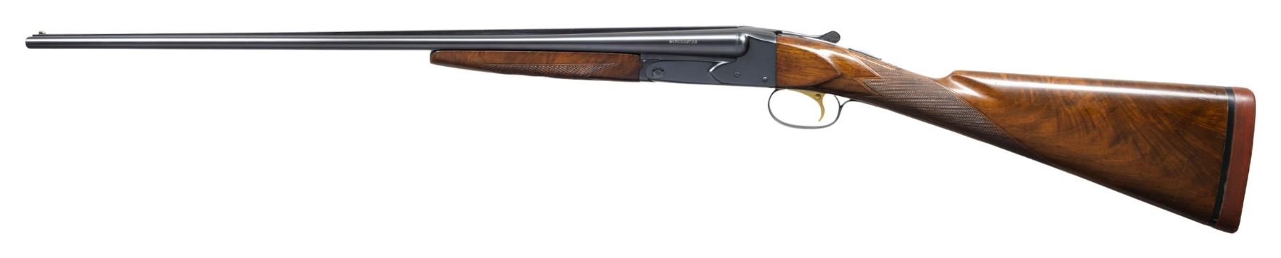 SHOTGUN. Cal. 20 ga. / 28 ga. / 410 ga. S# 30865. All barrel sets are Winchester marked and serial numbered to the receiver. Bbls. Set 1: 410 with 3" chambers. 26" with IMP-CYL and MOD chokes. White target front sight. Includes a matching numbered splinter forearm. Inside of forearm iron is machine jeweled. Bbls. Set 2: 28 with 2 3/4" chambers. 26" with skeet and skeet chokes. Red target front sight with brass mid bead. Bbls. Set 3: 20 with 2 3/4" chambers. 28" with "WS-1" and "WS-2" chokes. Red target front sight with steel mid bead. Bbls. Set 4: 20 with 3" chambers. 30" with fixed full and full chokes. Steel front bead with matching numbered beavertail forearm. Blue finished action has gold finished single selective trigger. Selective ejectors. Floorplate is marked "SKEET". Trigger guard bow has gold inlaid initials "RSH". Straight grip stock of fancy walnut. LOP: 13 1/2" over a leather faced solid red pad. DAC: 1 5/8". DAH: 2 1/8". Neutral cast. UNATTACHED ACCESSORIES: leather covered case with metal reinforced corners and green felt fitted two barrel set interior. Lid of case and canvas cover have leather nameplates marked "R.S. HEALY". Both sets of 20 gauge barrels are in a Winchester Model 21 barrel box marked "CUSTOM BUILT". Also included is a Winchester box with Model 21 Custom Built label having no gauge or serial number markings. CONDITION: receiver retains 98% nicely reblued finish. 28" 20 gauge barrels show light carry wear. The other three barrel sets have near excellent blue. All bores are very good and bright. The stock has moderately worn finish showing numerous scratches and marks with a small repair at top of right ear. Beavertail forearm has numerous scratches and marks. Splinter forearm has good finish showing a couple of small marks. Action is tight and on face. PROVENANCE: Estate of Lloyd Robinson. (25-6690/DS). CURIO. $15,000-25,000.