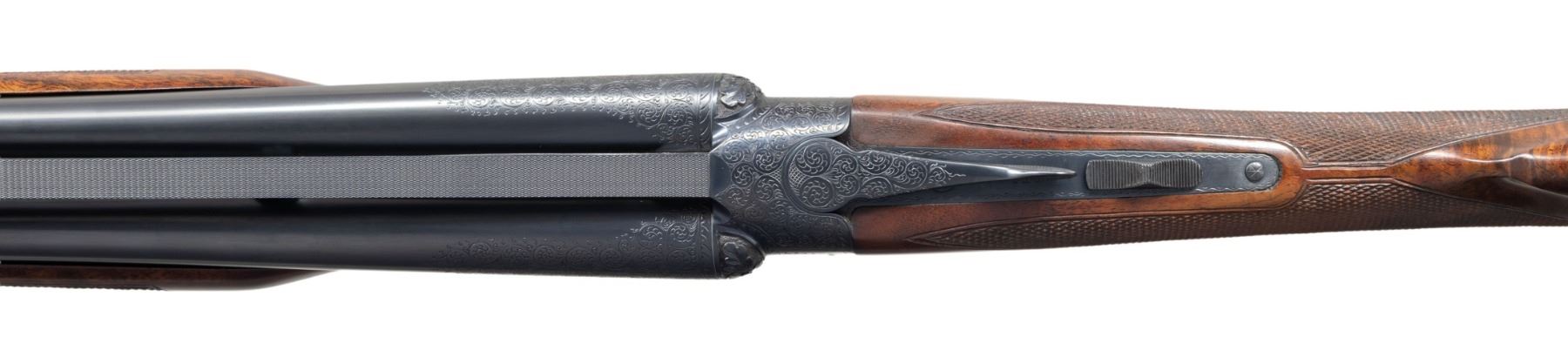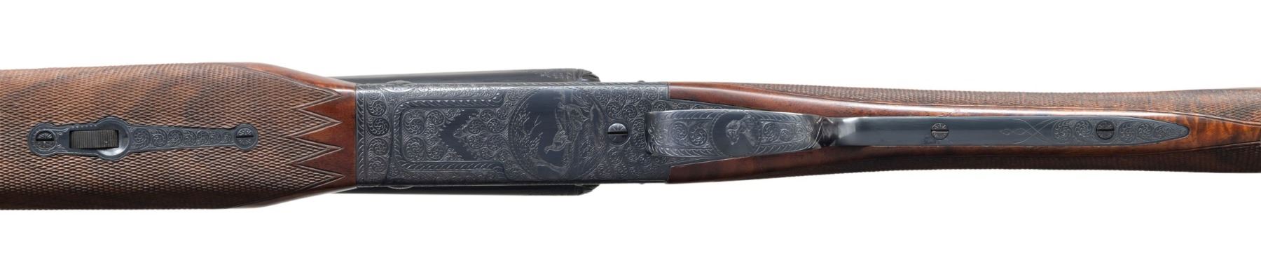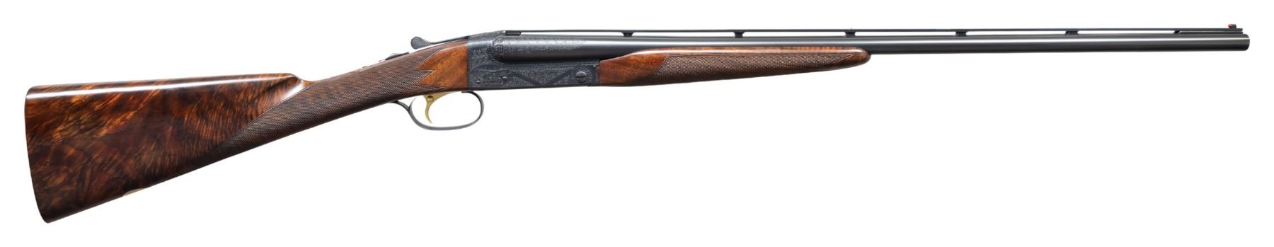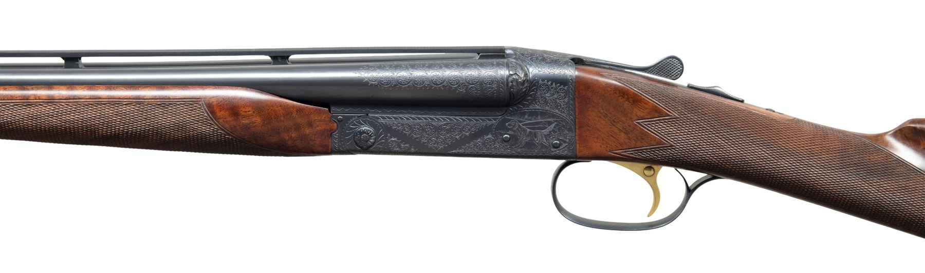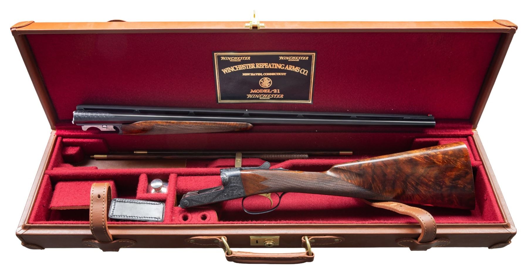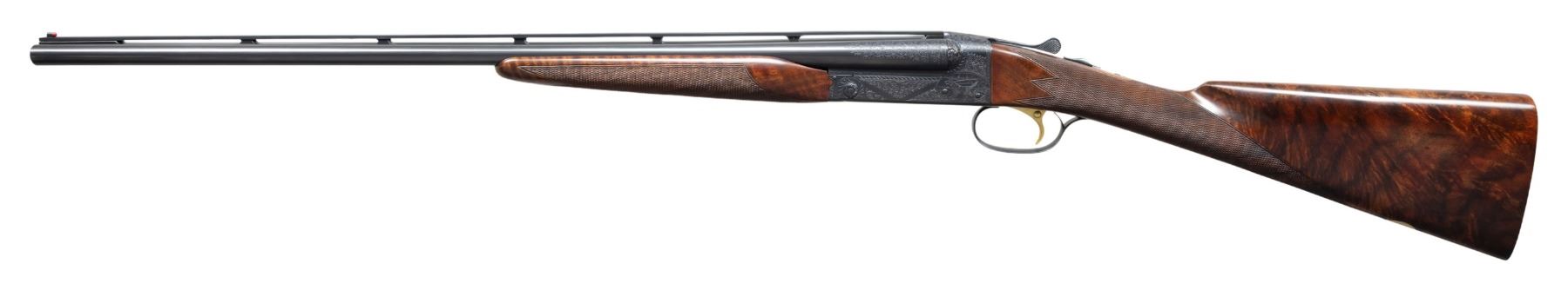 ENGRAVED SXS SHOTGUN. Cal. 28 ga. 2 3/4". S# W38126. Bbls. 26" vent rib with fixed "WS-1" and "WS-2" chokes. Red target front sight with white mid bead. Flat side action with full coverage No.6 flowing scroll engraving featuring scenes of pointing dogs on both sides with pheasants of the floorplate and a dog portrait on the trigger guard bow. Bolsters have deep oak leaf carving. Complimentary engraving extends to breech end of barrels and forearm iron. Inside of forearm and barrel lug areas have fine machine jeweled finish. Gold finished single selective trigger. Selective ejectors. Beavertail forearm with ebony insert and straight grip stock of fancy walnut with extensive point pattern hand checkering. Toeline of stock has oval presentation plate. LOP: 13 7/8" to a checkered butt. DAC: 1 5/8". DAH: 2". Stock has a slight cast on. WEIGHT: 6 lbs, 7 oz. One of America's premier gunmakers, the Connecticut Shotgun Manufacturing Company, purchased the manufacturing right for the Model 21 from Winchester and continues to make this iconic shotgun to this very day. UNATTACHED ACCESSORIES: leather covered luggage case in excellent condition. Red felt fitted interior. Case lid has black and gold Winchester Repeating Arms Model 21 label. Case contains two piece cleaning rod, cleaning accessories, nickel finished oil bottle and case key. CONDITION: near new retaining virtually all wood and metal finish. Bright near excellent bores. PROVENANCE: Estate of Lloyd Robinson. (25-6658/DS). CURIO. $12,000-18,000.
