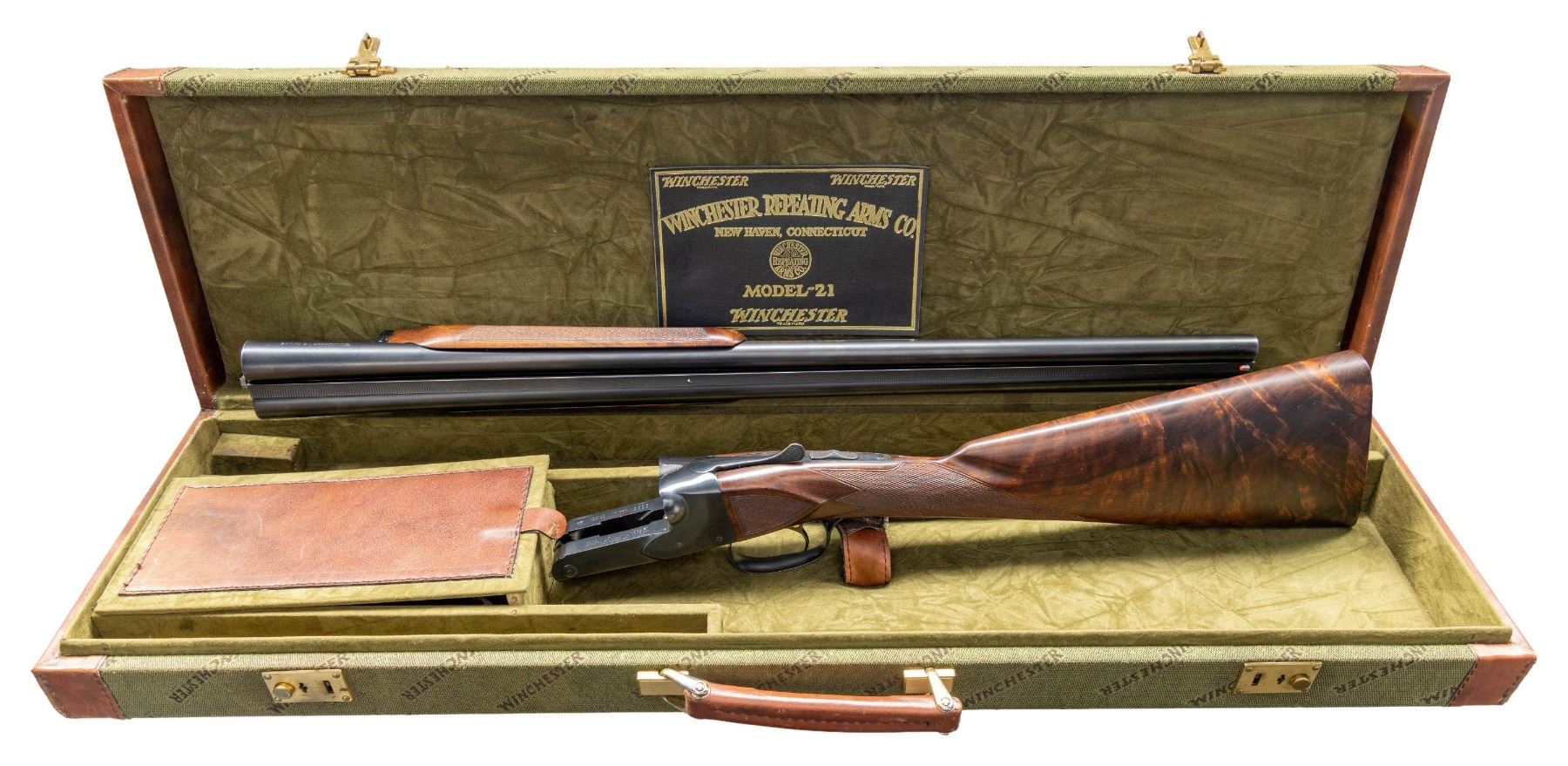 Cal. 16 ga. 2 3/4". S# 7068. Bbls. 26" with red target front sight and steel mid bead. Fixed "WS-1" and "WS-2" skeet chokes. Single selective trigger. Selective ejectors. Floorplate is marked "TRAP" above the screw and "SKEET" below it. Beavertail forearm with kidney pattern checkering and straight grip stock of fancy walnut with point pattern hand checkering with additional checkering on the stock ears. LOP: 13 5/8" to a checkered butt. WEIGHT: 6 lbs, 9 oz. UNATTACHED ACCESSORIES: green canvas covered Winchester marked case with leather trim for a Model 23 shotgun. Green fitted felt interior has an added black and gold Winchester Model 21 label. Case contains two keys. CONDITION: nicely restored gun. Action retains 99% reblued finish. Original barrel finish shows light wear at muzzle and breech ends. Refinished forearm shows two scrapes in the right side checkering with a large added wood repair chip at the tip. Refinished buttstock has freshened checkering. Tight sound action with top lever sitting right of center. Very good bright bores. PROVENANCE: Estate of Lloyd Robinson. (25-6661/DS). CURIO. $3,000-4,500.
