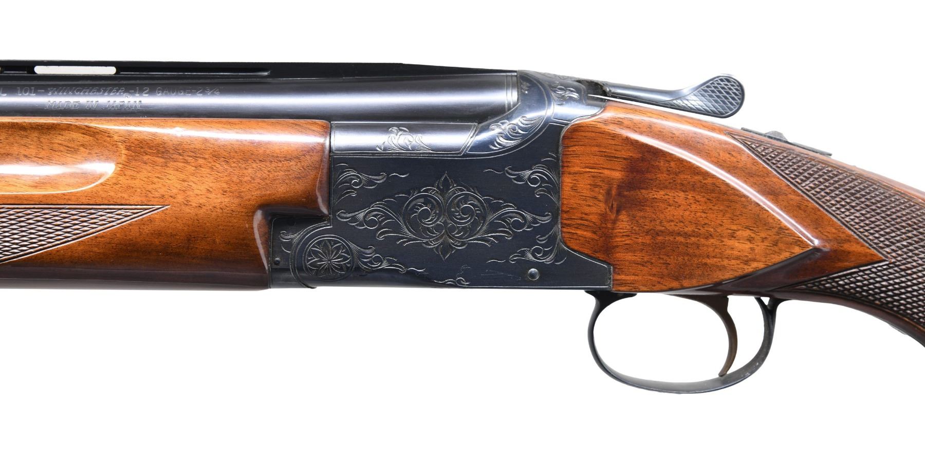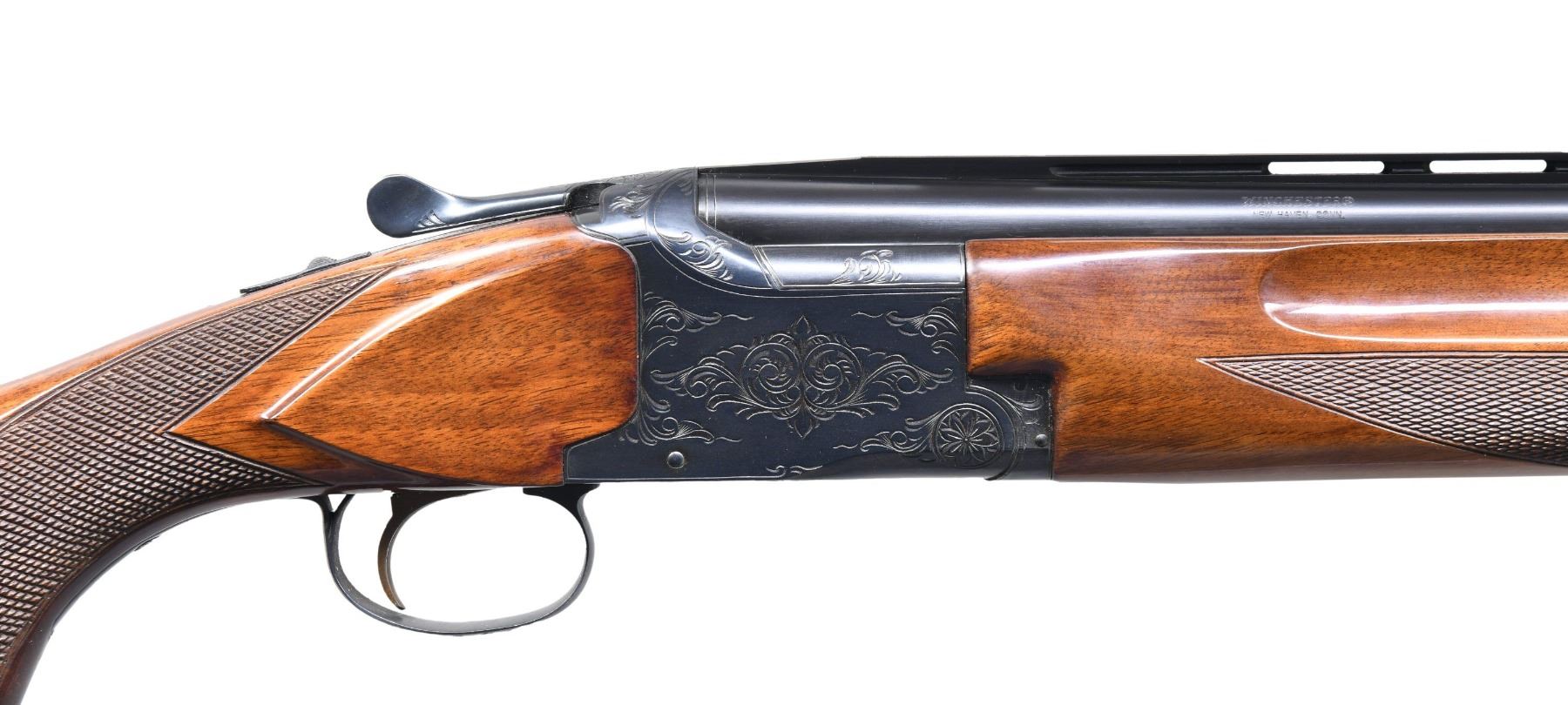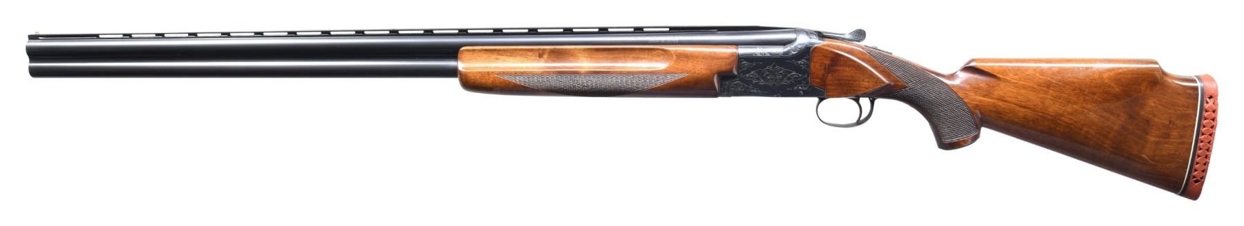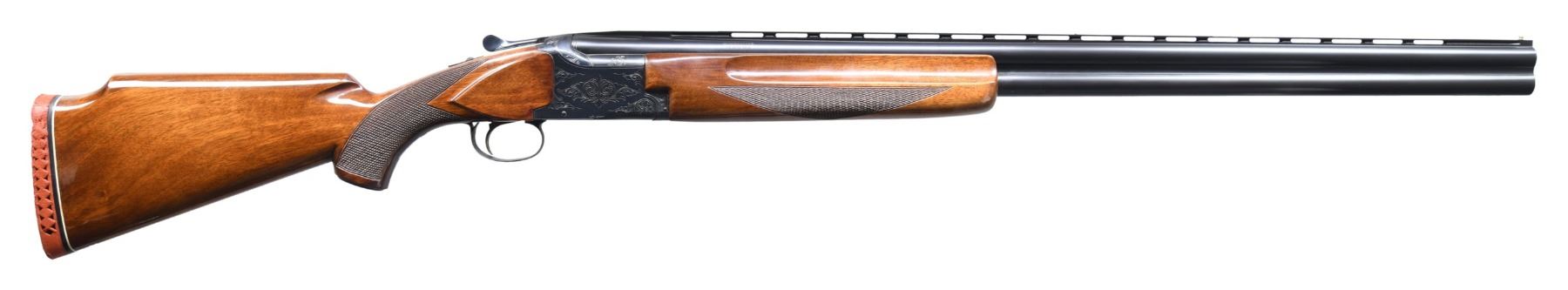 Cal. 12 ga. 2 3/4". S#. K123146. Bbls. 30" vent rib w/ steel front & mid beads. Fixed Full & Full chokes. Blued boxlock action features scroll ornamentation, ejectors & single selective trigger. Finger groove walnut forend & Monte Carlo trap stock w/ steel grip cap, cut checkering & gloss finish. LOP. 14 1/4" over original red ventilated Winchester pad. Mfg. 1969. CONDITION. very good retaining over 98% blue. Original stock finish shows a few small marks. Original recoil pad is age hardened & crushed. Bright near excellent bores. PROVENANCE: Estate of Russell Dickerman. (25-1931/DS). CURIO. $500-800.
