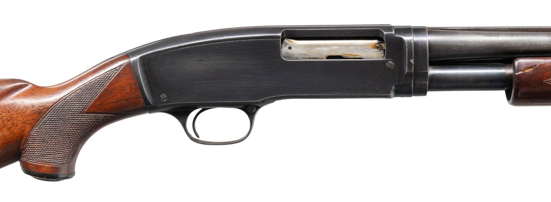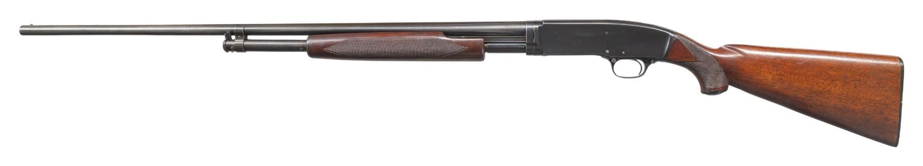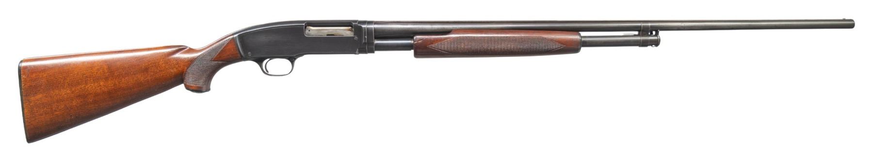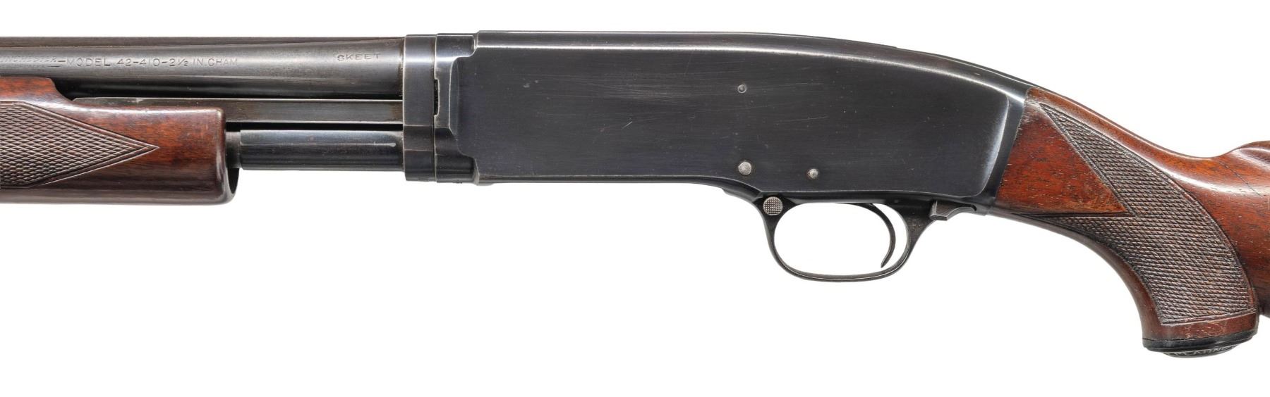 GRADE PUMP SHOTGUN. Cal. 410. 2 1/2". S# 84691. Bbl. 28" with solid rib and steel bead. Left side of the barrel is marked "410-2 1/2' chamber" followed by "SKEET" choke marking. Beavertail forearm and hard rubber capped pistol grip stock with standard skeet grade checkering and original buttplate. Mfg. 1949. CONDITION: 70% blue showing carry and handling wear with spots of very light pitting. Wood has lightly worn finish and checkering showing dents and marks. Forearm has a glued chip on rear of left side. Sound mechanics. Good bright bore. PROVENANCE: Estate of Lloyd Robinson. (25-6648/DS). CURIO. $4,500-6,500.