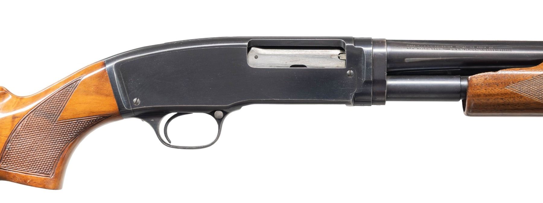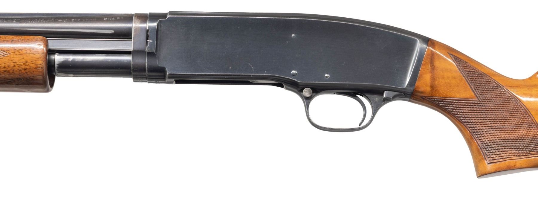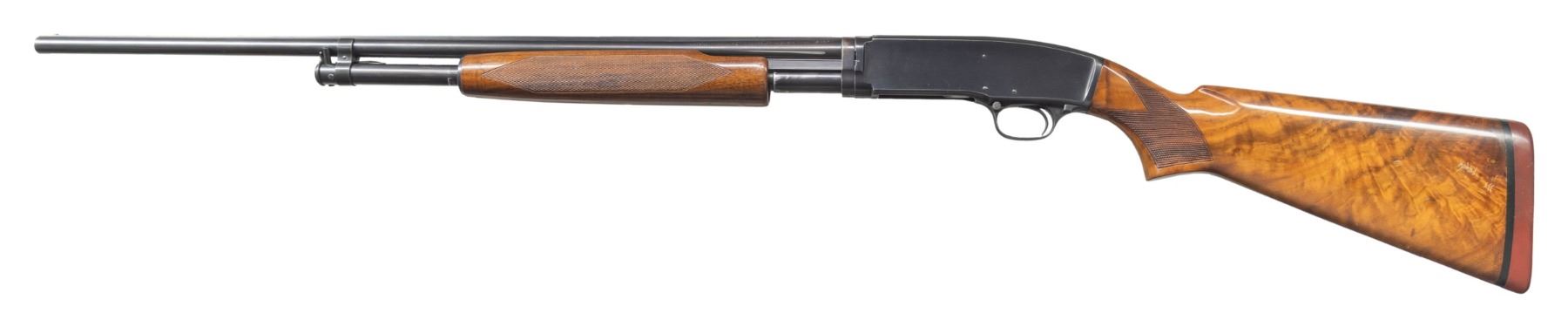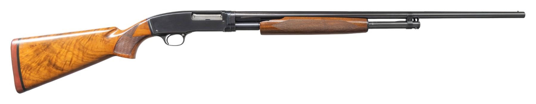 PUMP SHOTGUN. Cal. 410.-2 1/2". S# 39149. Bbl. 26" with solid rib and steel bead. Left side of barrel is marked "410 2 1/2" chamber" followed by Skeet choke marking. Blue finish. Original beavertail forearm with standard skeet pattern and checkering. Replacement stock of fancy walnut with skeet style hand checkering. LOP: 14 3/16" over a Noshoc solid red pad. Mfg. 1940. CONDITION: 80% lightly faded blue showing carry and edge wear. Forearm has lightly worn original finish missing a large chip at the rear of the right side. Replacement stock shows crazing finish with series of small dents on the left side. Sound action. Very good bright bore. PROVENANCE: Estate of Lloyd Robinson. (25-6650/DS). CURIO. $3,000-4,000.