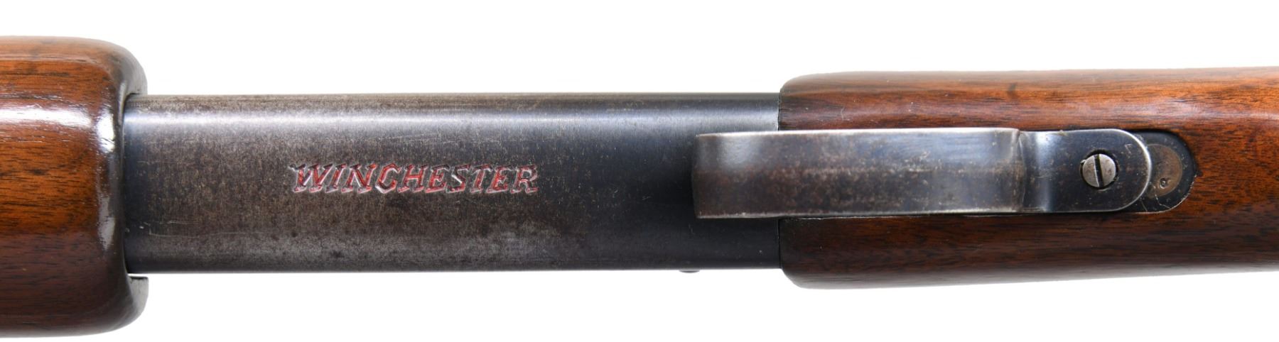 SHOTGUN. Cal. 28 GA, 2 7/8". NSN. Bbl. 28". Model 37 "Red Letter" single shot shotgun mfg. by Winchester between 1936-1963. Left side of the bbl. is marked with Winchester's mfg. information, followed by the model and cal. designations above "MOD", and the Winchester trademark logo, with "2 7/8" marked towards the breech. Underside of the receiver is marked with the Winchester trademark logo in red characters .Metal components exhibit a blue finish overall. Plain wood pistol grip buttstock and forend have been lightly sanded and revarnished at one time. Aluminum bead front sight. CONDITION: receiver retains large amounts of its original factory blue finish, exhibiting areas of wear and thinning that show through to gray patina, with scattered spots of light to mild pitting present overall. Bbl. exhibits areas of thinning that show through to brown patina. Mirror bore, exhibiting several scratches throughout. Wood furniture shows scattered marks and impressions from handling and storage, with a small repair present on the top of the wrist. PROVENANCE: Estate of Russell Dickerman. (25-1913/MLW). CURIO. $500-800.