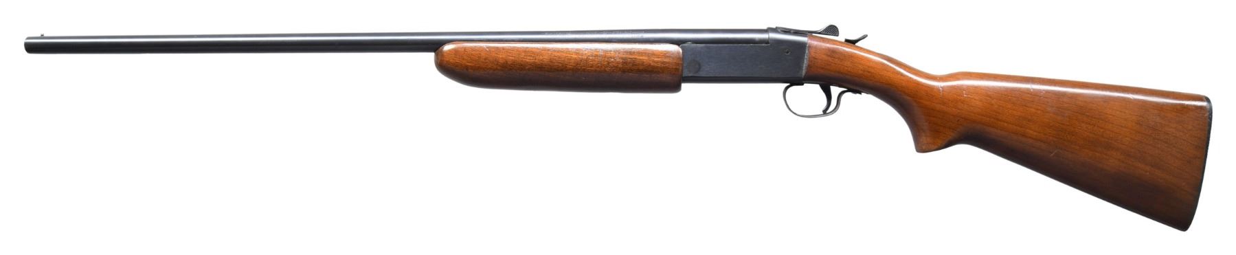 Cal. 410, 3". NSN. Bbl. 26". Model 37 single shot shotgun mfg. by Winchester between 1936-1963. Left side of the bbl. exhibits standard factory markings, with "MADE IN U.S.A." appearing to have been poorly stamped below the Winchester trademark logo. Metal components exhibit a blue finish overall. Plain wood pistol grip buttstock and forend appear to have been sanded and revarnished. Aluminum bead front sight. CONDITION: metal components retain the vast majority of their original factory blue finish, exhibiting a few small spots of light wear and thinning, as well as scattered spots of light surface oxidation overall. Mirror bore. Wood furniture shows scattered marks and impressions from handling and storage, with a crack present on the right side of the forend, which is mostly only visible from the top. PROVENANCE: Estate of Russell Dickerman. (25-1916/MLW). CURIO. $300-500.