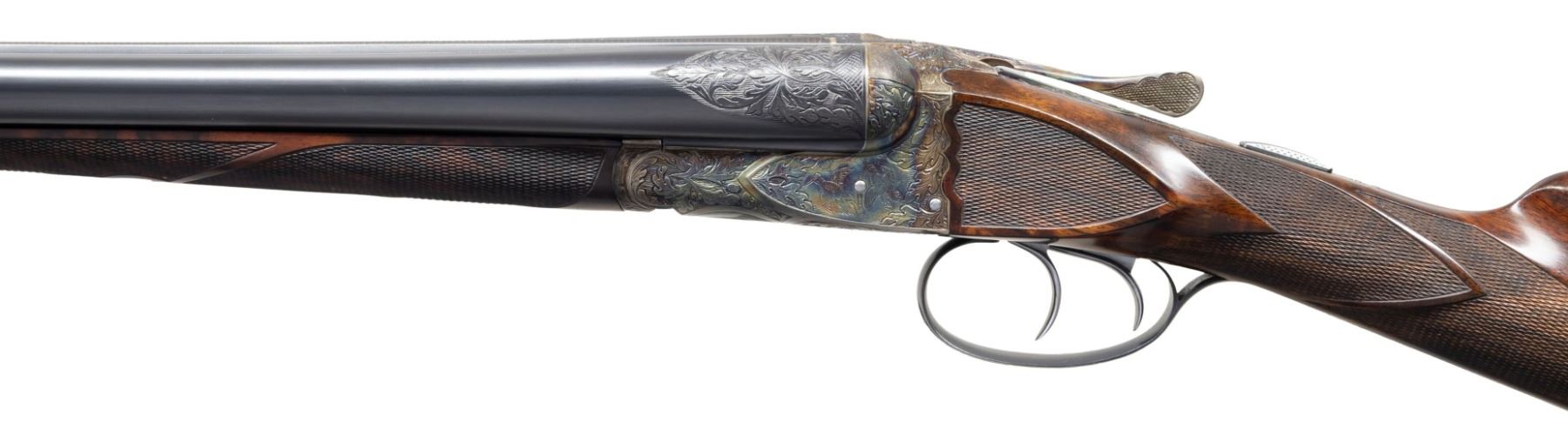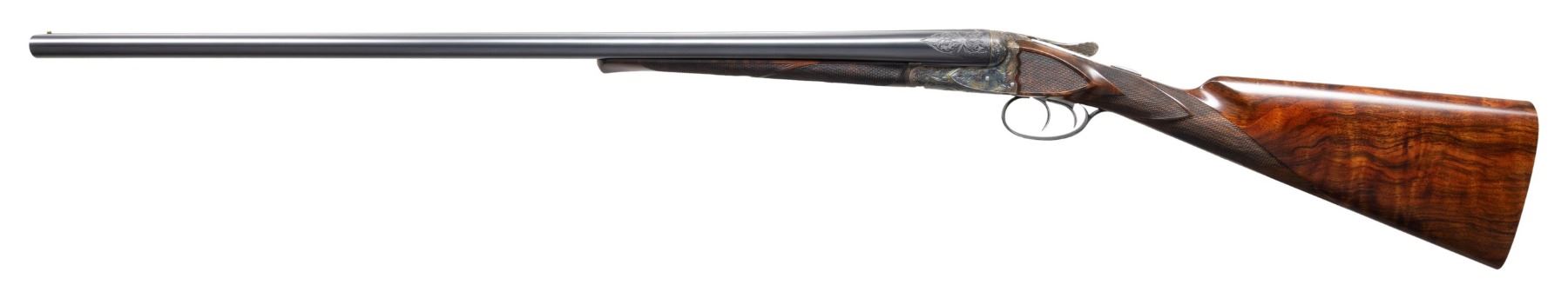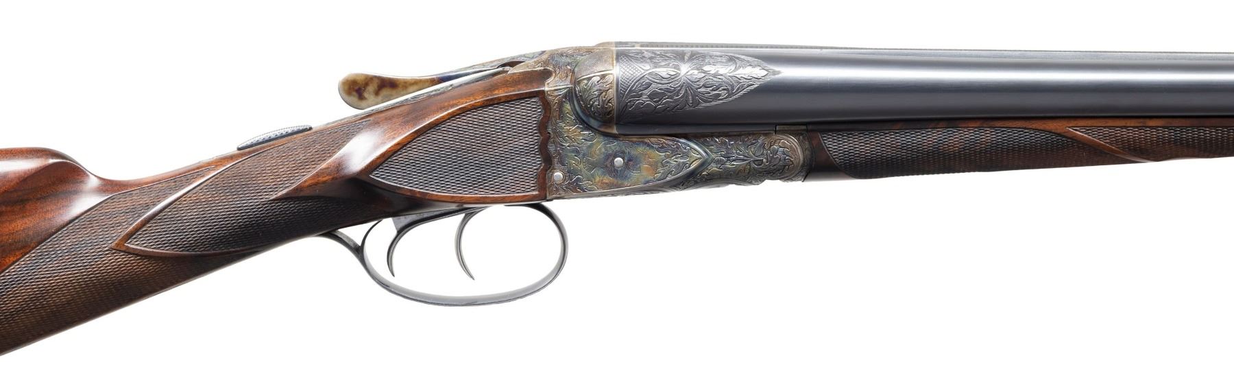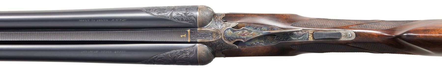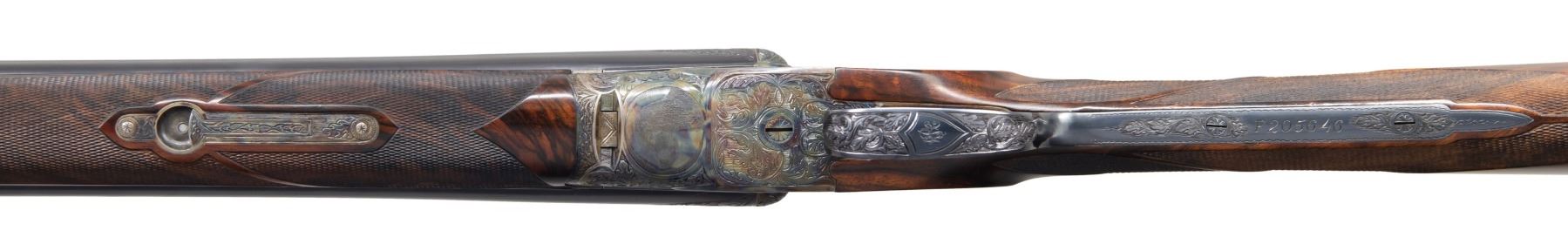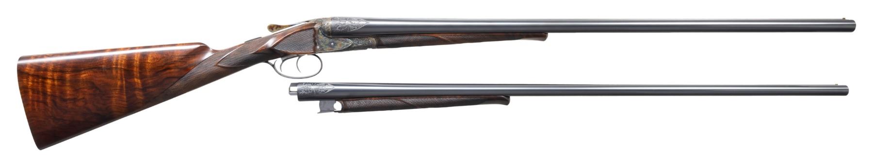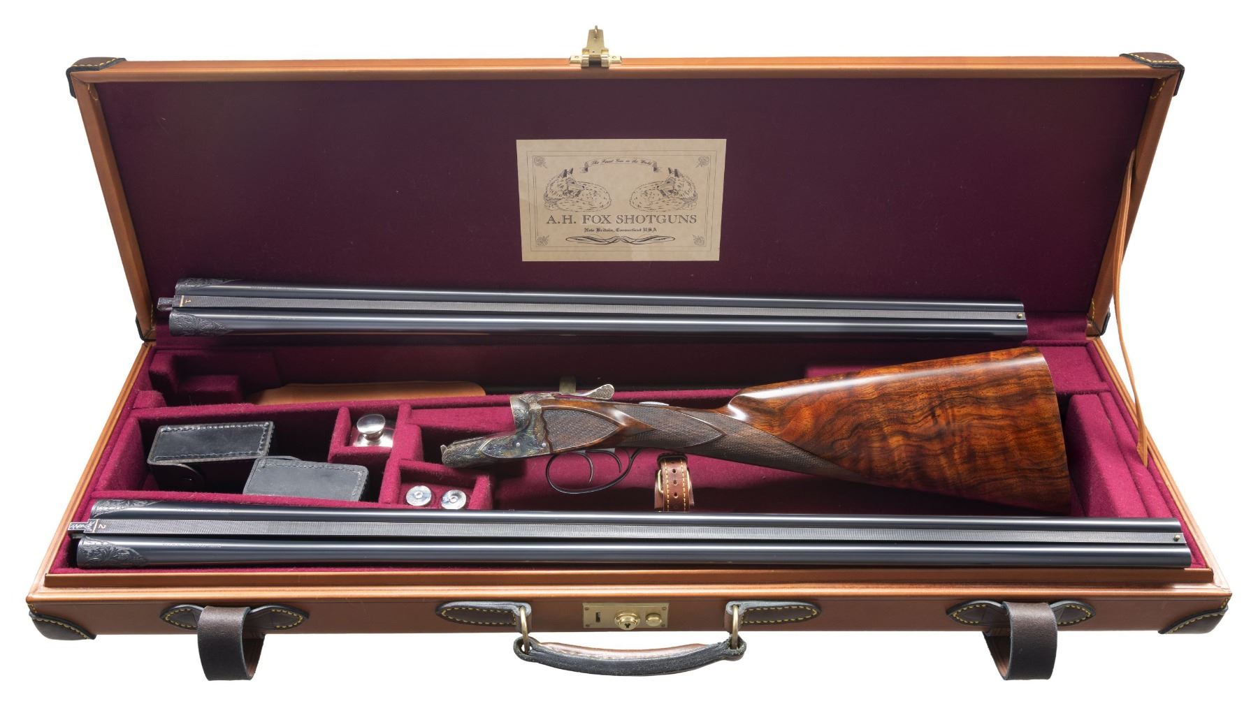 Cal. 28 Ga./20 Ga. S# F205646. This finely made gun has two sets of barrels with set gold "1" 20 gauge, 28". Gold "2" 28 gauge, 30" both with matted game ribs with tops of barrels engraved "MADE TO ORDER" "A.H. FOX" " CHROMOX FLUID STEEL". Breech ends are engraved with 2" triangles of flowing oak leaves. Bottoms of barrels are marked with grade, chamber info, S# and "Fox Proof". Loops are stamped with maker's info. Case hardened, small size, double ogee back Fox action with classic rotary bolt, features automatic safety ("SAFE" inlaid in gold) and double triggers. Action is engraved in classic "XE" style with flowing oak leaves surrounding game scenes on sides with a pair of woodcock on left and ruffed grouse on right. Bottom of action has portrait of a spaniel. Trigger plate with matching oak leaves and acrons is engraved "ANSLEY H. FOX" around mounting screw. Blued trigger guard with more oak leaves has engraved monogram "PCP" on bow; S# is on tang. Finely marbled and nicely flame fiddle figured European walnut straight grip buttstock measures 14-1/2" over checkered wood butt. Side panels are checkered and grip checkering has ribbons through pattern. Matching splinter ejector forends are gold inlaid "1" & "2" matching barrels on interior of irons which are also stamped with patent dates. Forends have inlaid ebony schanabled tips and usual Fox Deeley type releases. MEASUREMENTS: BBLS: #1- 20 Ga. Bore Diameter: L .617. R .617. Restriction: L .003 (IC). R .007 (IC). Wall thickness: L .040. R .040. STOCK: DAH: 2". DAC: 1-5/16". CAST: about 1/4" on. LOP: 14-1/2". WEIGHT: 5 lb. 14 oz. BBLS: #2 - 28 Ga. Bore Diameter: L .545. R .550. Restriction: L .028 (full). R .030 (full). Wall thickness: L .030. R .029. STOCK: DAH: 2-1/8". DAC: 1-5/8"+. CAST: about 1/4" on. LOP: 14-1/2". WEIGHT: 5 lb. 10 oz. UNATTACHED ACCESSORIES: gun and extra barrels are housed in high quality leather case with stitched leather corners lined in burgundy cloth. A Fox label is in lid. Case contains brass and rosewood cleaning rod, with mop, brush and jag for each gauge in black leather wallets. A square oil bottle and a pair of 20 gauge snap caps are also included. CONDITION: very fine; close to "as new" with only some high edge wear evident on metal finishes along with a very few minor marks. Stocks also very fine with some scattered marks mostly on left side of butt. Bores are bright and shiny throughout without noted problems. Action is tight. Mechanically fine. Case is very fine with only a few minor marks in leather. Interior very clean "near new". (25-5792/MGM). MODERN. $19,000-24,000.