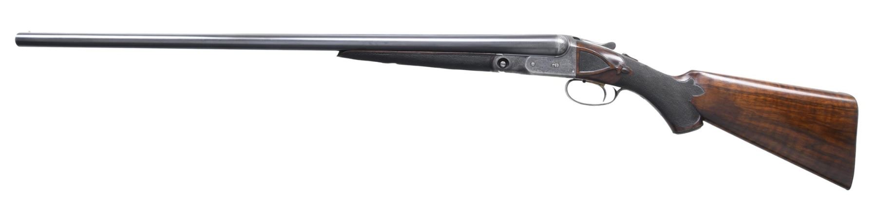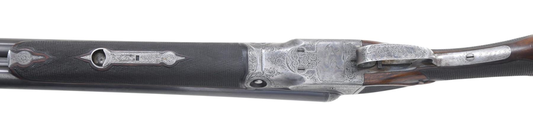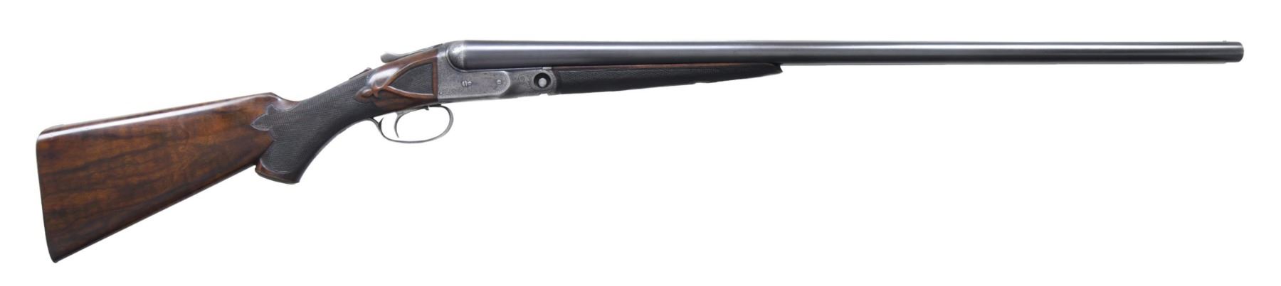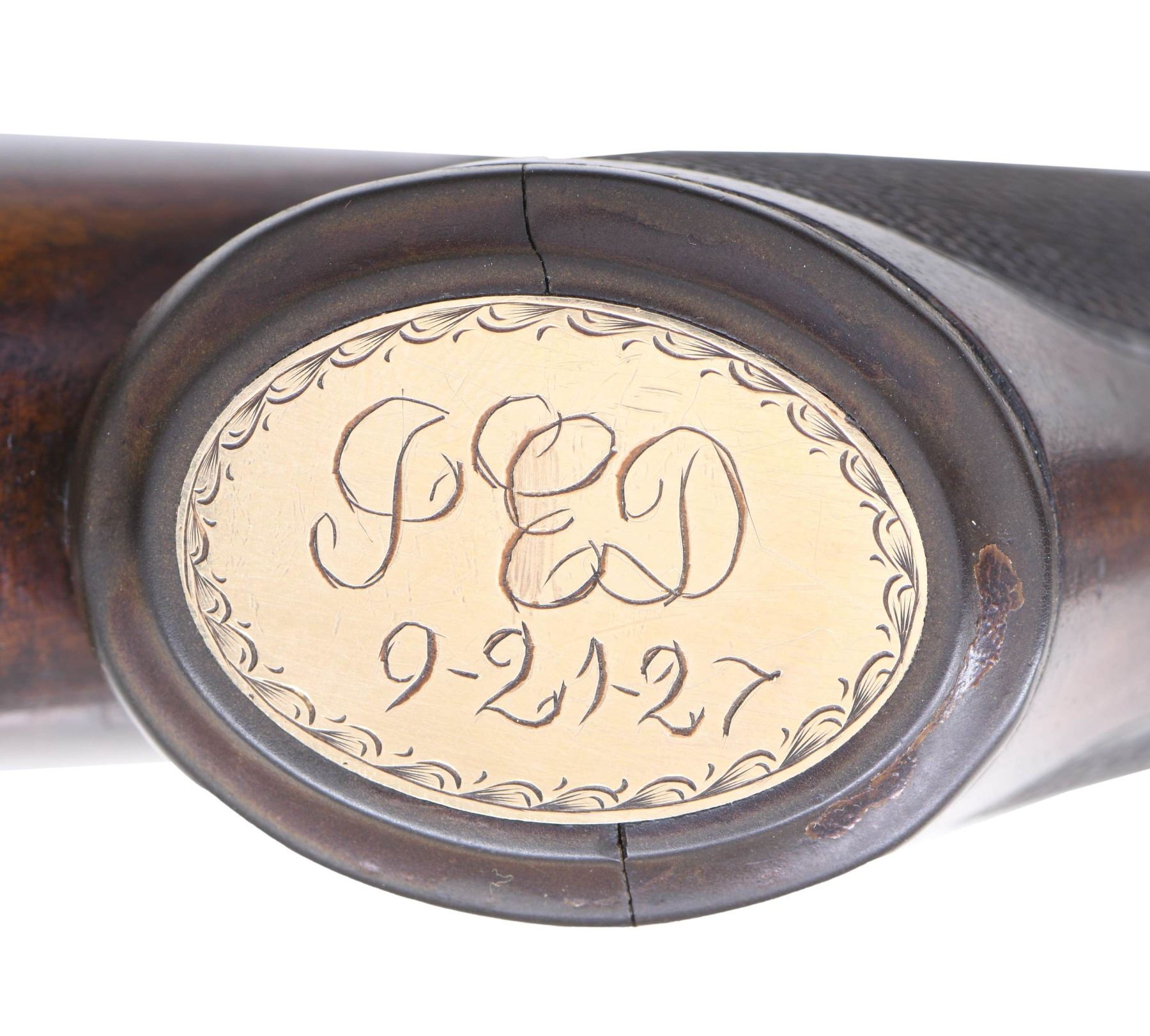 Cal. 12 ga. 2 3/4". S# 220769. Bbls. 28" of Acme Steel are marked "Overload Proved". Steel front bead. 1 1/2" frame. Case colored boxlock action w/ fancy fences & B grade factory engraving. Right side scene features two pointers. Left side features a setter & a pointer. Floorplate shows two flying geese. Balance of receiver has arabesque scroll engraving w/ fancy borders that continue to the trigger guard bow & forearm iron. Breech end of bbls. have borderline engraving. Aftermarket single selective trigger. Selective ejectors. Steel tipped splinter forearm & hard rubber capped pistol grip stock of nicely grained walnut w/ gloss finish & "B" grade hand checkering. Additional checkering on stock ears w/ fleur-de-lis finials. Brass plate on grip cap has an engraved border w/ initials "JED" over a date of "9-21-27". LOP: 13 3/16" over checkered butt w/ engraved skeleton steel buttplate. DAC: 1 5/8". DAH: 3". Stock has approx. 1/4" cast off. WEIGHT: 7 lbs, 5.6 oz. Mfg. 1927. Bore diameter: RT .729, LT .729. Choke constriction: RT .032, LT .010. Minimum wall thickness: RT .035, LT .033. CONDITION: bbls. retain 90% lightly faded blue showing small marks. Action has lightly visible case colors on its sides w/ fading in carry areas. Wood shows light finish & checkering wear w/ scattered small scratches & marks. Action is tight w/ top lever sitting right of center. Very good bright bores. (25-729/DS). CURIO. $7,000-8,000.