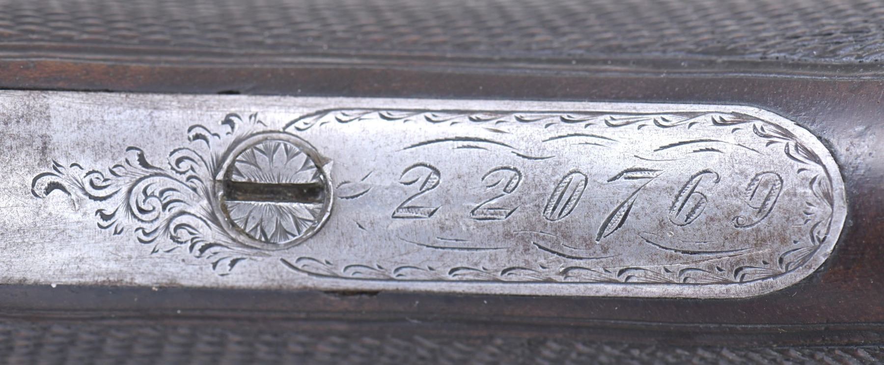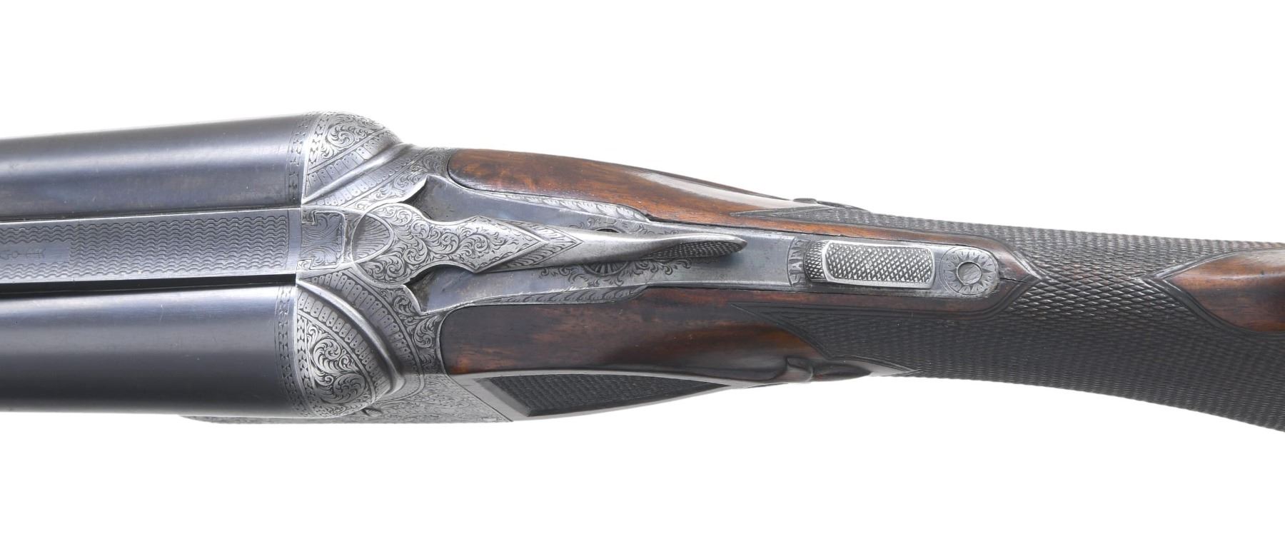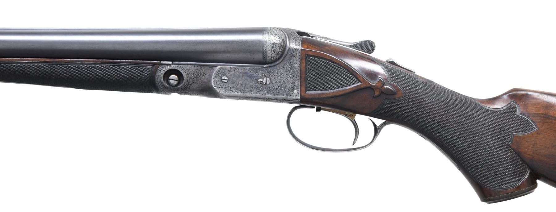 Cal. 12 ga. 2 3/4". S# 220769. Bbls. 28" of Acme Steel are marked "Overload Proved". Steel front bead. 1 1/2" frame. Case colored boxlock action w/ fancy fences & B grade factory engraving. Right side scene features two pointers. Left side features a setter & a pointer. Floorplate shows two flying geese. Balance of receiver has arabesque scroll engraving w/ fancy borders that continue to the trigger guard bow & forearm iron. Breech end of bbls. have borderline engraving. Aftermarket single selective trigger. Selective ejectors. Steel tipped splinter forearm & hard rubber capped pistol grip stock of nicely grained walnut w/ gloss finish & "B" grade hand checkering. Additional checkering on stock ears w/ fleur-de-lis finials. Brass plate on grip cap has an engraved border w/ initials "JED" over a date of "9-21-27". LOP: 13 3/16" over checkered butt w/ engraved skeleton steel buttplate. DAC: 1 5/8". DAH: 3". Stock has approx. 1/4" cast off. WEIGHT: 7 lbs, 5.6 oz. Mfg. 1927. Bore diameter: RT .729, LT .729. Choke constriction: RT .032, LT .010. Minimum wall thickness: RT .035, LT .033. CONDITION: bbls. retain 90% lightly faded blue showing small marks. Action has lightly visible case colors on its sides w/ fading in carry areas. Wood shows light finish & checkering wear w/ scattered small scratches & marks. Action is tight w/ top lever sitting right of center. Very good bright bores. (25-729/DS). CURIO. $7,000-8,000.