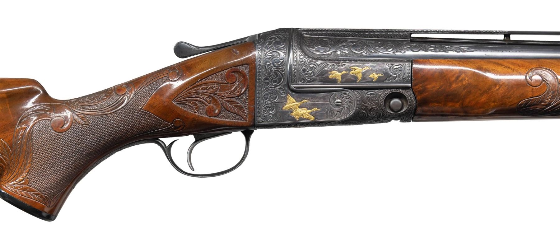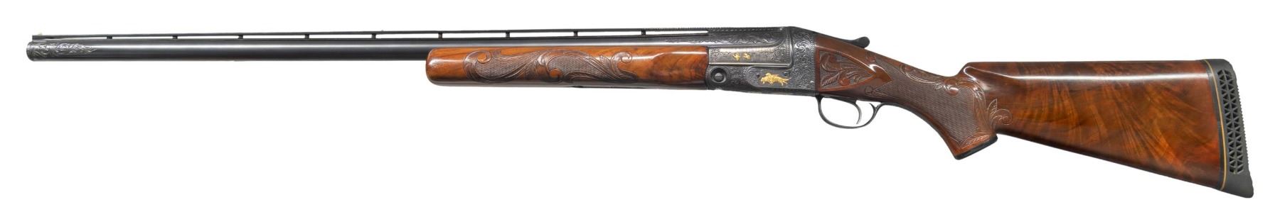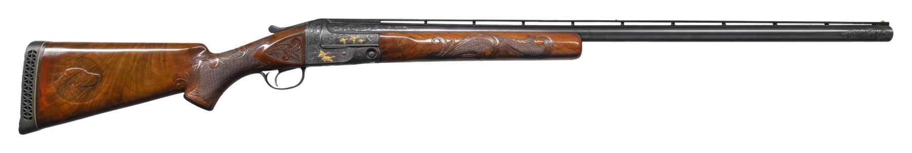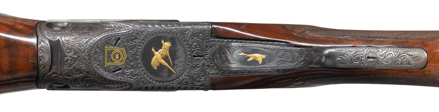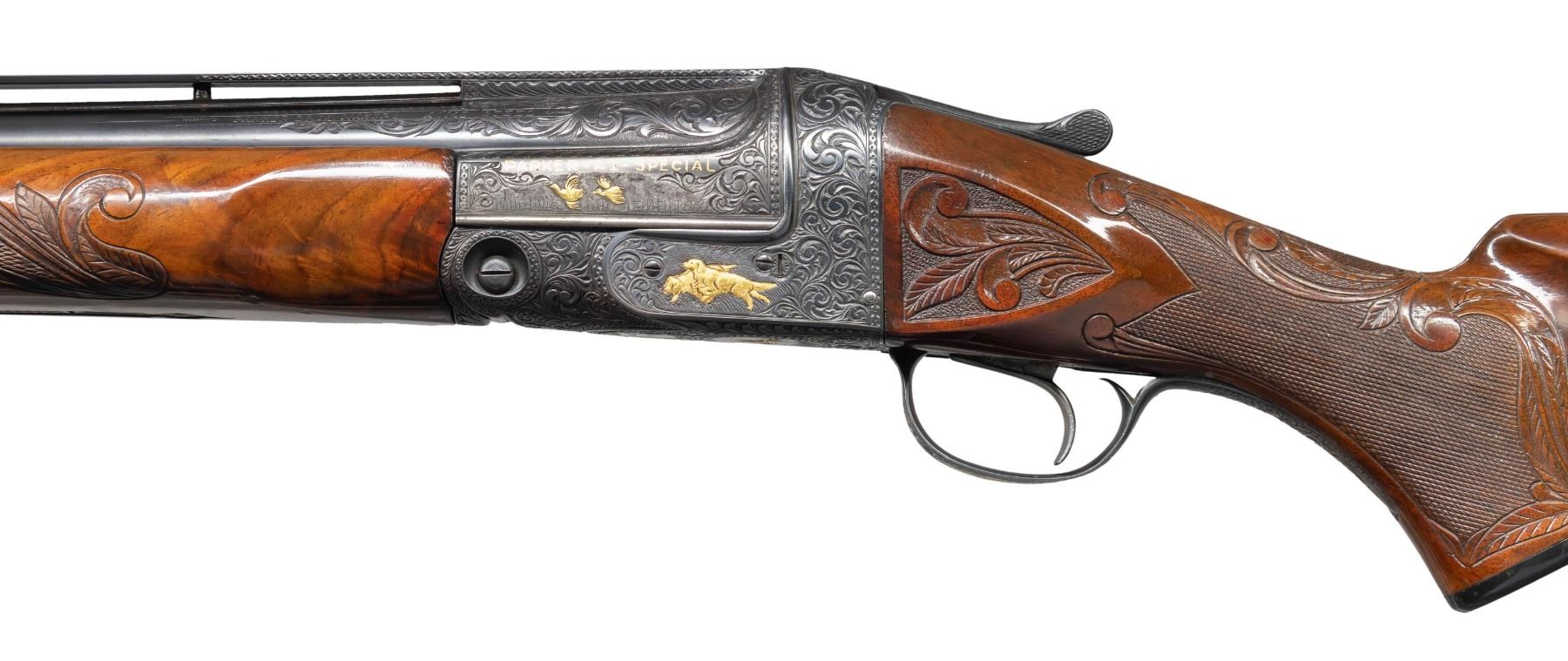 SPECIAL AND GOLD INLAID. Cal. 12 Ga. 2-3/4". S# 242367. The 30" Acme steel barrel with full choke has Remington markings on barrel flats. Barrel is fitted with slightly raised matted ventilated rib. Breech area is engraved with 4" triangles of large deeply cut scroll surrounding gold inlaid game birds on sides; with two quail under "PARKER-A1-SPECIAL" in gold on left. Right side portrays a trio of flying ducks. Muzzle also has triangles of scroll engraving. Black finished action without safety has single trigger and altered grade markings on watertable. Action is engraved with full coverage large scroll surrounding relief gold dogs on left and ducks on right. Trigger plate has a circular scene of two flushing pheasant and a flying goose is on trigger guard bow. Front of trigger plate is gold inlaid with multi-banded shield surrounding "WW" at center below deeply engraved "WALKER". Capped pistol grip buttstock of crotch figured American walnut measures 14-1/4" over black trap pad. Checkering at grip is surrounded by large acanthus scrolls which also appear on side panels. Matching beavertail forend has usual Parker release. S# on iron is re-engraved. MEASUREMENTS: STOCK: DAH: 1-3/8". DAC: 1-3/8". CAST: about 1/4" off. LOP: 14-1/4". WEIGHT: 8 lb. 6 oz. CONDITION: fine as custom finished. Metal retaining nearly all of re-black with some high edge wear. Stocks have a few knicks and bumps in their original oil finish. Bore is bright and shiny. Mechanically good. (25-4301/MGM). CURIO. $3,000-4,000.