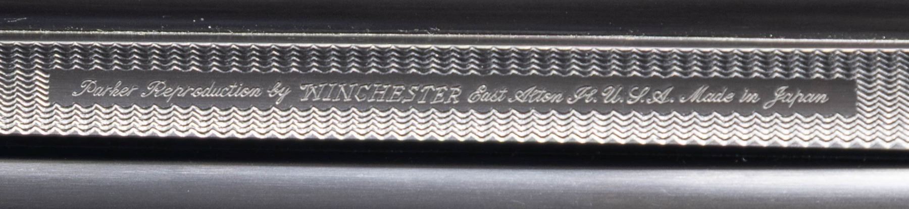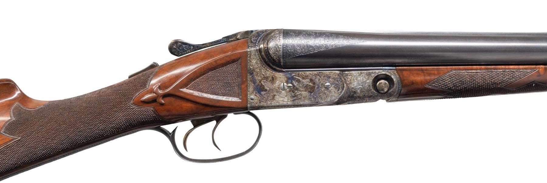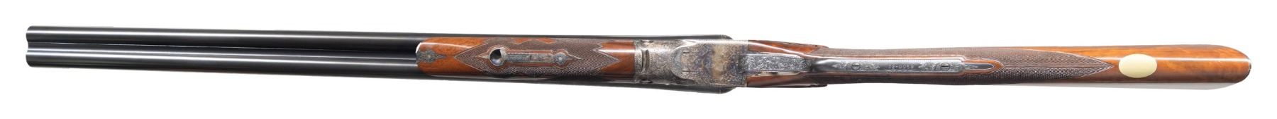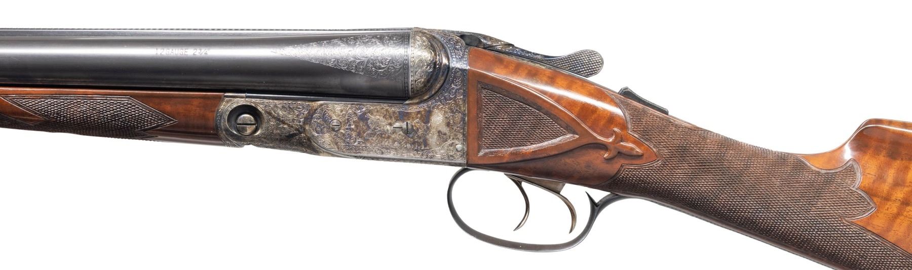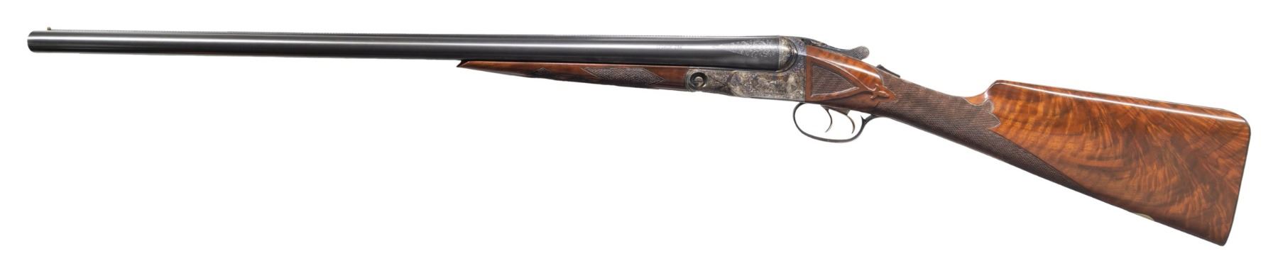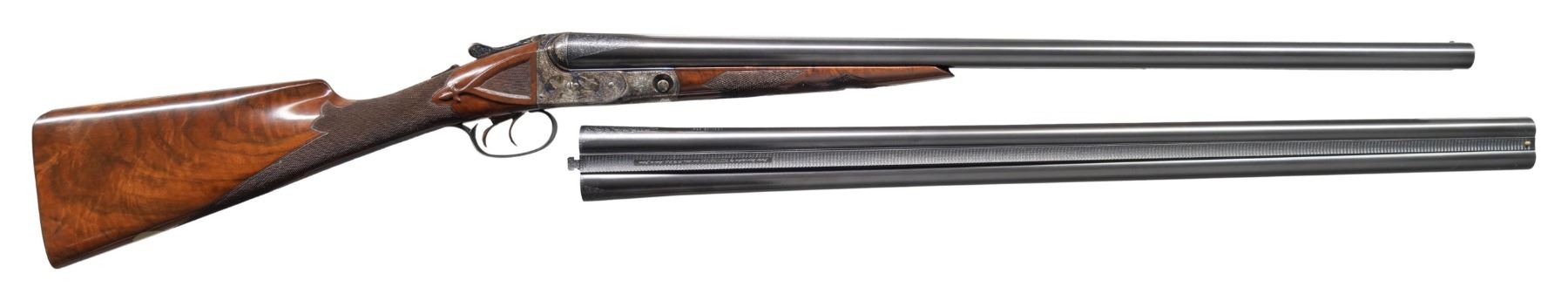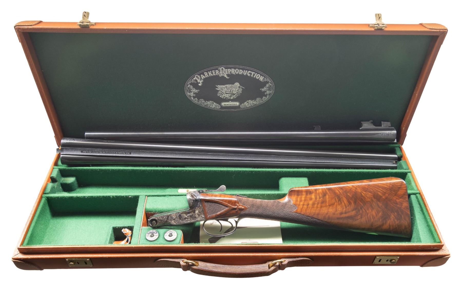 CASE. Cal. 12 Ga. 2-3/4" (both). S# B-12-0069. The BHE reproduction was offered after 1988 and was available through special order only. Only 100 12 bore guns were made. Retail price was $3,970 and an extra set of barrels was about $1,800. This fine example has 2 sets of barrels; 1- 26" choked IC & mod; the other 28" choked mod & full. S#s on both barrel sets match action. Ribs are marked "Parker Reproduction by WINCHESTER East Alton IL U.S.A. Made in Japan". There are 2" triangles of scroll engraving at breech ends. Barrel flats are marked for chokes, Parker proofs, grade and chamber info and frame size 1-1/2". Loops are stamped "1" & "2". One forend serves both barrel sets. Typical Parker case hardened action is filed with single beads around fences in grade "B" fashion and features automatic safety and double triggers (most were made with single). Action is engraved in typical "B" style with well cut scroll surrounding bird scenes; grouse on left and right. "PARKER BROS" is under each scene. Trigger plate is engraved with a flushing woodcock. Scroll engraved trigger guard has partial S# on tang. Straight grip buttstock made of very nicely crotch figured American walnut measures 14-1/4" over skeleton steel buttplate. Side panels are checkered and have fleur-de-lis drop points. Grip checkering is of typical "B" style with flourishes into comb. A vacant gold oval is on toeline. Matching splinter ejector forend has usual Parker release. MEASUREMENTS: DAH: 2-5/16". DAC: 1-7/16". CAST: neutral. LOP: 14-1/4". WEIGHT: 6 lb. 15 oz. with 28" barrels. UNATTACHED ACCESSORIES: gun is housed in its original leather case with leather corners lined in green felt. Case has leather trimmed canvas outer cover. Bottom of case is configured for both barrel sets and contains: snap caps, steel shot tag and Parker Reproduction booklet along with 2 keys. CONDITION: exceptionally fine. Appears essentially "as new"; with scant evidence of ever being fired. There are only a very few handling and assembly marks on all wood and metal surfaces. Mechanically crisp. Case leather is exceptionally fine as protected by its outer cover which shows some rubs. Interior cloth shows some minor marks. (25-5793/MGM). MODERN. $8,000-12,000.