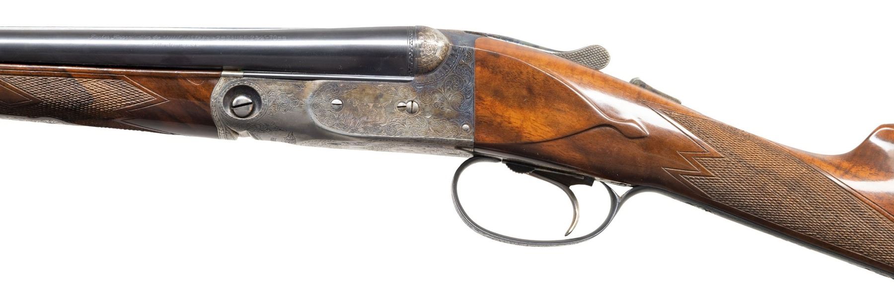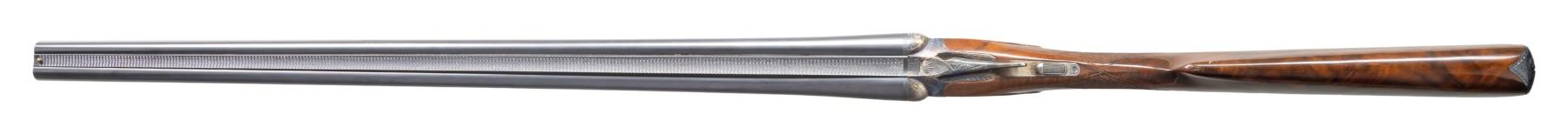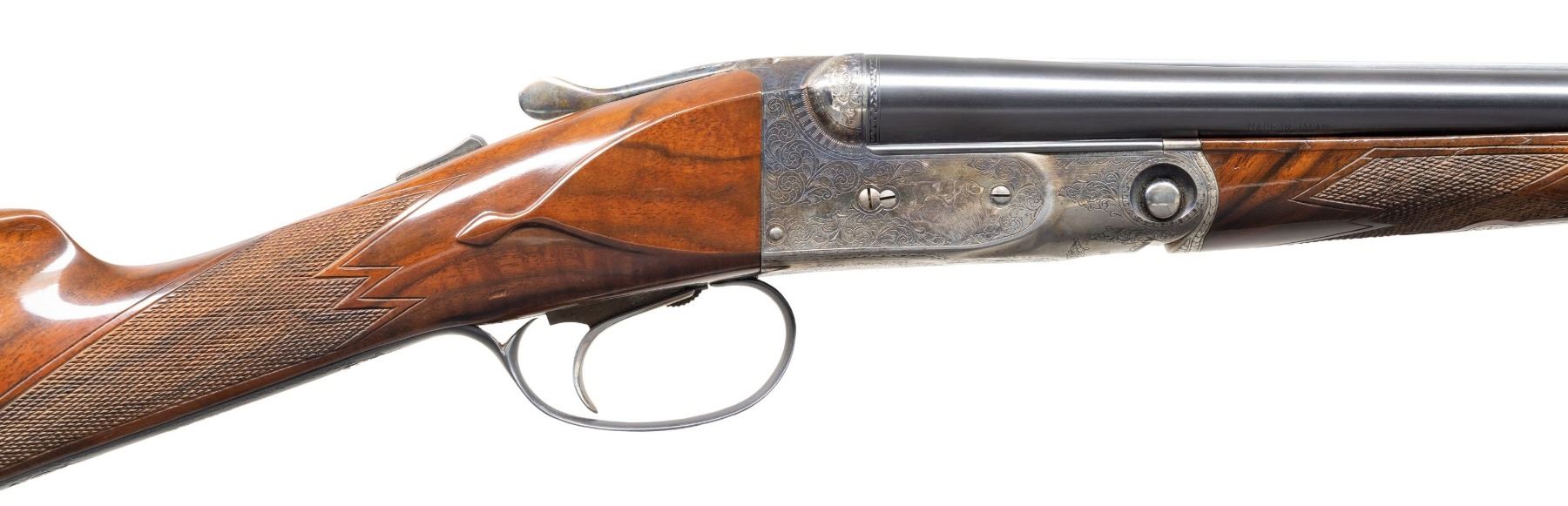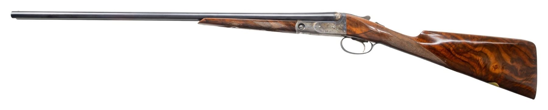 Cal. 28 Ga. S# 28-00095. One of 3,500 made; this very early production gun has 26" barrels with Parker Reproduction by Winchester information on left barrel; right is marked "MADE IN JAPAN". Barrel flats with overload proofs are marked for IC and Mod chokes. Frame size "F" is on rear lump. Case hardened action with lightening cuts on watertable features automatic safety and single selective trigger. Action is engraved in usual late "D" style with dogs on sides surrounded by scroll. "PARKER" is on bottom of action. Trigger plate is engraved with four pheasant. Finely crotch figured and well marbled Claro walnut straight grip buttstock measures 14-1/4" over skeleton steel buttplate. Stock features "D" styling with lozenge drop points, multi-point pattern grip checkering and vacant gold oval. Matching splinter ejector forend has usual steel tip and Parker release. MEASUREMENTS: STOCK: DAH: 2-1/8". DAC: 1-3/8". CAST: neutral cast. LOP: 14-1/4". WEIGHT: 5 lb. 6-1/2 oz. CONDITION: very fine with evidence of light field use. Barrels retaining nearly all original blue. Action retains about 60% original very delicate case color; showing considerable silvering at normal carry point around bottom of action. There are a few minor nicks and dings in original finish of stocks with a fairly large ding at point of comb. Bores are bright and shiny. Mechanically fine. The price of these very popular guns is constantly rising. (25-5197/MGM). MODERN. $4,000-6,000.