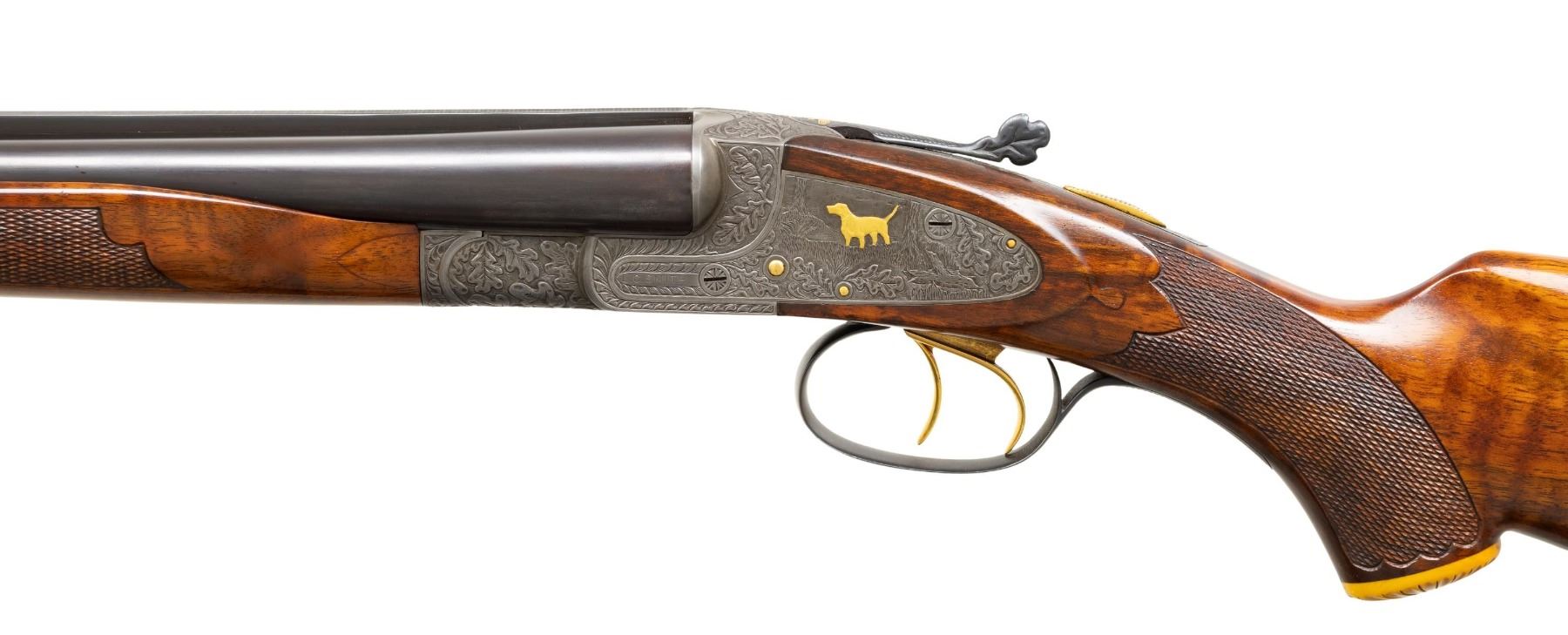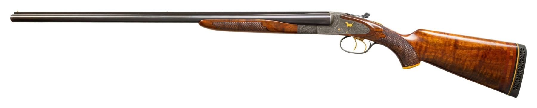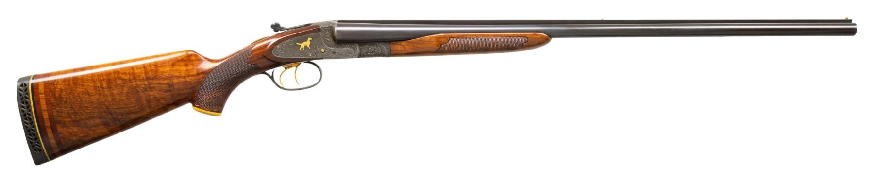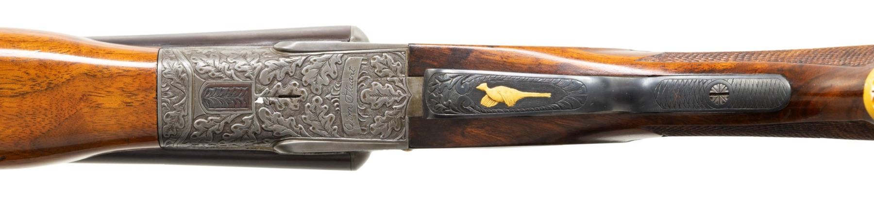 Cal. 20ga, lengthened to 2 3/4" with lengthen forcing cones. S# FWS 11194. Bbls shortened to 26" of Armor steel. White front and mid beads. This highly engraved featherweight sidelock gun was originally a field grade. Full coverage engraving features deep relief oak leaf carving on the frame. Lockplates have scenes featuring gold inlaid dogs with oak leaf borders. Trigger guard bow has a gold inlaid pheasant. Leaf carved top lever has a gold inlaid flying partridge. Double triggers, cock levers, safety switch, action pins and forearm parts are gold plated. Floor plate is engraved with the name "Jim Stuart". Trim beavertail forearm and pistol grip stock in fancy walnut having drop points, carved yellow plastic grip cap, and ornate borderless hand checkering. LOP: 14 1/4" over a black ventilated White Line pad and 3/4" of varying colored spacers. DAC: 1 1/2". DAH: 2 3/4". Stock has a slight cast off. Bore Diameter: (R): .613. (L): .612. Choke Constriction (R): .002 (L): .002. Minimum Wall Thickness: (R): .036. (L): .038. WEIGHT: 6lb, 10.2oz. CONDITION: bbls retain over 95% reblued finish. Action has a very good dark gray finish. Wood has a very good gloss finish showing a few light marks. Action is tight and sound with top lever sitting nicely top right of center. Bright bores. (25-4302/DS). CURIO. $2,000-3,000.