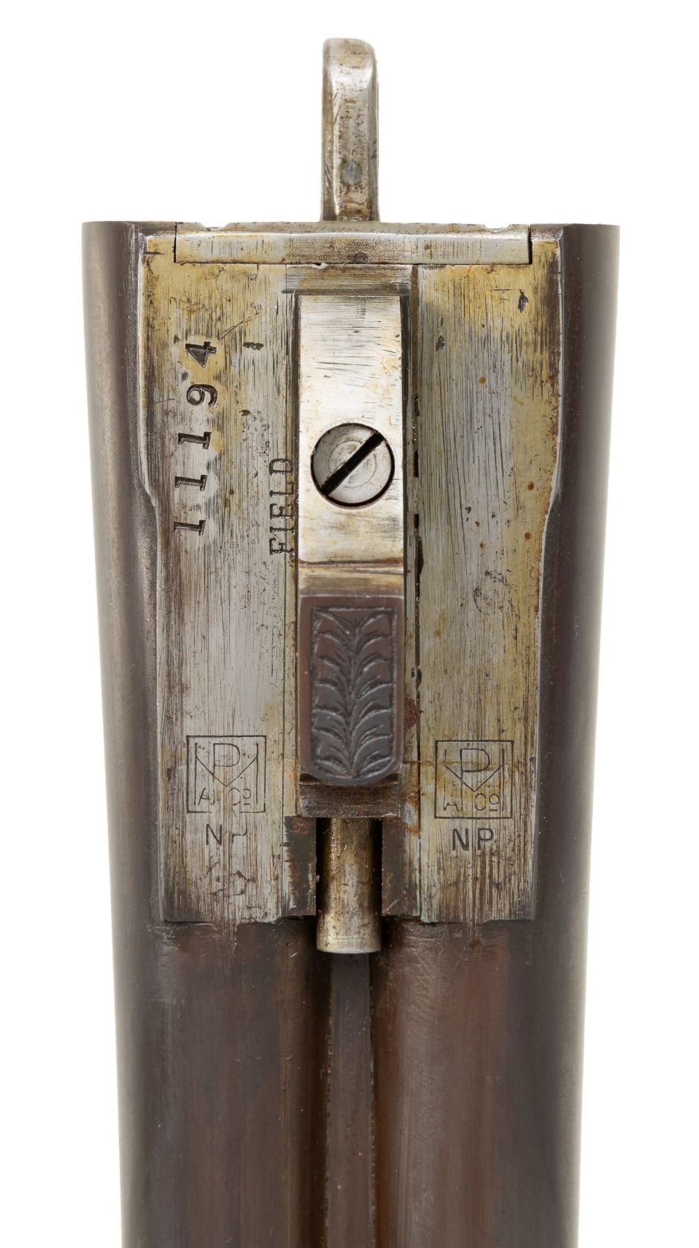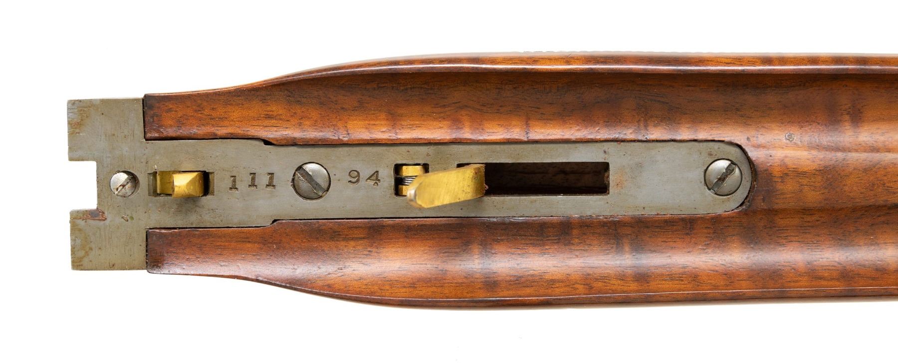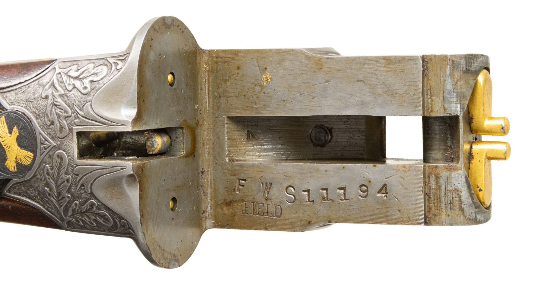 Cal. 20ga, lengthened to 2 3/4" with lengthen forcing cones. S# FWS 11194. Bbls shortened to 26" of Armor steel. White front and mid beads. This highly engraved featherweight sidelock gun was originally a field grade. Full coverage engraving features deep relief oak leaf carving on the frame. Lockplates have scenes featuring gold inlaid dogs with oak leaf borders. Trigger guard bow has a gold inlaid pheasant. Leaf carved top lever has a gold inlaid flying partridge. Double triggers, cock levers, safety switch, action pins and forearm parts are gold plated. Floor plate is engraved with the name "Jim Stuart". Trim beavertail forearm and pistol grip stock in fancy walnut having drop points, carved yellow plastic grip cap, and ornate borderless hand checkering. LOP: 14 1/4" over a black ventilated White Line pad and 3/4" of varying colored spacers. DAC: 1 1/2". DAH: 2 3/4". Stock has a slight cast off. Bore Diameter: (R): .613. (L): .612. Choke Constriction (R): .002 (L): .002. Minimum Wall Thickness: (R): .036. (L): .038. WEIGHT: 6lb, 10.2oz. CONDITION: bbls retain over 95% reblued finish. Action has a very good dark gray finish. Wood has a very good gloss finish showing a few light marks. Action is tight and sound with top lever sitting nicely top right of center. Bright bores. (25-4302/DS). CURIO. $2,000-3,000.