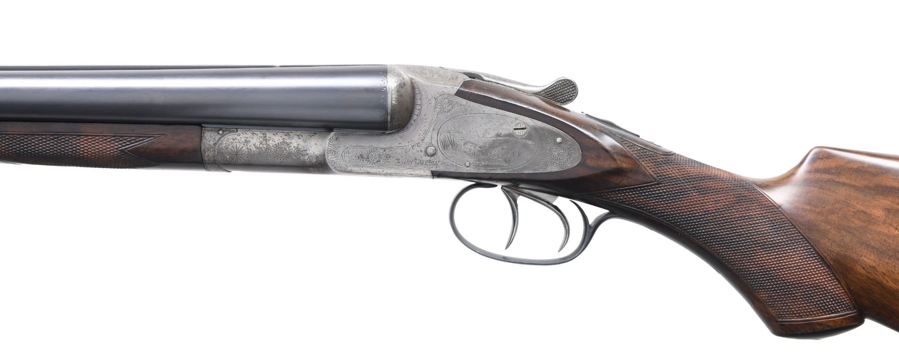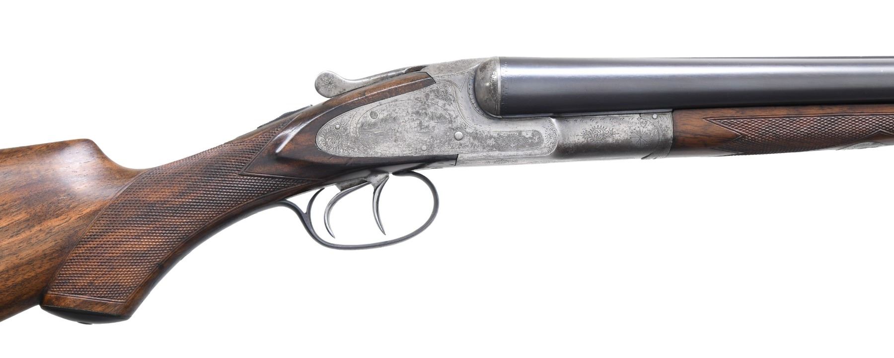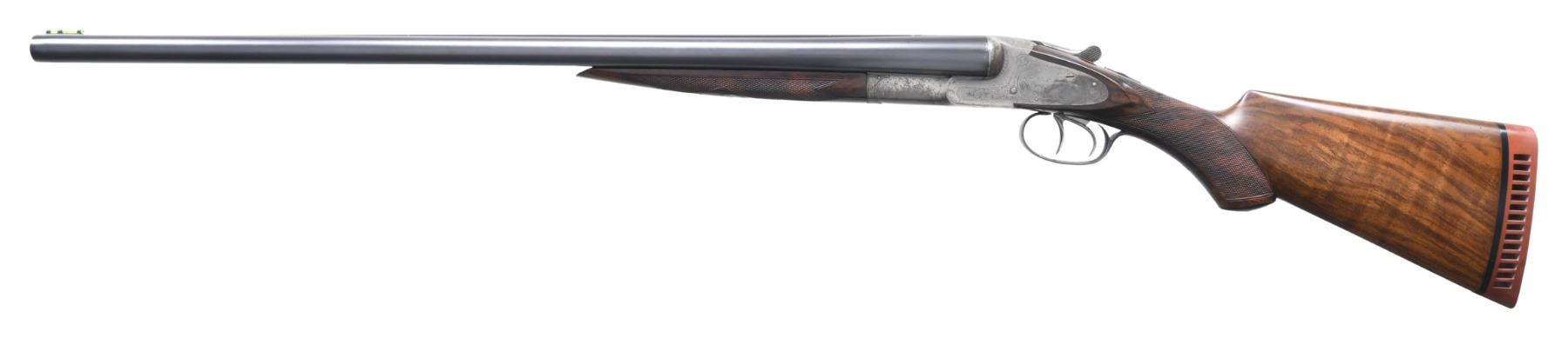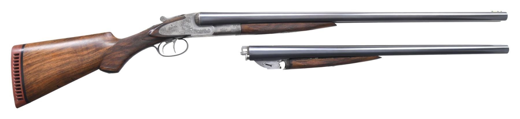 Cal. 12 ga. 2 3/4". S#. 206220. Bbls: (1). 26" fluid steel w/ green fiber optic front sight. Choke constriction: Rt.: .029., Lt: .035. (2). Shortened to 22", broken brass front bead. Cyl. bores. Side lock action has No. 3 factory engraving featuring oval viginettes w/ ducks on right lock plate and quail on left. Scenes are highlighted by arabesque scroll & straight line borders. Double trigger. Selective ejectors. Three position top tang safety. Both bbls. have individual properly numbered ebony tipped splinter forends. Hard rubber capped pistol grip stock of fancy thin shell walnut. LOP: shortened to 13 7/16" over an aftermarket Hawkins pad. Weight w/ 26" bbls: 7 lbs. 7.4 ozs. CONDITION: action has traces of case colors in protected areas, balance is fading to silver/gray showing spotted light corrosion. Both bbls. retain over 98% reblued finish. 26" bbls. are missing ejector plunger ass. & have very good bores. 22" bbls. have some pitting forward of the chamber in the right bore. Refinished stock & forends have recut checkering retaining a few light dents. Action is tight & sound. (25-894/DS). CURIO. $1,750-2,500.