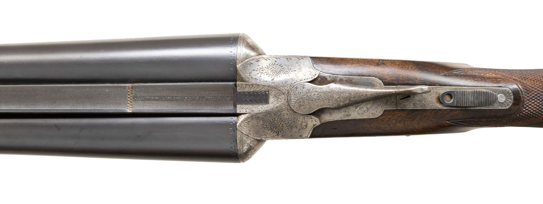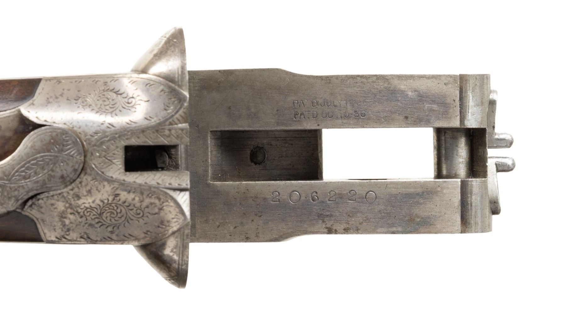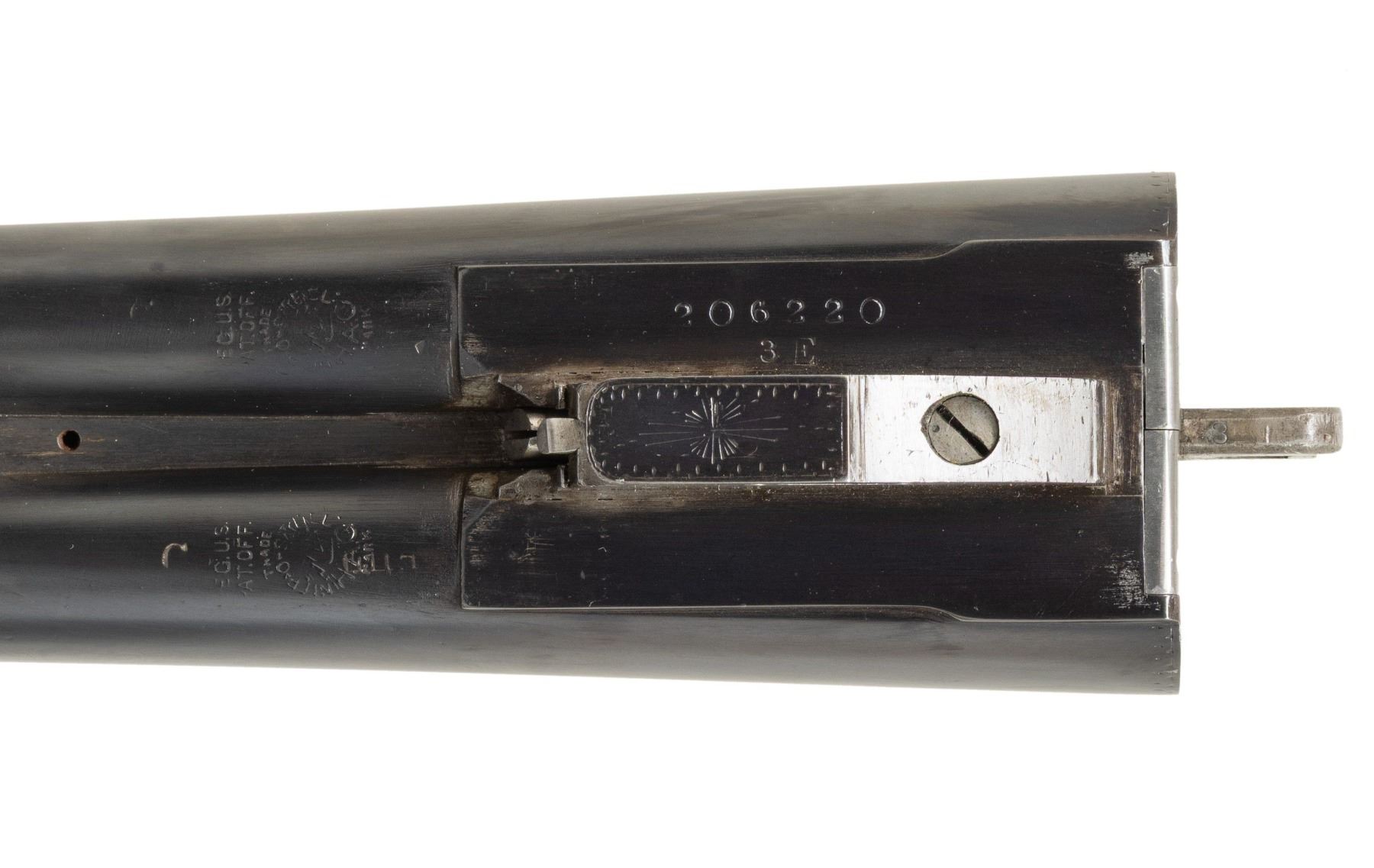 Cal. 12 ga. 2 3/4". S#. 206220. Bbls: (1). 26" fluid steel w/ green fiber optic front sight. Choke constriction: Rt.: .029., Lt: .035. (2). Shortened to 22", broken brass front bead. Cyl. bores. Side lock action has No. 3 factory engraving featuring oval viginettes w/ ducks on right lock plate and quail on left. Scenes are highlighted by arabesque scroll & straight line borders. Double trigger. Selective ejectors. Three position top tang safety. Both bbls. have individual properly numbered ebony tipped splinter forends. Hard rubber capped pistol grip stock of fancy thin shell walnut. LOP: shortened to 13 7/16" over an aftermarket Hawkins pad. Weight w/ 26" bbls: 7 lbs. 7.4 ozs. CONDITION: action has traces of case colors in protected areas, balance is fading to silver/gray showing spotted light corrosion. Both bbls. retain over 98% reblued finish. 26" bbls. are missing ejector plunger ass. & have very good bores. 22" bbls. have some pitting forward of the chamber in the right bore. Refinished stock & forends have recut checkering retaining a few light dents. Action is tight & sound. (25-894/DS). CURIO. $1,750-2,500.