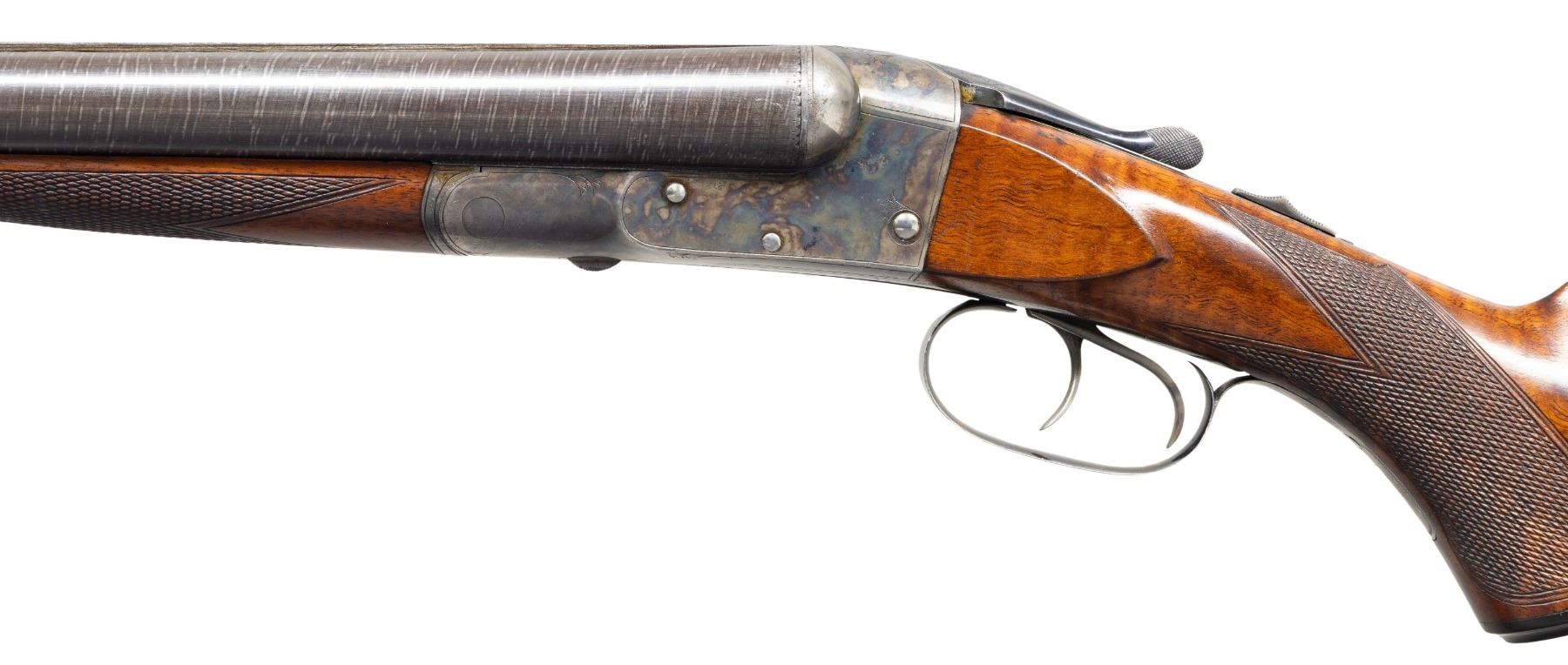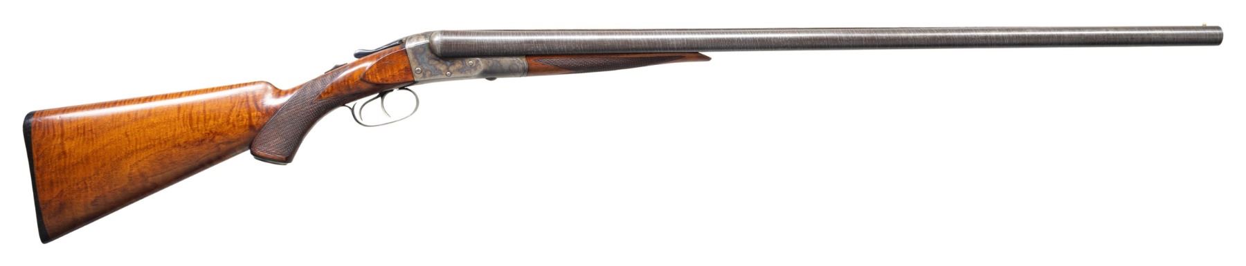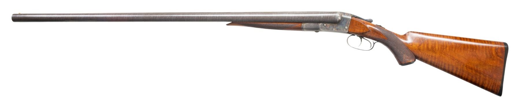 SHOTGUN. Cal. 12 Ga. 2-3/4". S# 1504. These well made guns were produced by Forehand Arms between Circa 1895 & 1897 and were offered in four grades from 0 to 3. Number made is not known however S#'s are found as high as around 3200. This grade 0 gun has 30-1/8" swist steel barrels with flat matted rib. Large dolls head rib extension is cut for locking bolt. Barrel flats are stamped with S#. "0" is on lump. Case hardened action is fitted with automatic safety and double triggers. Patent dates, S#, grade and "W&F" in a lozenge are on watertable. Action appears to be of early design with three pins through body for pivots etc. (Did S#'s start at 1500?) as opposed to the single screw seen on later guns. Action is engraved with a few minor sprigs of foliage and line borders. Pivot point on top lever is engraved "Forehand" "Arms" "Co" "Worcester" "MASS". Trigger guard has S# on tang. Pistol grip buttstock made of nicely fiddle figured American walnut measures 14" over hard rubber buttplate embossed with checkering and a wild turkey. Side panels are nicely shaped and point pattern checkering is at grip. Hard rubber grip cap is embossed "FOREHAND" "ARMS CO". It is interesting to note that action cocking system is configured so that a button protruding through bottom of action must be depressed in order to remove barrels. Matching splinter forend has friction release. MEASUREMENTS: BBLS: Bore Diameter: L .727. R .715. Restriction: L .032 (full ). R .020 (mod). Wall thickness: L .042. R .045. STOCK: DAH: 3". DAC: 1-7/8". CAST: neutral. LOP: 14". WEIGHT: 7 lb. 12 oz. CONDITION: exceptionally fine. Barrels retaining over 95% original twist finish with very fine pattern definition. Action retains over 90% original case hardening color with silvering and some high edge wear. Stocks retain nearly all of their original finish with some light marks. Checkering is lightly worn. Bores are bright and shiny and without noted problems. Action is tight; mechanically good. An exceptionally fine example of this scarce American gun. PROVENANCE: From the Private Collection of Berrien Moore III. (01-28470/MGM). ANTIQUE. $1,500-2,500.