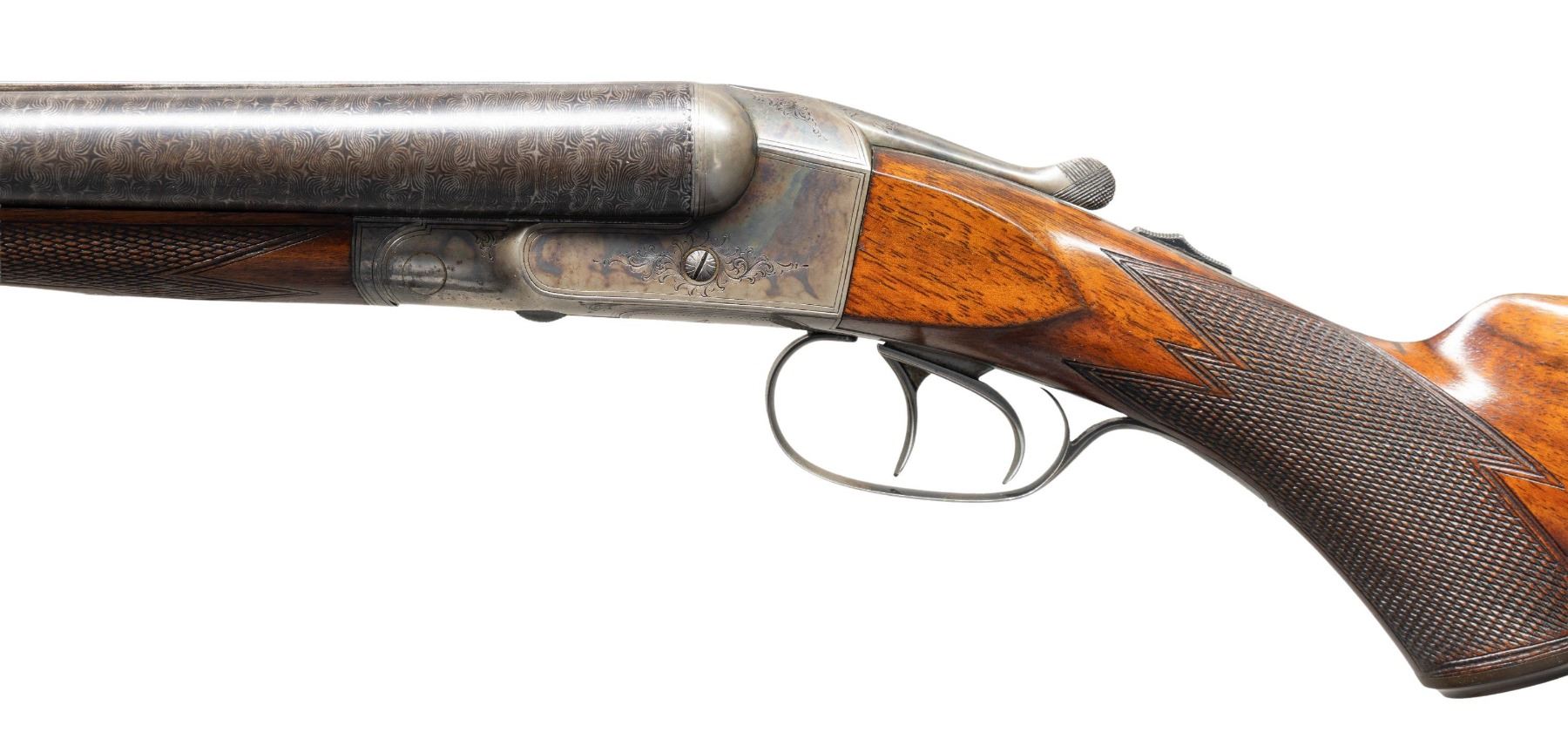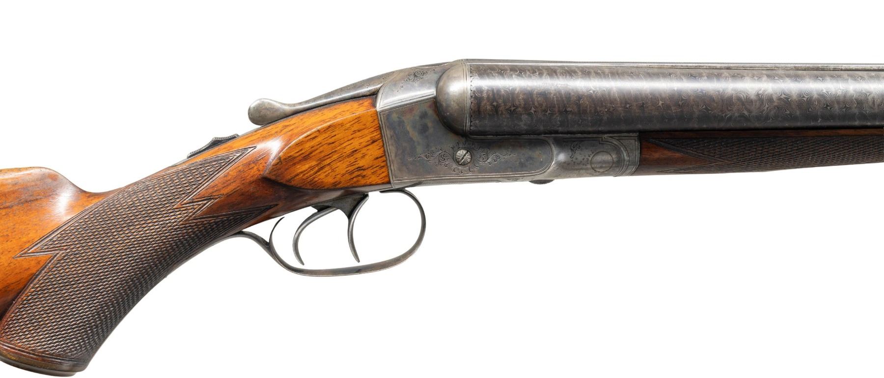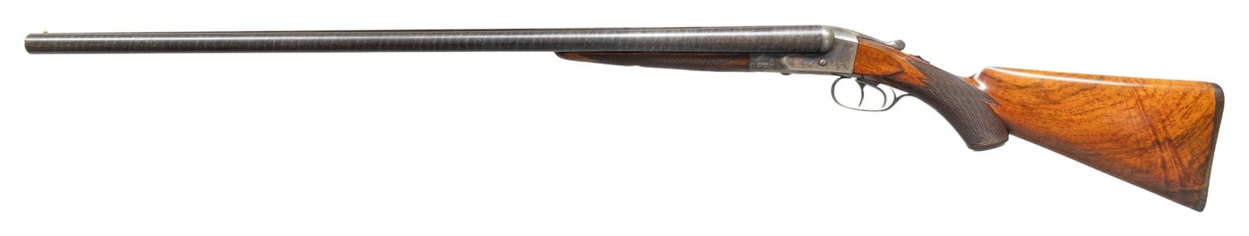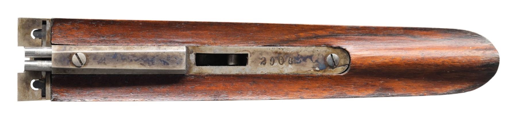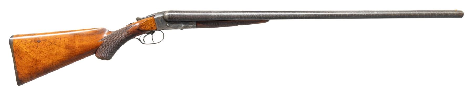 BOXLOCK DOUBLE SHOTGUN. Cal. 12 Ga. 2-5/8". S# 2906. These well made guns were produced by Forehand Arms between Circa 1895 & 1897 and were offered in four grades from 0 to 3. Number made is not known however S#'s are found as high as around 3200. This grade 1 with very rare ejector system has 30-1/8" dramatic two stripe damascus barrels with flat matted rib. Large dolls head rib extension is cut for locking bolt. Barrel flats are stamped with S#. "1" is on lump. "2D" is on bottom of each barrel (2 stripe damascus ?). Case hardened action is fitted with automatic safety and double triggers. Patent dates, S# and grade are on watertable. Action is engraved with sprays of scroll within line borders. Pivot point on top lever is engraved "Forehand" "Arms" "Co" "Worcester" "MASS". Trigger guard has S# on tang. Pistol grip buttstock made of well figured American walnut measures 14-1/4" over hard rubber buttplate embossed with checkering and a wild turkey. Side panels are nicely shaped and point pattern checkering is at grip. Hard rubber grip cap is embossed "FOREHAND" "ARMS CO". It is interesting to note that action cocking system is configured so that a button protruding through bottom of action must be depressed in order to remove barrels. Matching splinter forend with Deeley type release has hard rubber forend tip. Forend is fitted with ejector system with spring plunger housing attached to iron and rotating sears in face of iron tripped by pegs that protrude from knuckle of action. MEASUREMENTS: BBLS: Bore Diameter: L .726. R .722. Restriction: L .030 (full ). R .029 (full). Wall thickness: L .035. R .036. STOCK: DAH: 2-1/2". DAC: 1-11/16". CAST: neutral. LOP: 14-1/4". WEIGHT: 7 lb. 8 oz. CONDITION: exceptionally fine. Barrels retaining over 90% original damascus finish with very fine pattern definition. Action retains over 80% original case hardening color with silvering and some high edge wear. Stocks retain nearly all of their original finish with some light marks. Checkering is lightly worn. Bores are bright and shiny and without noted problems. Action is tight; right ejector will not fire and both ejectors will not remain cocked when forend is removed; otherwise mechanically good. Only a handful of Forehand Arms guns are known with ejectors. PROVENANCE: From the Private Collection of Berrien Moore III. (01-28463/MGM). ANTIQUE. $2,000-3,000.