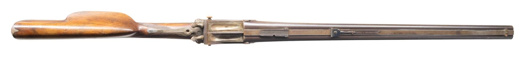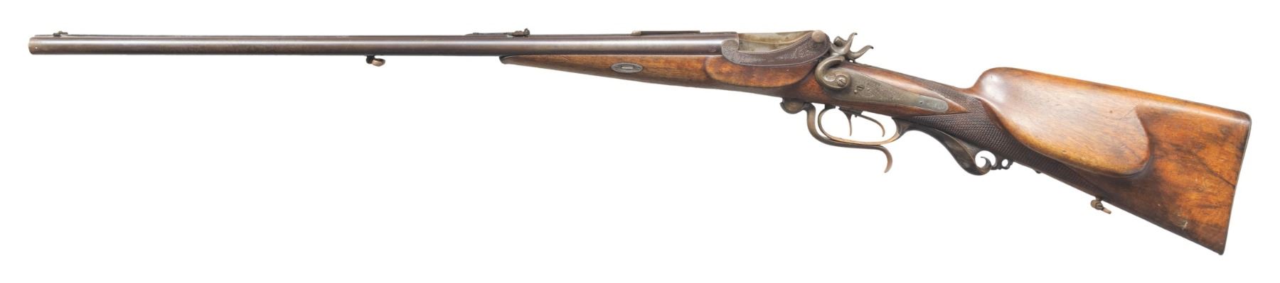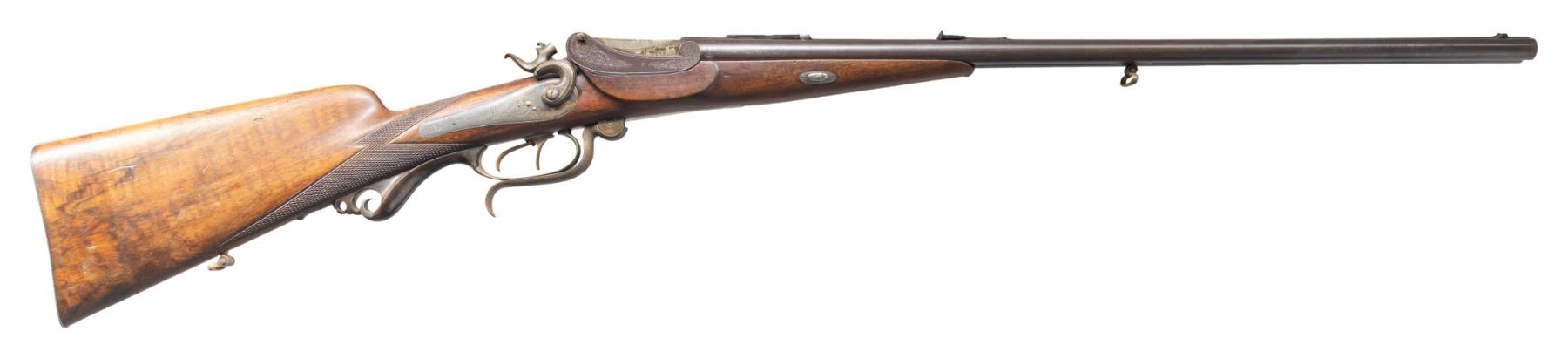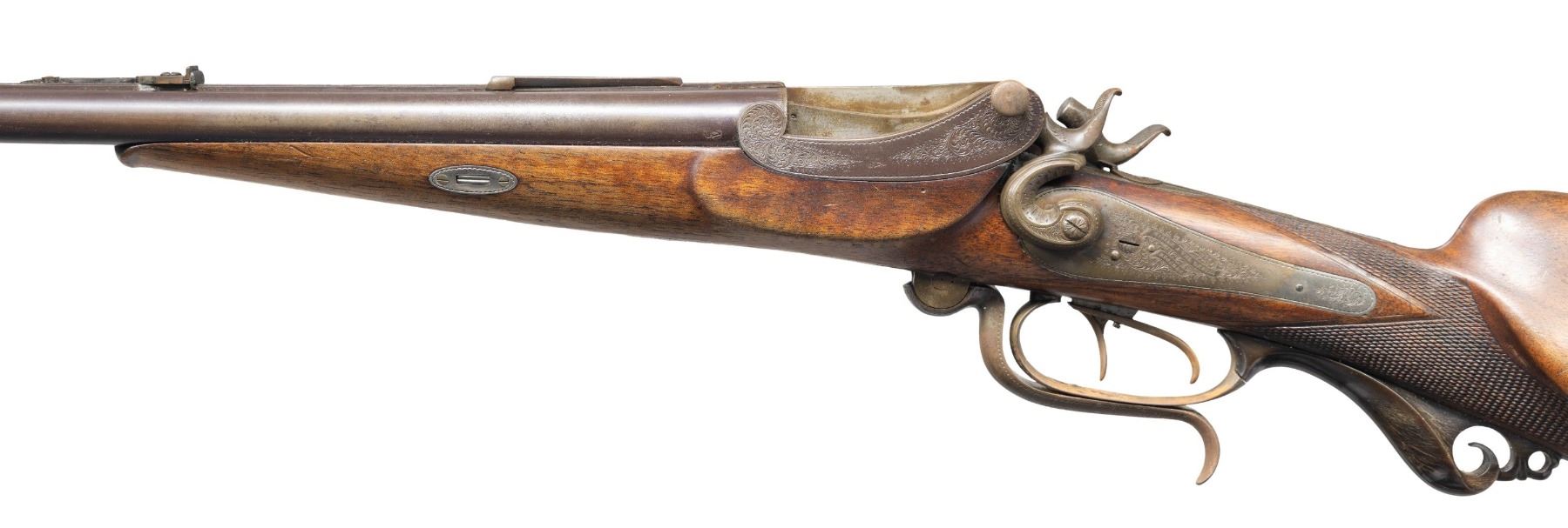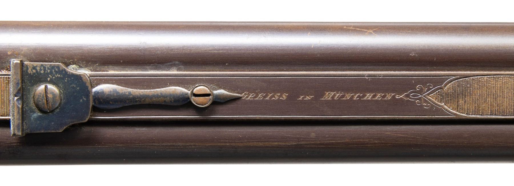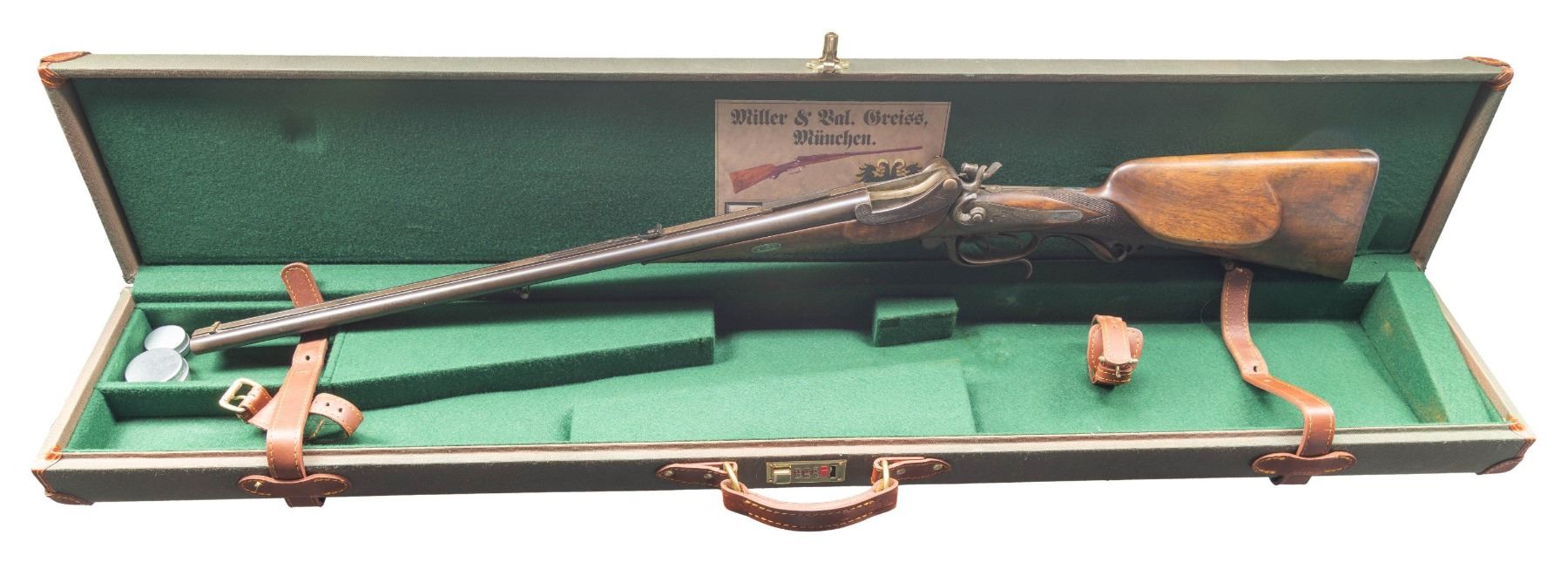 HAMMER RIFLE BY MILLER & VAL GREISS WITH CASE.Cal. 11.6x65R (.450 BPE?). S# 38303 (on buttplate). The barrels measure 27-1/2" inclusive of integral breech area which forms the frame for two pivoting breech blocks of Martini style which are actuated by underlever hinged on trigger plate. File cut rib with maker's name on unmatted portion is fitted with windage and adjustable rear sight and a dovetailed scope base. Rifle is fired with island back spring locks having elongated serpentine non-rebounding hammers; a flip-up aperture sight is in top tang. Action portion of barrels and locks are engraved with 60% coverage nicely cut scroll. Locks are also engraved with ribbons with maker's name and address. A crowned "V" proof is on left rear of action indicating this rifle was "on hand" at the inception of German proof laws in 1891. Both triggers are set and trigger guard has tang covered in scroll carved horn forming pistol grip. Straight grip stock of somewhat marbled and figured European walnut measures 13-3/4" over checkered steel buttplate stamped with S# at toe in typical German fashion. Stock features rounded Tyrolian right hand cheekpiece, point pattern checkering and scnabeled tip. Stock attaches to barrels with captive side bolt though oval steel escutcheons. UNATTACHED ACCESSORIES: rifle is housed in new full length green canvas case with leather corners; lined in green felt. A reproduction label is in lid. CONDITION: good and shows some poor storage. Barrel retains a good amount of original brown finish and there is some original case hardening color appearing on other parts. However, flash rust has appeared on many elements and is in need of cleaning. Stock retains most of an old oil finish, possibly original. Bores are good with strong rifling; dark in grooves. Action is operable. Locks are good. Triggers will probably set after adjustment. Case is very fine. PROVENANCE: From the Buckstix Collection. (01-28614/MGM). ANTIQUE. $4,000-6,000.