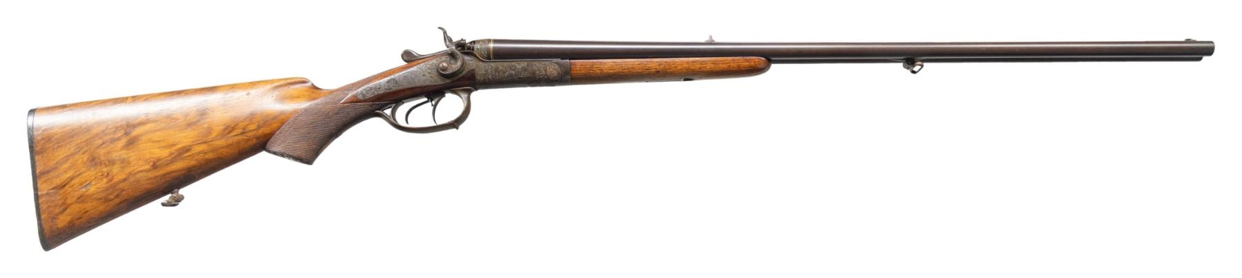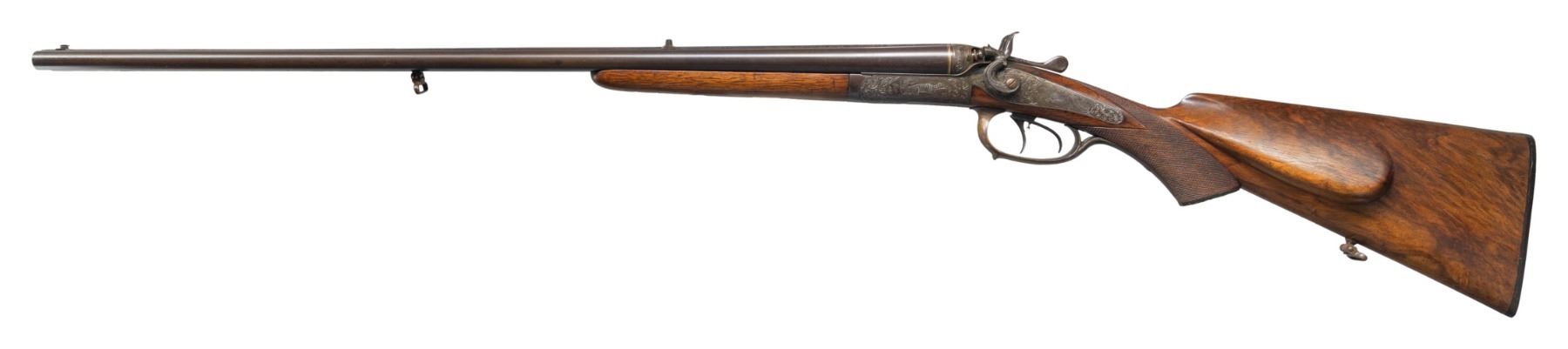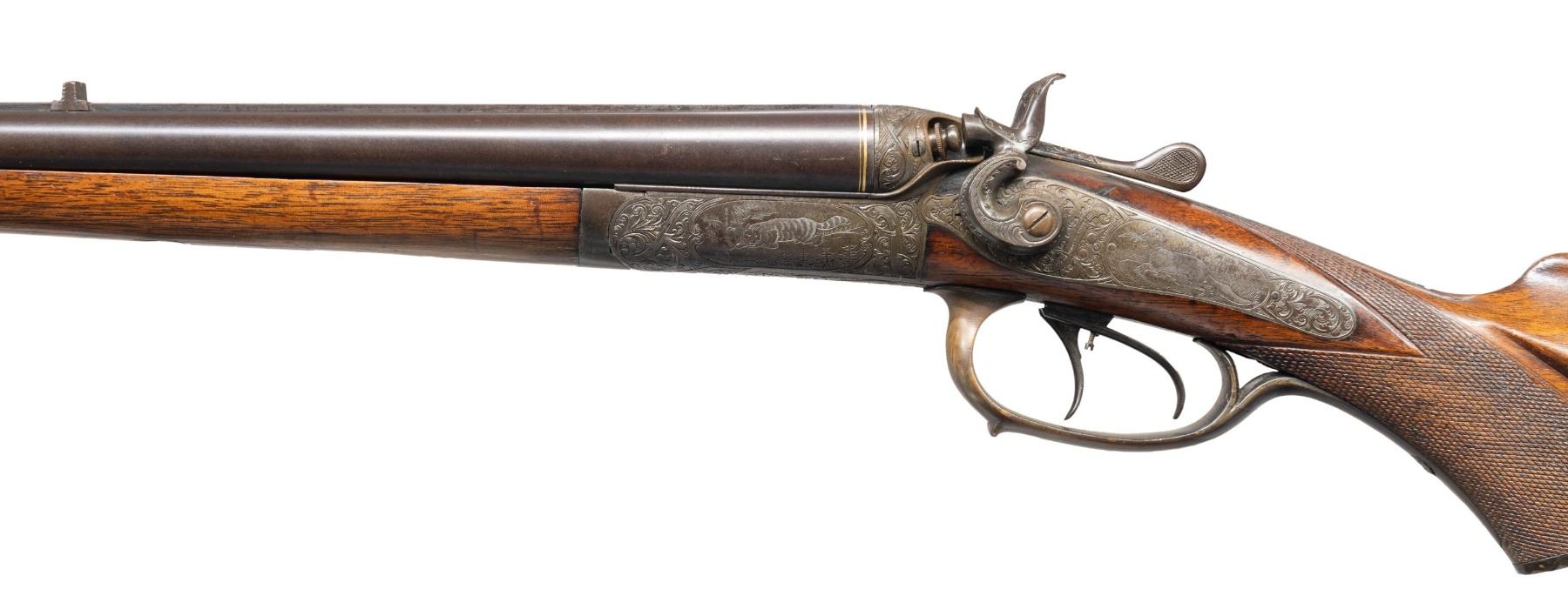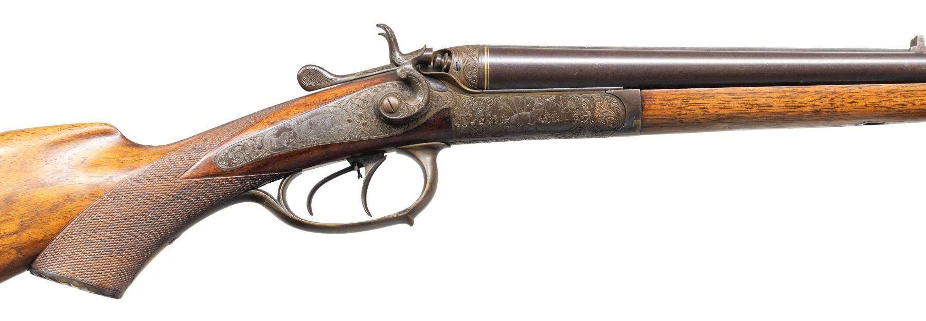 Cal. 11.15x60R (43 Mauser). S#. 9840 (found on replaced forend). The 25-3/4" barrels are gold inlaid with maker's name and "MUNSTER" on full length matted rib holding "V" notch rear and silver bead front sights. Gold bands are at breech ends. Bottoms of barrels are unproofed (pre-1891). Round bodied top lever action is fitted with peninsula back spring locks having serpentine rebounding hammers. Action and lock plates are fully engraved with very nicely cut semi-relief shaded scroll. This superb scroll surrounds game scenes with fat tiger cat on left side of action and stag on right. Left lockplate depicts an otter eating fish while a boar is being chased by a hound on right. Both triggers are set. Trigger guard is horn. Horn capped pistol grip buttstock of well veined European walnut measures 14-3/8" over checkered horn buttplate and features a nicely swept right hand cheekpiece and point pattern grip checkering. Replacement custom made forend has Deeley type release. UNATTACHED ACCESSORIES: rifle is housed in new green canvas tan leather trimmed case with leather corners; lined in green felt. A reproduction Pauli label is in lid. Case contains: plated square oil bottle, snap caps and 2 tins; 1 containing grease, 1 patches. CONDITION: fair to good. Barrel is brown patina. Action is also smooth and brown. Engraving detail remains fine. Stocks retain most of an old, possibly original, oil finish. Grip checkering shows considerable wear. Replaced uncheckered forend shows old oil finish and fits fairly well but is unengraved. Bores are good; dirty with strong rifling (may clean). Action is slightly loose. Locks are good. Triggers will set. Case is fine "near new". Accessories corroded. PROVENANCE: From the Buckstix Collection. (01-28613/MGM). ANTIQUE. $2,500-3,500.