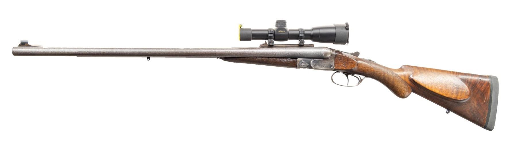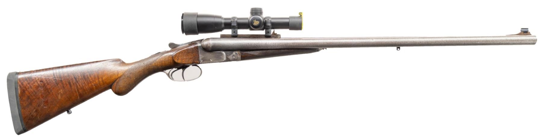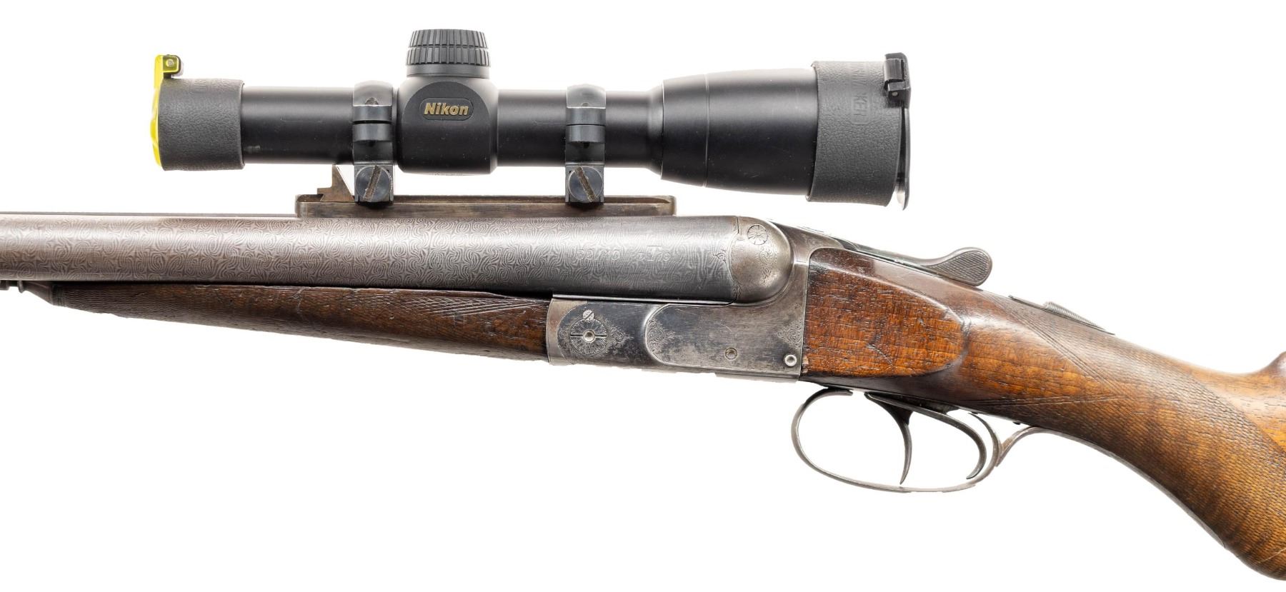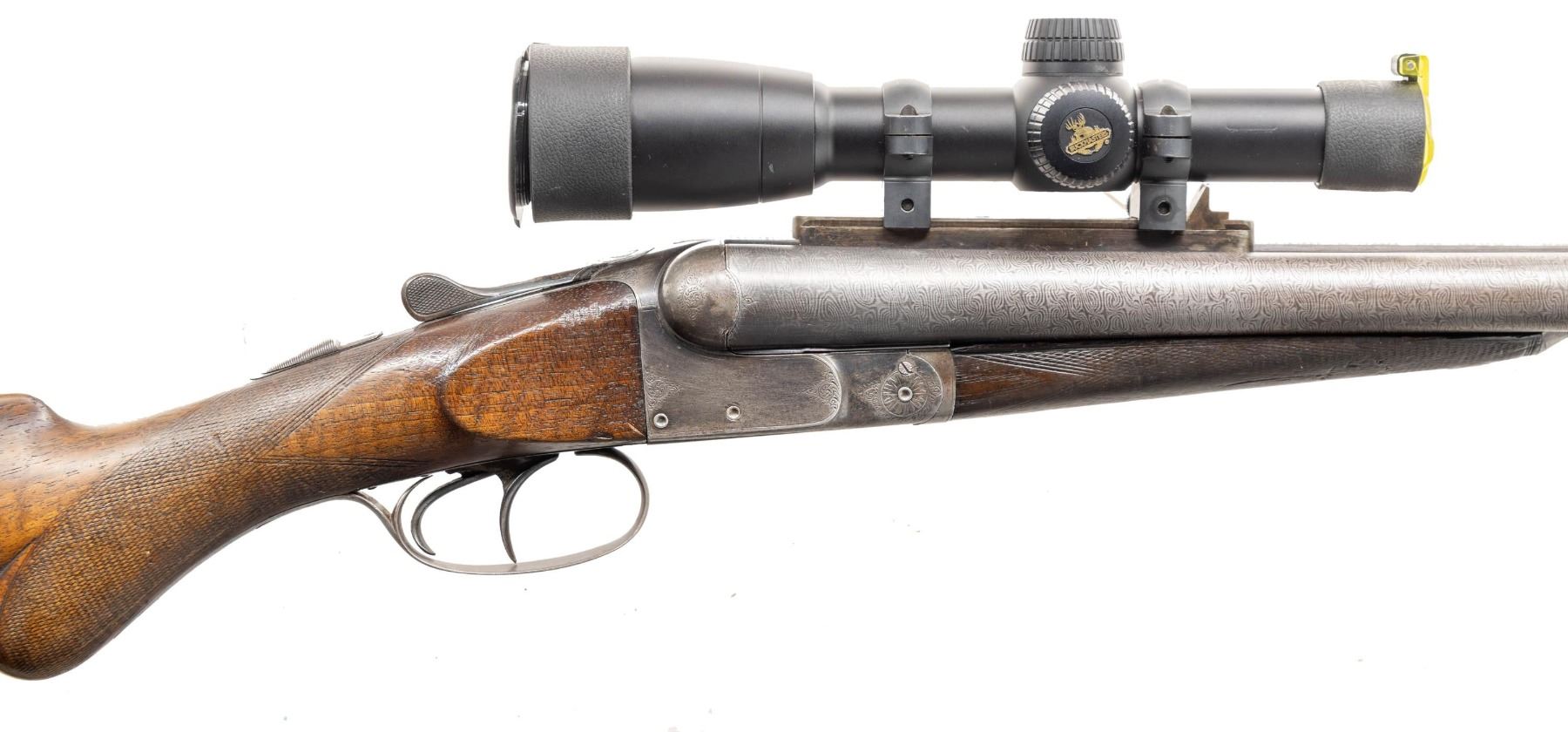 GUN. Cal. 32-40. S# 35199. Bbl 26" damascus with full length rifled sleeves. Left bbl is marked "32-40 DT 19" (possibly referring to Don Titus). Ramp mounted bead front sight. Fixed v-notch rear sight on raised scope mounting block. Boxlock action with dbl under lug and cross bolt locking having side clips. Action has highlights of scroll engraving, dbl triggers, extractors. Water table has Simpson Ltd import marking. Splinter forearm and round knob walnut cheekpiece stock. Bbls and toeline of stock have added sling swivel bases. LOP: 13 5/8" over an aftermarket solid black Pachmayr pad. WEIGHT: 9lb, 7.6oz. UNATTACHED ACCESSORIES: modern canvas covered case with brown cloth fitted interior. Case contains a Buckmasters 1x20 matte finished scope with Duplex reticle. Case also contains test targets, loading information, dummy rounds, cartridge block and case keys. CONDITION: bbls retain lightly faded damascus pattern. Right bbl has a sharp dent 13 1/4" from muzzle. Action finish has largely faded to gray. Stocks shows heavy finish and checkering wear with dents and marks. Forearm is chipped along left bbl channel. Functioning action. Very good bright rifled bores. PROVENANCE: From the Buckstix Collection. (01-28626/DS). ANTIQUE. $1,200-1,800.