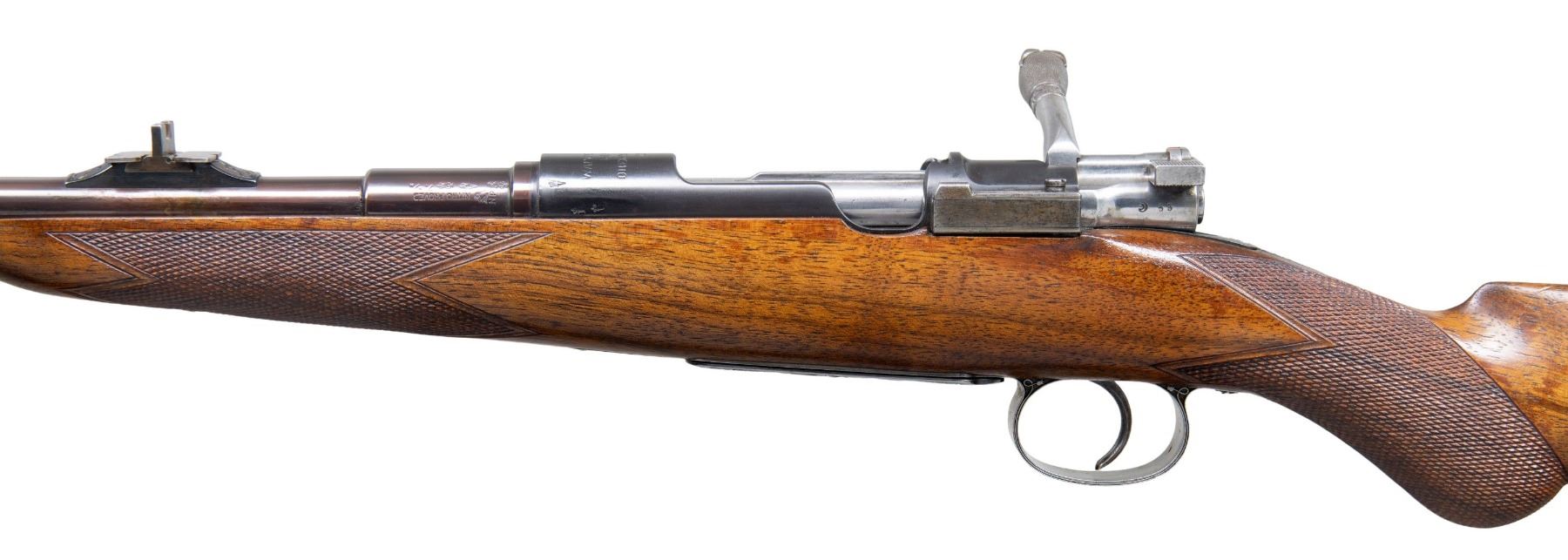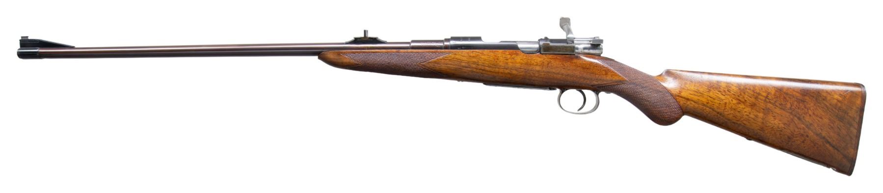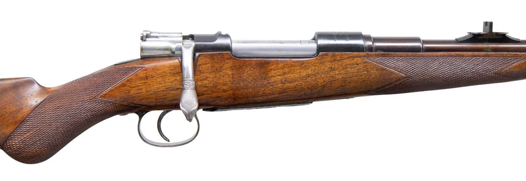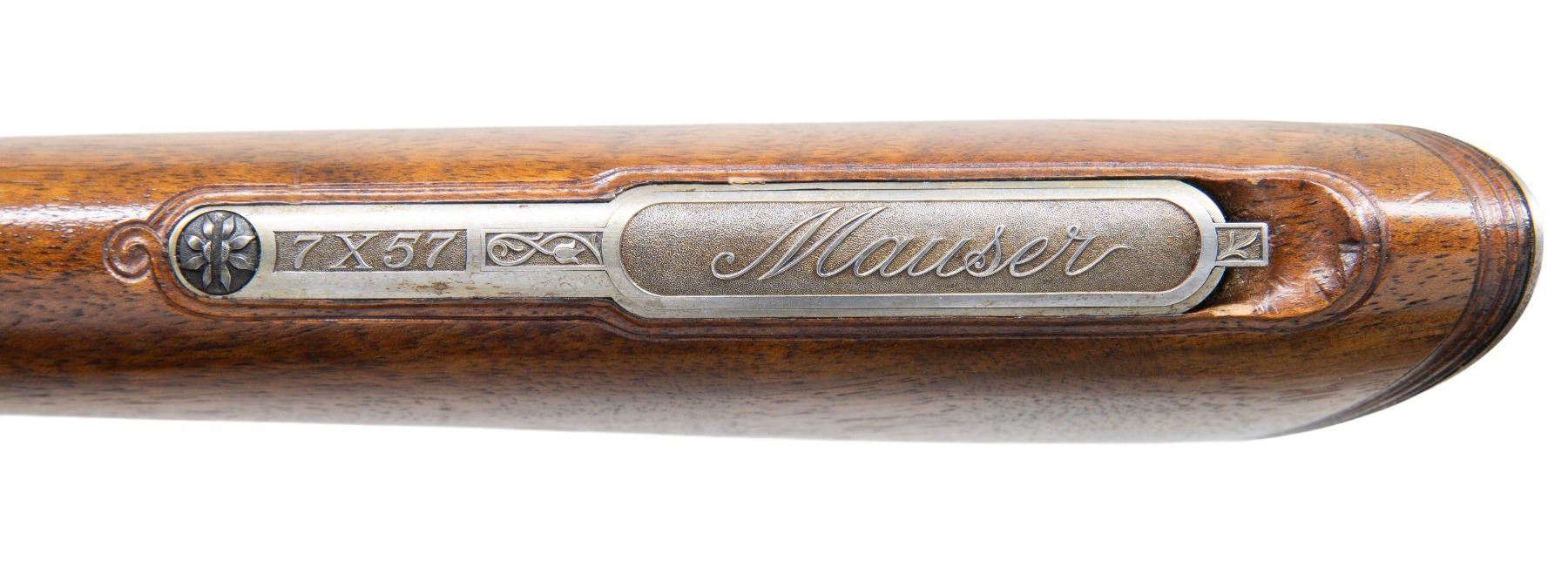 RIFLE RETAILED BY ARMY & NAVY CSL. Cal. 7x57. S# 53. This rare commercially proofed 1896 Mauser rifle was first retailed by Army & Navy CSL of London. It has 24" round barrel fitted with island rear base holding unusual three leaf express rear sight; silver bead with flip up night sight is in sleeved on front ramp. Top of barrel is engraved "Shot and Regulated by Army & Navy C.S.L. London. Model 1896 Mauser action is marked with Mauser name and address on receiver ring and dated "1896". Bolt has handle turned down. Bottom metal remains in military configuration. Round knob pistol grip stock is neatly checkered. This basic rifle has been dramatically enhanced with superb engraving and some careful stock detailing. This rifle's description was featured in 1993 "Guns Australia" magazine. The description of the embellishment is as follows: "This gun has a unique history. Previous owner Colin King of Australia commissioned master engraver Bruce Dean to rework the gun with the artfully done reminders of Australia. The trigger guard and floor plate are relief engraved with two of Australia's favorite game animals, a wild boar and Sambar stag. These are surrounded by Australian flannel flower in intertwined deep relief scroll with a stippled background. A Neidner style steel buttplate was deep relief chiseled and pierced wtih the same flannel flower motif. A toe-line cartridge trap was added and engraved "7x57" and "Mauser". Finally, to top it all off, the bolt handle was chiseled into a feral goat head with stippled surface and a ring of flannel flowers. The English walnut stock is excellent as professionally re-finished and features a swept pistol grip and shell-lip forearm. Generous, wrap around checkering with mullered borders covers the grip and forearm."To further refine the description it should be pointed out that there is a black Morocco leather lining behind the superb work on the buttplate. The buttplate and cartridge trap are neatly outlined with incised mouldings. The lettering on the cartridge trap cover is in full relief and is exquisitely done. Other well engraved accents are found on sides of trigger guard bow and more flannel flowers are found on bolt stop. Action screws and cartridge trap screws are also relief carved with flannel flowers. The quality of this work can not be overstated. MEASUREMENTS: WEIGHT: 6 lb. 12 oz. CONDITION: very fine as refinished. Barrel and action retaining nearly all an immersion re-blue; lettering is somewhat washed. Bottom metal cartridge trap, buttplate and bolt are bright polish and show some toning. Stock has a few marks and dings. Bore is shiny with strong rifling throughout. Mechanically fine. This incredible piece of work could be enhanced with a sympathetic refinish of the barrel and receiver. PROVENANCE: Photocopy of internet information regarding "Guns Australia" article pertaining to this rifle. (01-27278/MGM). ANTIQUE. $5,000-8,000.