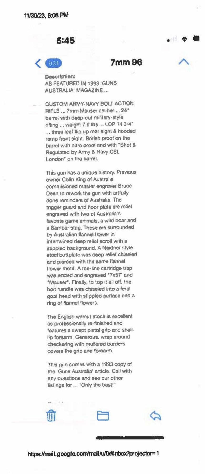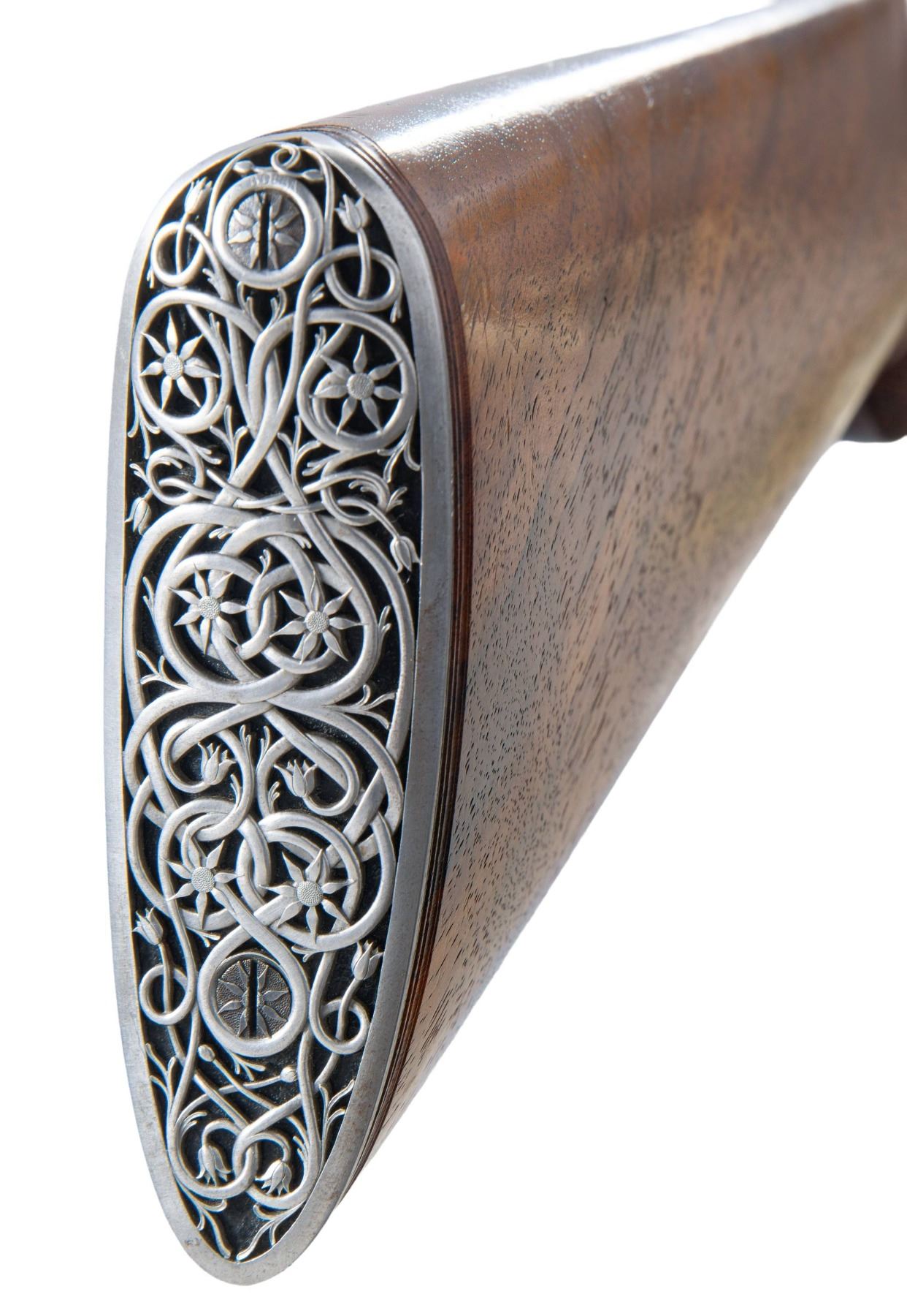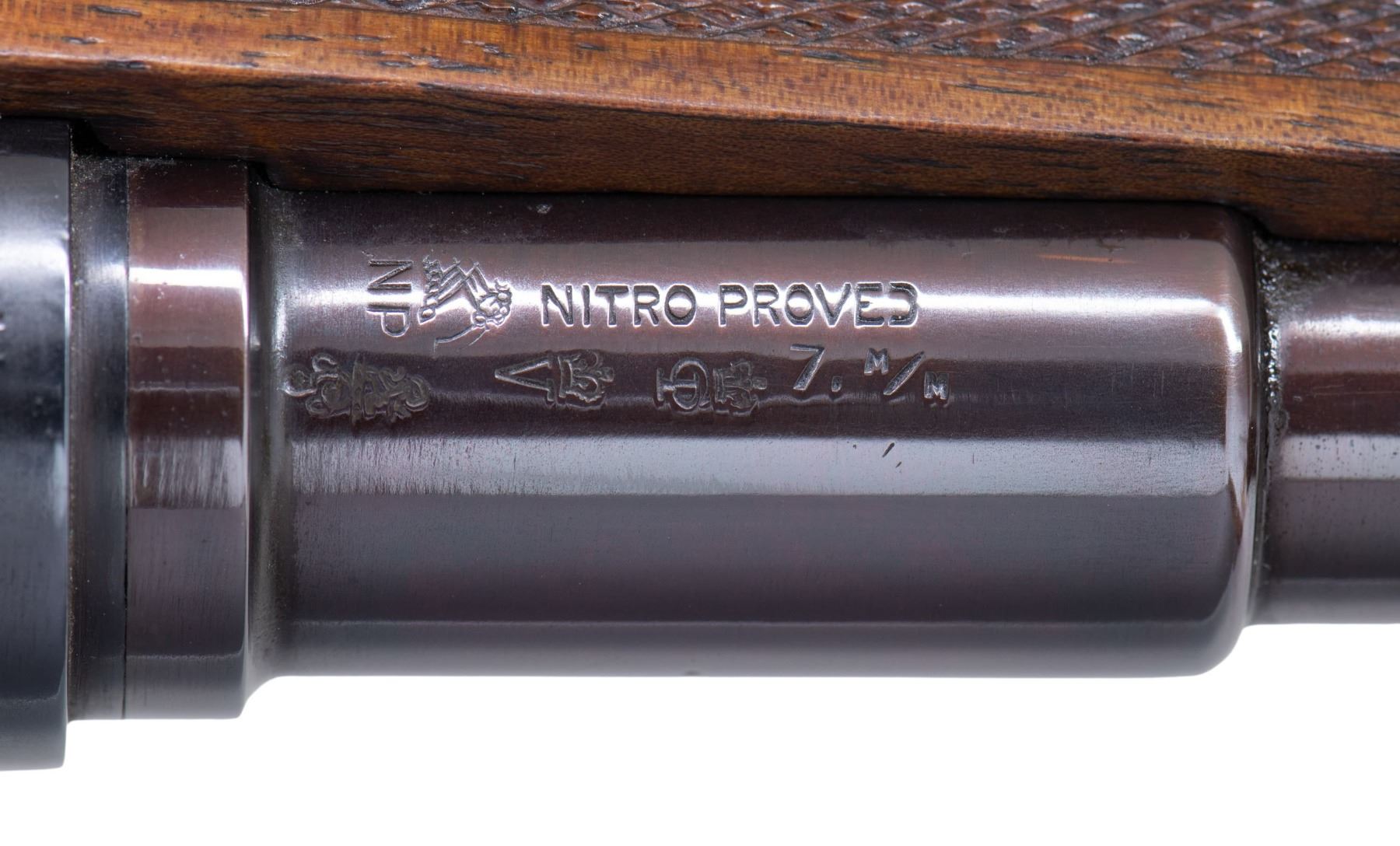 RIFLE RETAILED BY ARMY & NAVY CSL. Cal. 7x57. S# 53. This rare commercially proofed 1896 Mauser rifle was first retailed by Army & Navy CSL of London. It has 24" round barrel fitted with island rear base holding unusual three leaf express rear sight; silver bead with flip up night sight is in sleeved on front ramp. Top of barrel is engraved "Shot and Regulated by Army & Navy C.S.L. London. Model 1896 Mauser action is marked with Mauser name and address on receiver ring and dated "1896". Bolt has handle turned down. Bottom metal remains in military configuration. Round knob pistol grip stock is neatly checkered. This basic rifle has been dramatically enhanced with superb engraving and some careful stock detailing. This rifle's description was featured in 1993 "Guns Australia" magazine. The description of the embellishment is as follows: "This gun has a unique history. Previous owner Colin King of Australia commissioned master engraver Bruce Dean to rework the gun with the artfully done reminders of Australia. The trigger guard and floor plate are relief engraved with two of Australia's favorite game animals, a wild boar and Sambar stag. These are surrounded by Australian flannel flower in intertwined deep relief scroll with a stippled background. A Neidner style steel buttplate was deep relief chiseled and pierced wtih the same flannel flower motif. A toe-line cartridge trap was added and engraved "7x57" and "Mauser". Finally, to top it all off, the bolt handle was chiseled into a feral goat head with stippled surface and a ring of flannel flowers. The English walnut stock is excellent as professionally re-finished and features a swept pistol grip and shell-lip forearm. Generous, wrap around checkering with mullered borders covers the grip and forearm."To further refine the description it should be pointed out that there is a black Morocco leather lining behind the superb work on the buttplate. The buttplate and cartridge trap are neatly outlined with incised mouldings. The lettering on the cartridge trap cover is in full relief and is exquisitely done. Other well engraved accents are found on sides of trigger guard bow and more flannel flowers are found on bolt stop. Action screws and cartridge trap screws are also relief carved with flannel flowers. The quality of this work can not be overstated. MEASUREMENTS: WEIGHT: 6 lb. 12 oz. CONDITION: very fine as refinished. Barrel and action retaining nearly all an immersion re-blue; lettering is somewhat washed. Bottom metal cartridge trap, buttplate and bolt are bright polish and show some toning. Stock has a few marks and dings. Bore is shiny with strong rifling throughout. Mechanically fine. This incredible piece of work could be enhanced with a sympathetic refinish of the barrel and receiver. PROVENANCE: Photocopy of internet information regarding "Guns Australia" article pertaining to this rifle. (01-27278/MGM). ANTIQUE. $5,000-8,000.