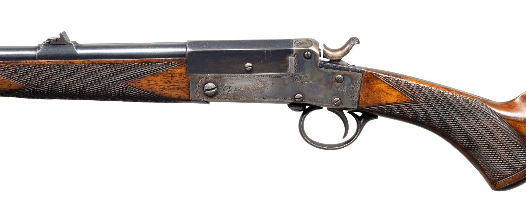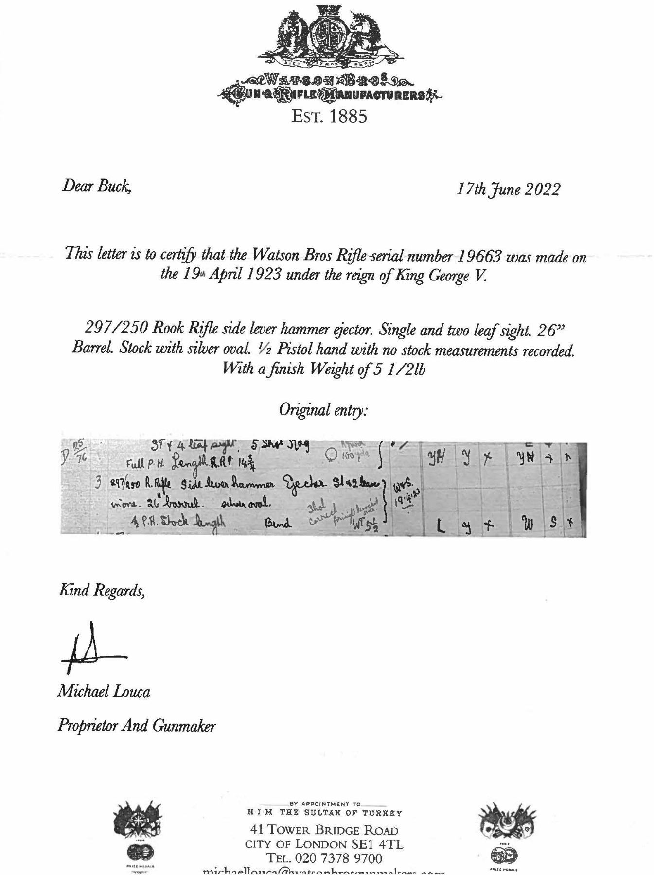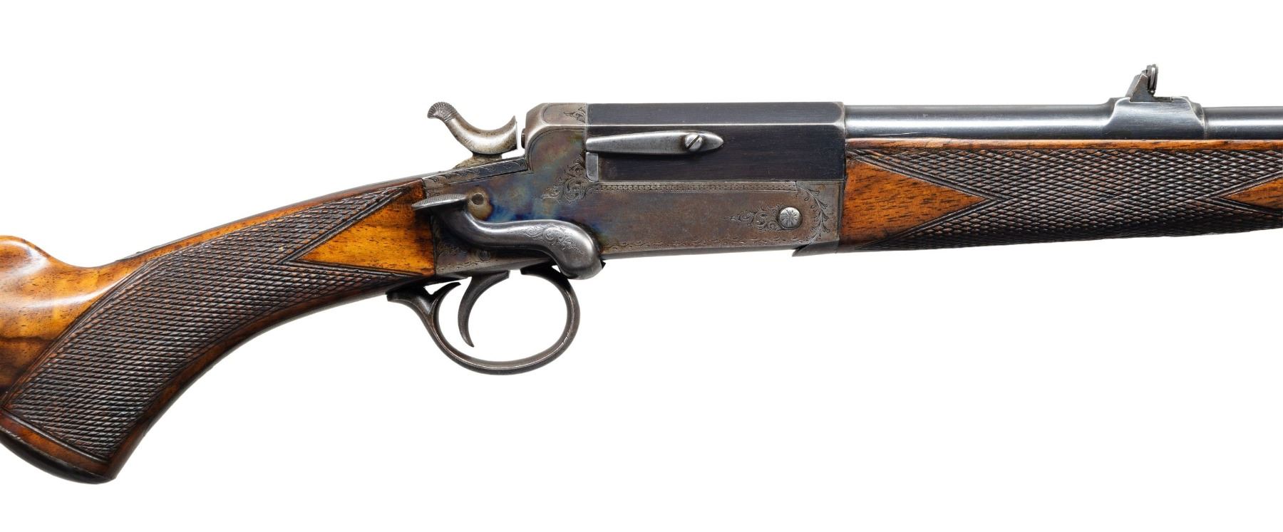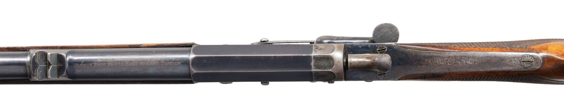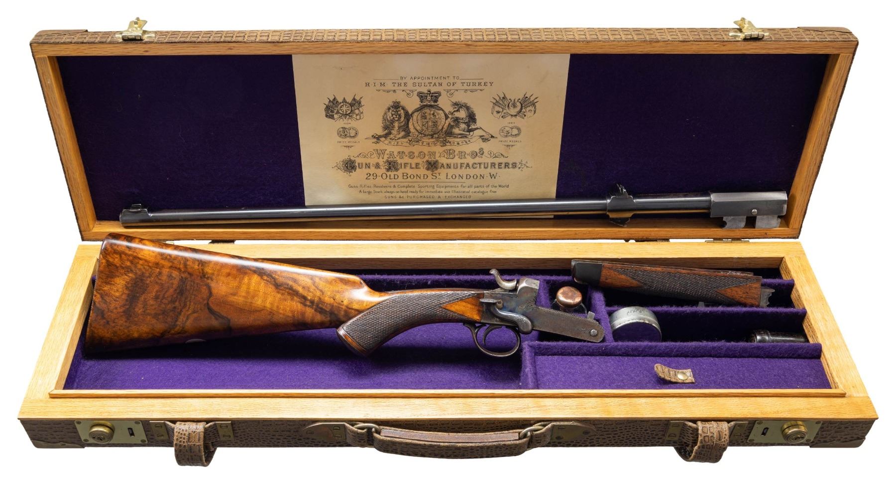 WITH ALLIGATOR PATTERN OAK AND LEATHER CASE AND FACTORY LETTER. Cal. 297/250 Rook. S# 19663. The 26" steel barrel has octagonal breech, combined rear sight base/loop and front sight base turned integral. Top is engraved "Watson Bros 29 Old Bond Street. London." behind one standing, two folding nested leaf express rear sight. Bottom of barrel is stamped with Birmingham proof and caliber. Webley S# is on loop. Case hardened side lever tip-down boxlock hammer ejector action is engraved with well cut sprays of scroll. Watson S# is on trigger guard bow. Steel capped pistol grip buttstock is made of a truly fine piece of beautifully marbled and slightly stump figured flesh tone Circassian walnut and measures 14-1/2" over checkered wood butt. Point pattern checkering is at grip and a vacant silver oval is on toeline. Matching small splinter forend with horn tip has spring tension release. UNATTACHED ACCESSORIES: rifle is housed in interesting good quality oak and alligator patterned leather case with brass corners; lined in purple felt. Case has zippered canvas and leather outer cover. A reproduction Watson label is in lid. Case contains: glass oil bottle, rosewood vaseline jar, tin with patches and some targets. Also included a factory letter w/envelop dated June 17, 2022 from Watson Bros. CONDITION: very fine. Barrel retaining about 90% original blue with high edge wear and a rub from cleaning on left side with light pitting remaining. Action retains most of its original case hardening color, browned and thinned around bottom and shows cleaning on left side. Stocks retain most of their oil finish with some light marks. Bore is fair with deep pits toward breech end; good rifling toward muzzle. Mechanically good with ejectors strong. Case is very fine "near new" as is outer cover with some rubs. Label is lightly foxed. PROVENANCE: From the Buckstix Collection. (01-28616/MGM). ANTIQUE. $3,500-5,500.