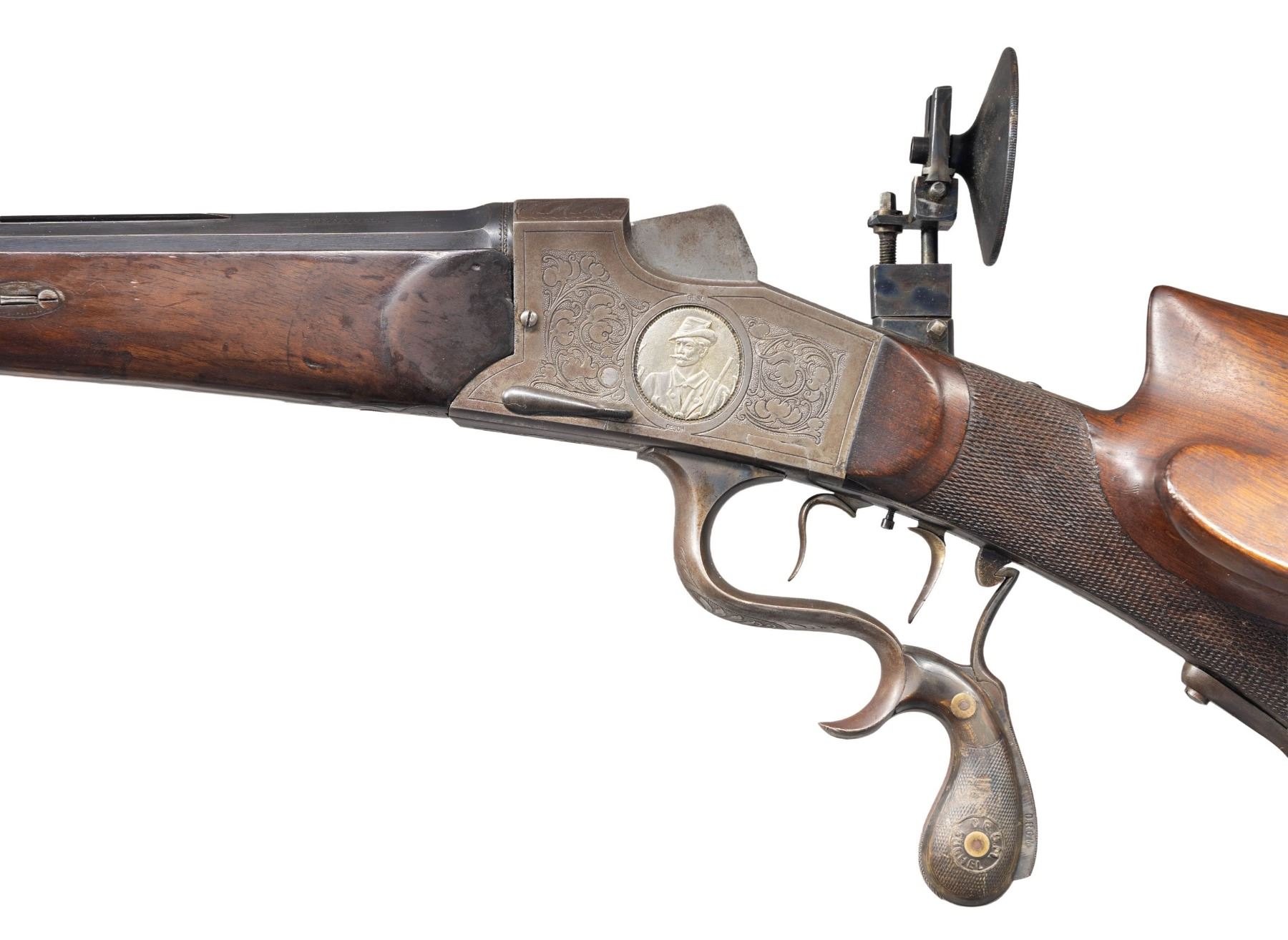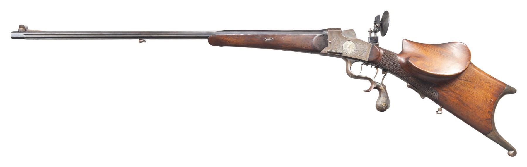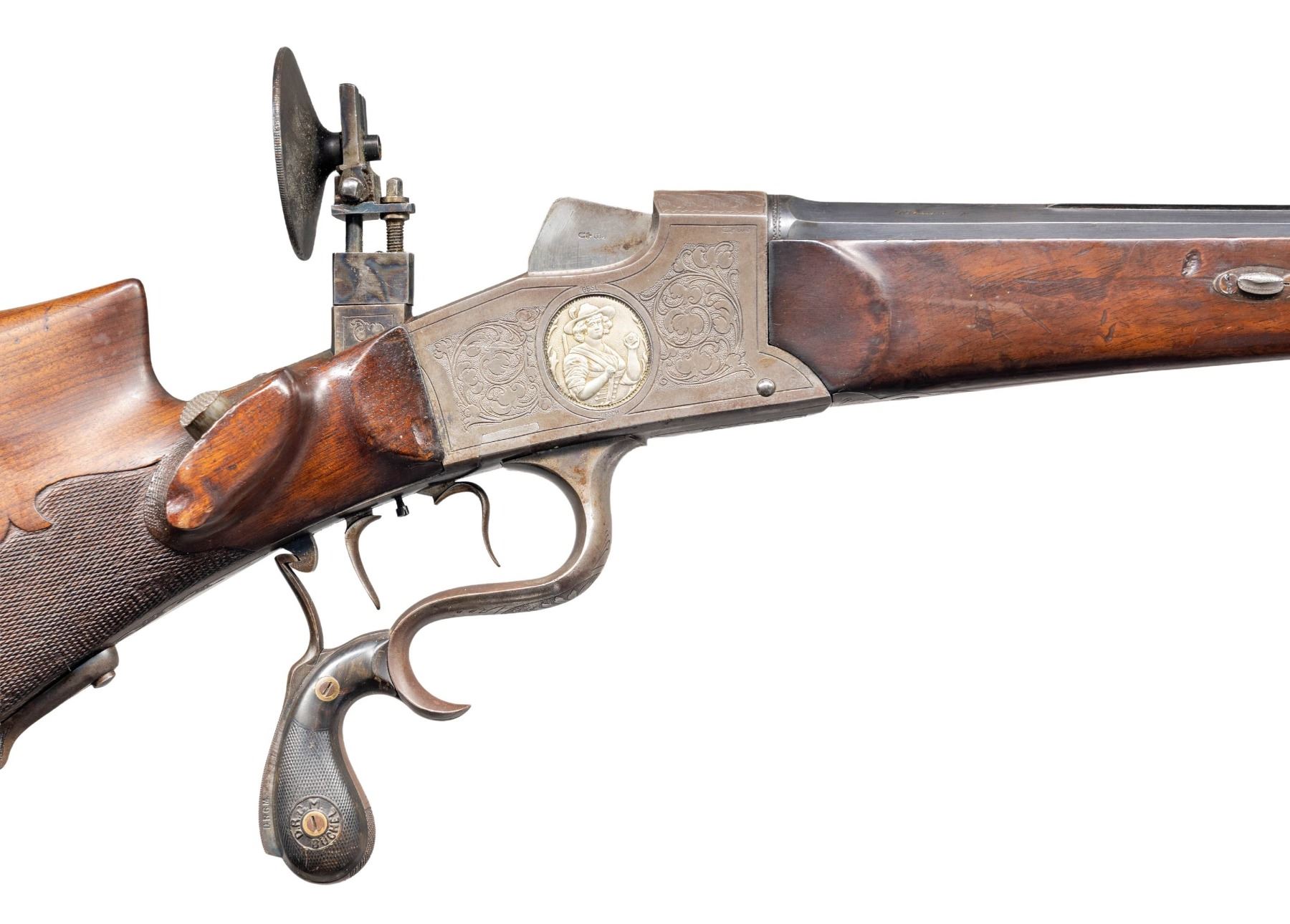 Cal. 8.15x46R. S# 923 (Found on inside of action tang with trigger group removed and on front of action forend removed. Also on forend bolt). The 31-3/4" fluted octagon barrel has milled in broad base for barrel sight and peg front sight in long ramp with protective ears. Action, with lever removable breech block and trigger/firing group, is silver inlaid "BUCHEL" "MEISTER" "D.R.G.M." on top tang. Tang is fitted with base for large windage and elevation adjustable Diopter sight which is present but not original. Action is engraved with panels of large scrolling acanthus in shaded background surrounding oval relief silver portraits of jaeger on left and bar maid holding target on right. "GESON" is stamped under each portrait. Opening lever with finger spur has checkered horn grips embossed "D.R.G.M. BUCHEL". Triggers are double set. Schuetzen style buttstock made of plain European walnut is fitted with heavy steel hook buttplate. A right hand high Schuetzen cheekpiece is on left. Thumb rest on right side holds checkered safety that must be depressed before rifle can be fired. Fancy pattern checkering is around grip. Uncheckered matching forend attaches to barrel with sidebolt. UNATTACHED ACCESSORIES: rifle comes with a brown plastic case. CONDITION: good to very good. Barrel retaining most of what appears to be original blue. Some case color remains on action which is mostly brown. Replaced Diopter sight has most of its case color. Stocks have oil refinish over marks both light and heavy. Bore is very fine. Mechanically good. PROVENANCE: From the Buckstix Collection. (01-28644/MGM). CURIO. $2,000-3,000.