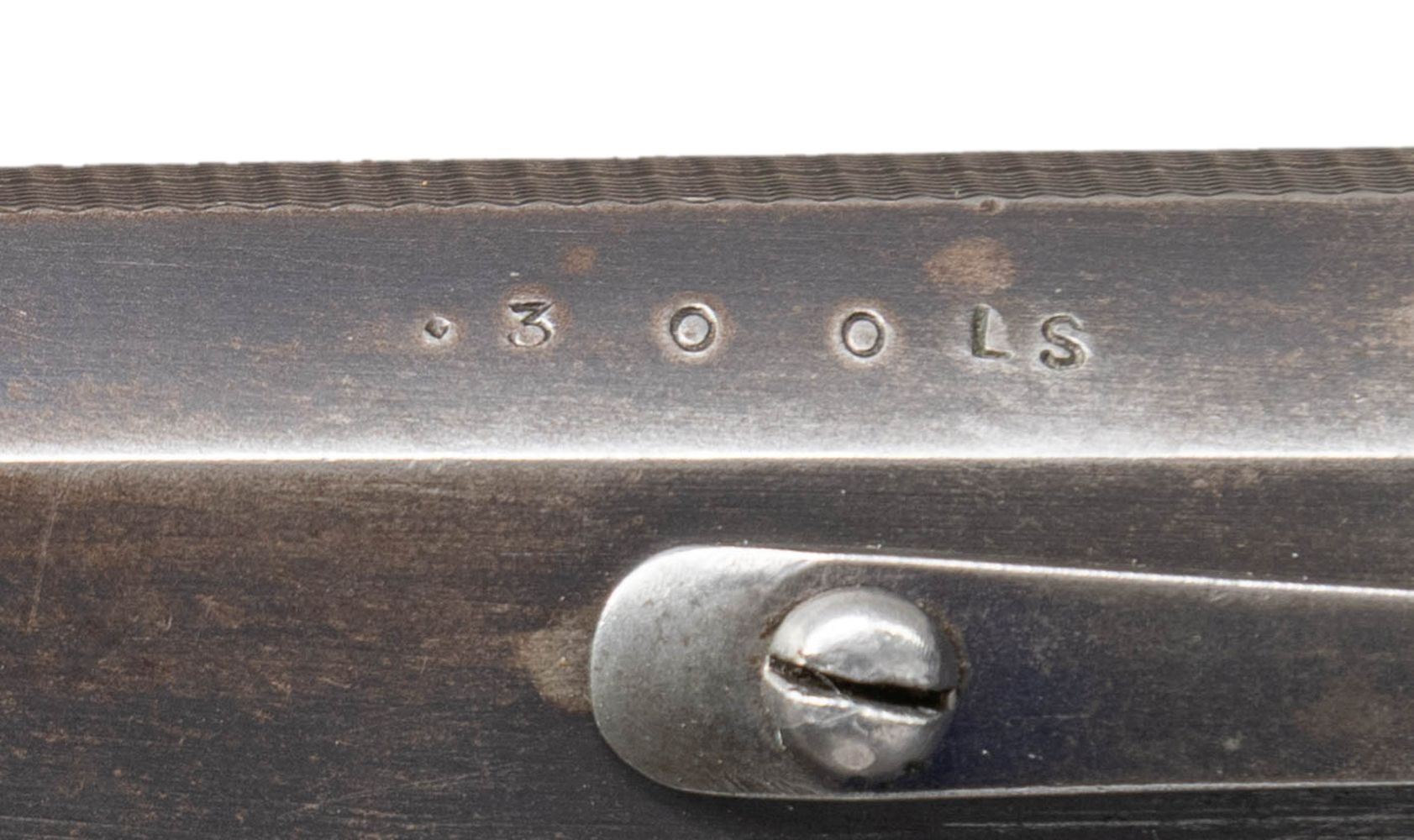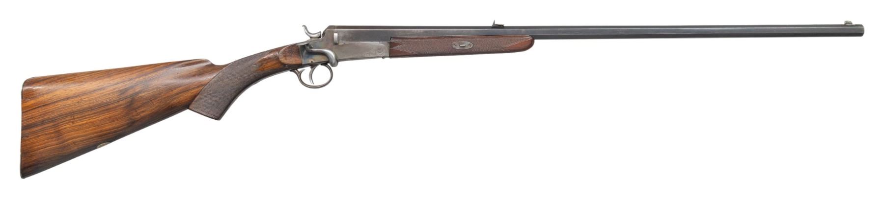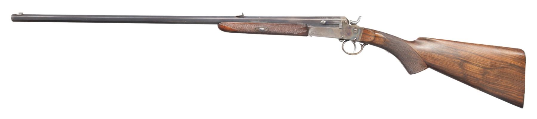 Cal. 300 Long Shot. S# 5530. Oct. 26" bbl. having Belgian post 1893 proofs. Top of barrel has matted surface with blade front sight & 2 leaf rear sight. Case hardened side-lever opening action. Checkered walnut stock set w/ wedge for forearm, German silver oval toeline nameplate, checkering, heel & toeplates on butt. UNATTACHED ACCESSORIES: padded 2 compartment takedown case. CONDITION: fair worn blue with edge wear, brown patina & light pitting near chamber. Fair case colors in protected areas with cleaned appearance on bottom tang, fading to gray in carry areas with scattered spots of pitting. Fair worn wood finish with sm. gouges in checkering & dings. Fair worn rifling. PROVENANCE: From the Buckstix Collection. (25-7026/MD). CURIO. $800-1200.