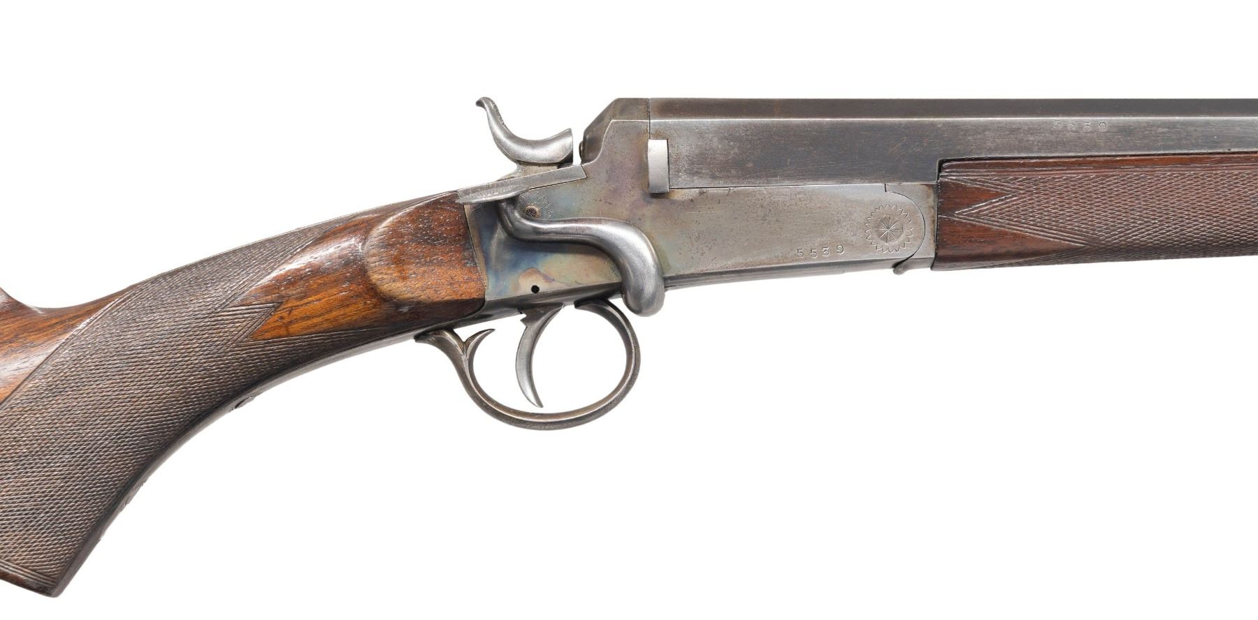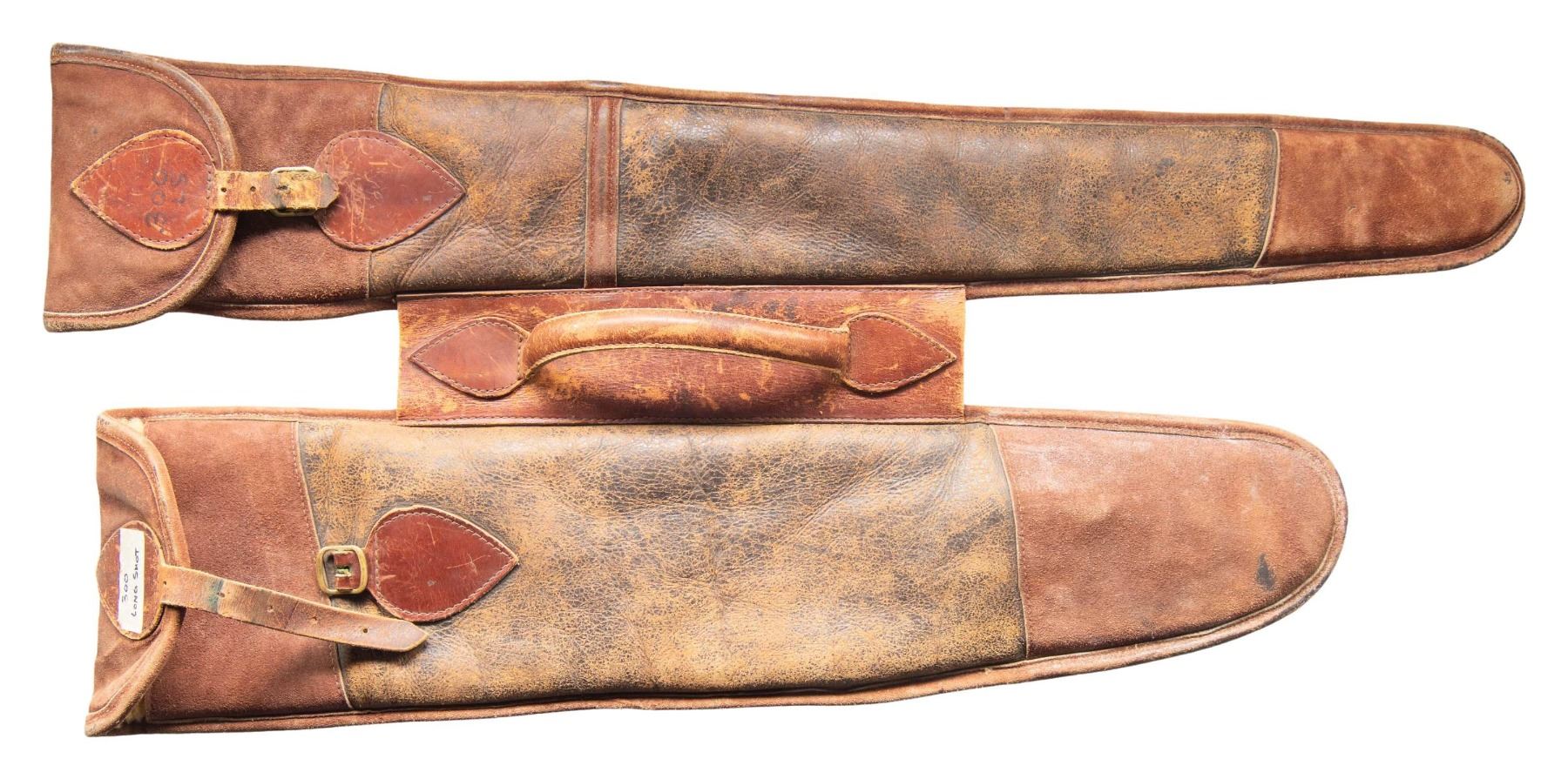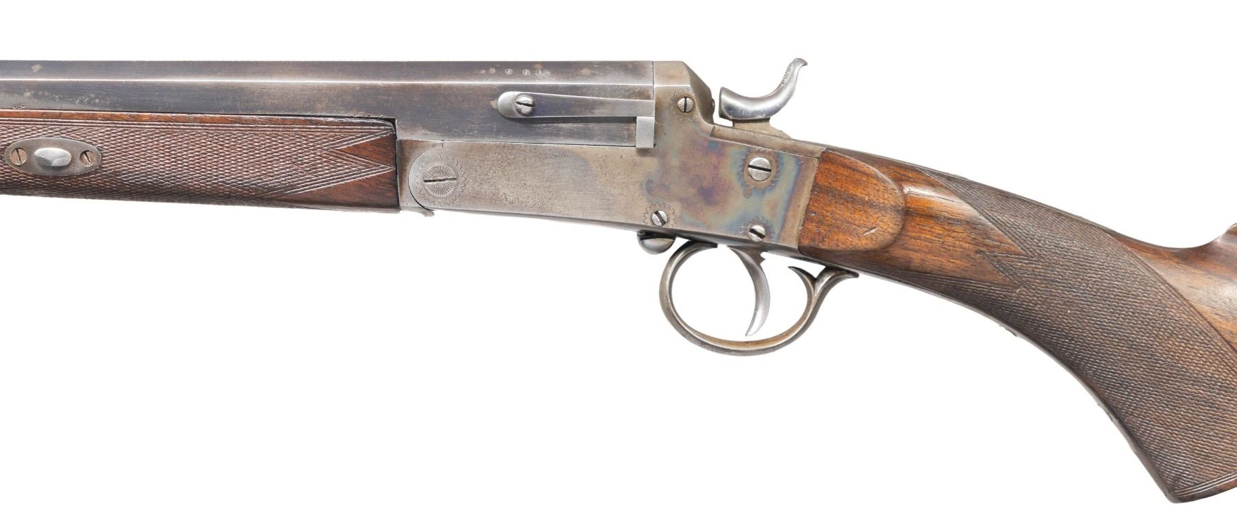 Cal. 300 Long Shot. S# 5530. Oct. 26" bbl. having Belgian post 1893 proofs. Top of barrel has matted surface with blade front sight & 2 leaf rear sight. Case hardened side-lever opening action. Checkered walnut stock set w/ wedge for forearm, German silver oval toeline nameplate, checkering, heel & toeplates on butt. UNATTACHED ACCESSORIES: padded 2 compartment takedown case. CONDITION: fair worn blue with edge wear, brown patina & light pitting near chamber. Fair case colors in protected areas with cleaned appearance on bottom tang, fading to gray in carry areas with scattered spots of pitting. Fair worn wood finish with sm. gouges in checkering & dings. Fair worn rifling. PROVENANCE: From the Buckstix Collection. (25-7026/MD). CURIO. $800-1200.