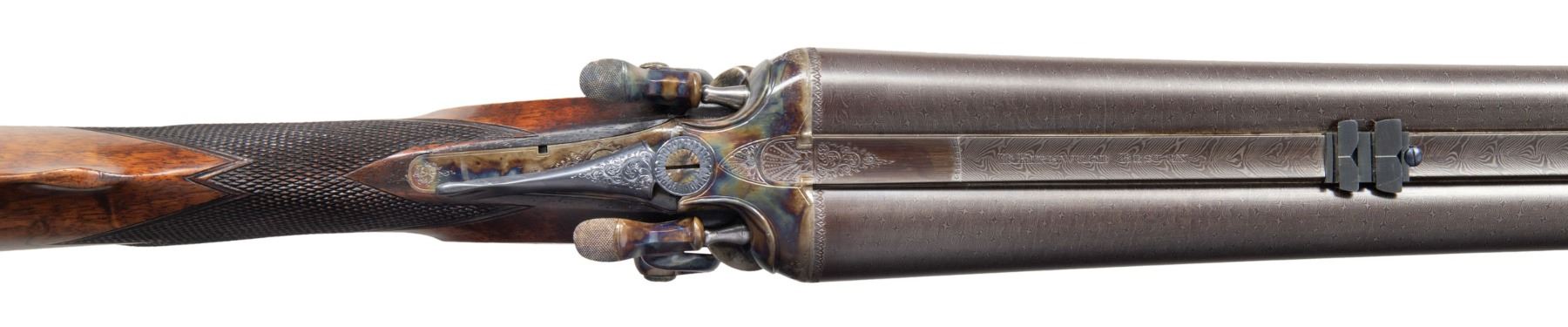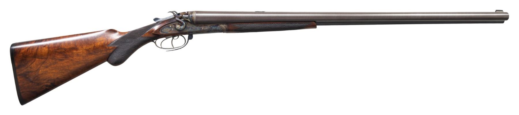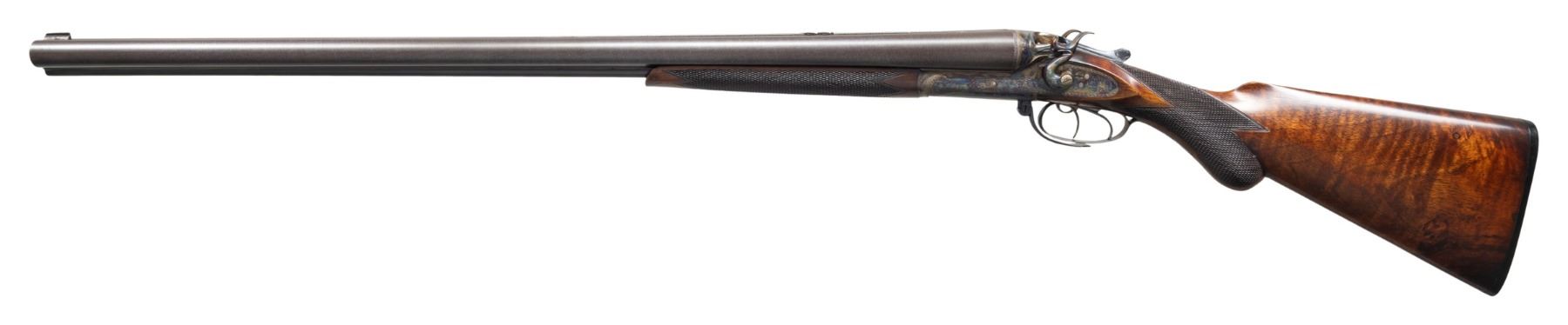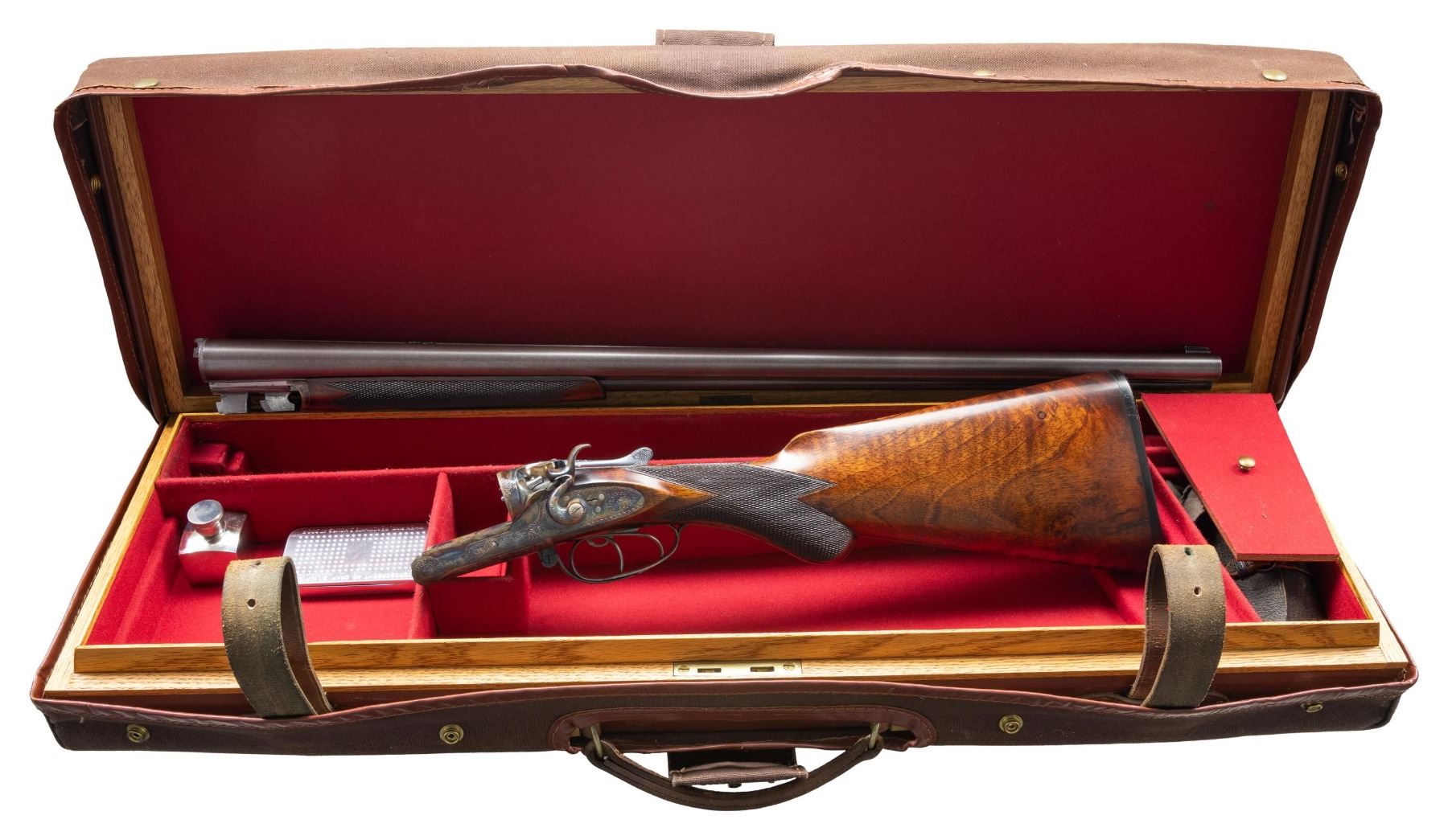 Cal. 12 X 12Ga. 2-3/4" (both) / 32-20. S# NSN. Among the Kirkwood guns Berrien collected were a group found in the old Kirkwood shop that were nearly complete with stocks finished, barrels regulated, but with metal left "in the white" to be finished to customers specifications. "B" chose this gun to have contemporary artisans finish it. This cataloger was instrumental in getting the work done with engraving by Frank Conroy, barrel brown by Keith Kearcher and case color by Doug Turnbull. Stocks only needed to have some oil rubbed in as they were already finished and checkered. The 28" three stripe damascus barrels are engraved "D. Kirkwood. Boston" on narrow game rib. Rib is fitted with two folding leaf rear sight and longitudinally dovetailed white bead front. No marks are found on barrels. Round bodied top lever action is fitted with front spring rebounding locks having nicely filed serpentine hammers. Drilling features independent rifle firing mechanism with a cocking lever that wraps over and pivots in front of trigger guard. Rifle is fired by separate looped trigger that is in front of and above trigger for right barrel. A pin type cocking indicator is on top tang. Action is engraved with about 50% coverage very nicely cut scroll within scroll and line borders. "D. Kirkwood" is on each lockplate. Lightly streaked and stump figured European walnut round knob pistol grip buttstock measures 13-7/8" over original hand checkered hard rubber buttplate. Well cut point pattern checkering wraps over grip. Matching splinter forend with inlet ebony tip has spring tension release. MEASUREMENTS: BBLS: Bore Diameter: L .731. R .730. Restriction: L .027 (IMod). R .029 (full). Wall thickness: L .034. R .032. STOCK: DAH: 2-3/4". DAC: 1-9/16". CAST: neutral. LOP: 13-7/8". WEIGHT: 8 lb. 6 oz. UNATTACHED ACCESSORIES: gun is housed in new high quality oak and leather case with brass corners; lined in scarlet cloth. Case has dark canvas leather trimmed outer cover. Interior contains: two piece wood and brass cleaning rod with mop and brush, a pull through cleaning kit and a square oil bottle. CONDITION: exceptionally fine. Appearing unfired. Metal retaining all professionally applied finishes. Wood has a fair scattering of minor marks associated with being stored over 80 years at Kirkwood's in Boston. Bores are bright and shiny. Action is tight. Mechanically crisp. Case is exceptionally fine, "near new". PROVENANCE: From the Private Collection of Berrien Moore III. (01-28459/MGM). ANTIQUE. $3,000-5,000.