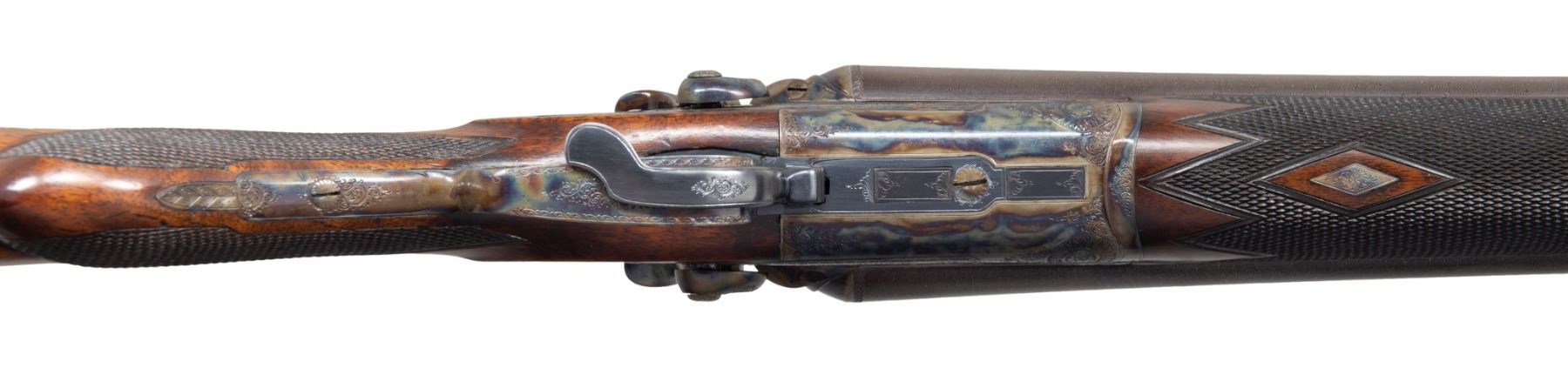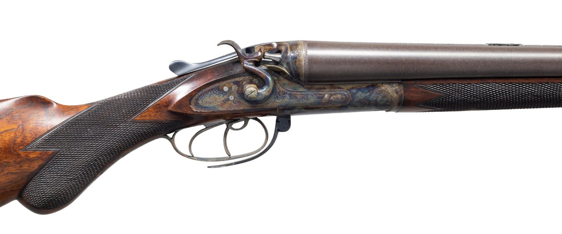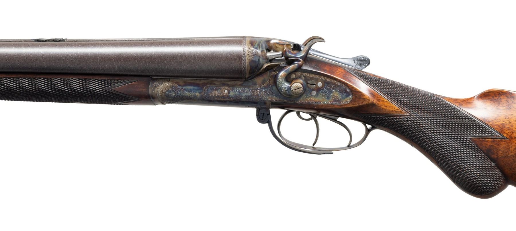 Cal. 12 X 12Ga. 2-3/4" (both) / 32-20. S# NSN. Among the Kirkwood guns Berrien collected were a group found in the old Kirkwood shop that were nearly complete with stocks finished, barrels regulated, but with metal left "in the white" to be finished to customers specifications. "B" chose this gun to have contemporary artisans finish it. This cataloger was instrumental in getting the work done with engraving by Frank Conroy, barrel brown by Keith Kearcher and case color by Doug Turnbull. Stocks only needed to have some oil rubbed in as they were already finished and checkered. The 28" three stripe damascus barrels are engraved "D. Kirkwood. Boston" on narrow game rib. Rib is fitted with two folding leaf rear sight and longitudinally dovetailed white bead front. No marks are found on barrels. Round bodied top lever action is fitted with front spring rebounding locks having nicely filed serpentine hammers. Drilling features independent rifle firing mechanism with a cocking lever that wraps over and pivots in front of trigger guard. Rifle is fired by separate looped trigger that is in front of and above trigger for right barrel. A pin type cocking indicator is on top tang. Action is engraved with about 50% coverage very nicely cut scroll within scroll and line borders. "D. Kirkwood" is on each lockplate. Lightly streaked and stump figured European walnut round knob pistol grip buttstock measures 13-7/8" over original hand checkered hard rubber buttplate. Well cut point pattern checkering wraps over grip. Matching splinter forend with inlet ebony tip has spring tension release. MEASUREMENTS: BBLS: Bore Diameter: L .731. R .730. Restriction: L .027 (IMod). R .029 (full). Wall thickness: L .034. R .032. STOCK: DAH: 2-3/4". DAC: 1-9/16". CAST: neutral. LOP: 13-7/8". WEIGHT: 8 lb. 6 oz. UNATTACHED ACCESSORIES: gun is housed in new high quality oak and leather case with brass corners; lined in scarlet cloth. Case has dark canvas leather trimmed outer cover. Interior contains: two piece wood and brass cleaning rod with mop and brush, a pull through cleaning kit and a square oil bottle. CONDITION: exceptionally fine. Appearing unfired. Metal retaining all professionally applied finishes. Wood has a fair scattering of minor marks associated with being stored over 80 years at Kirkwood's in Boston. Bores are bright and shiny. Action is tight. Mechanically crisp. Case is exceptionally fine, "near new". PROVENANCE: From the Private Collection of Berrien Moore III. (01-28459/MGM). ANTIQUE. $3,000-5,000.