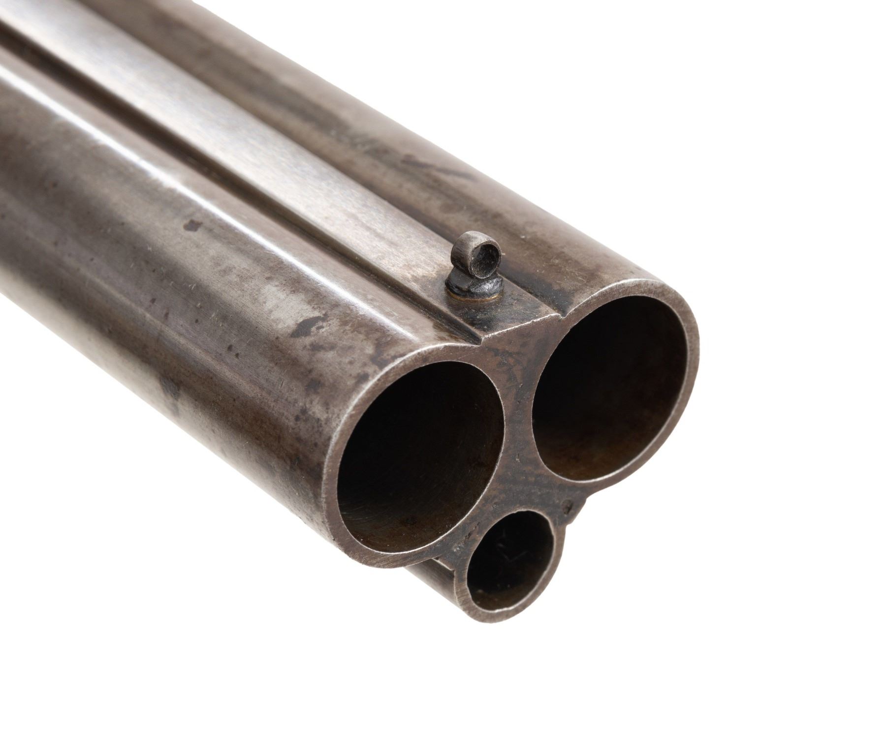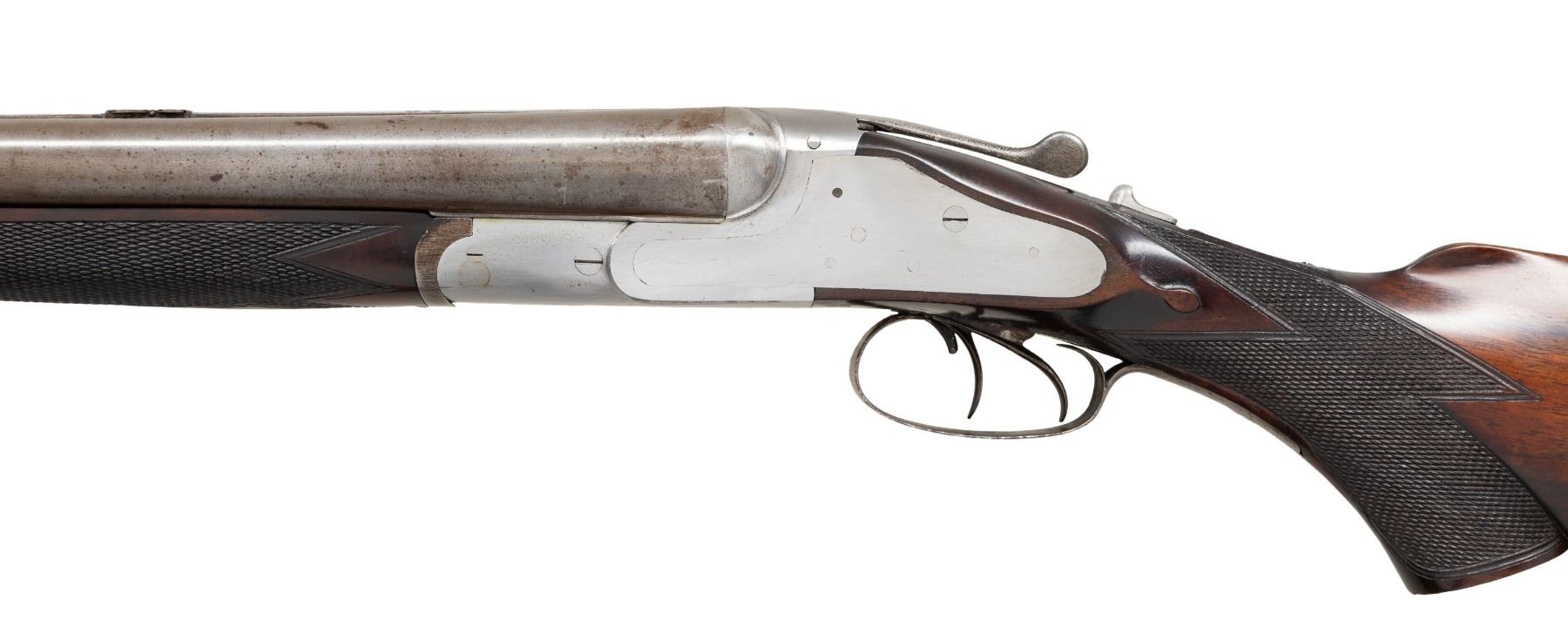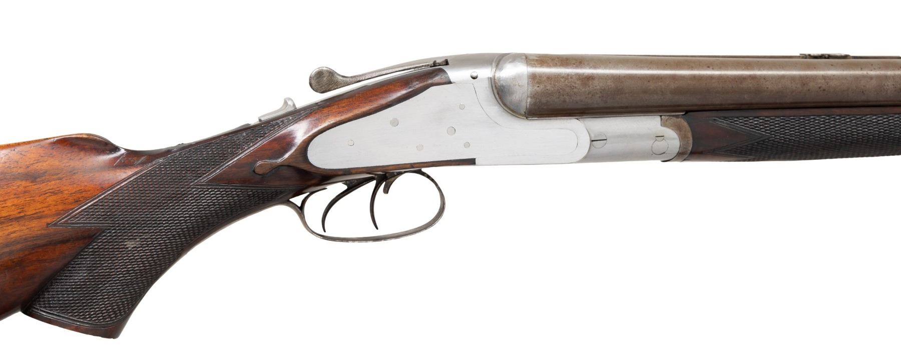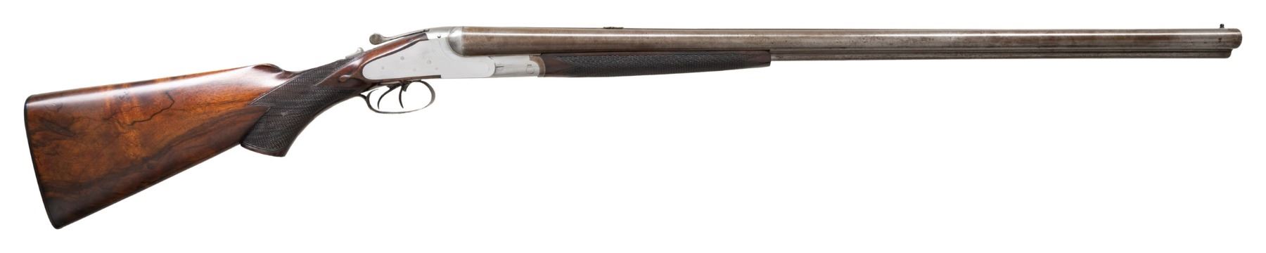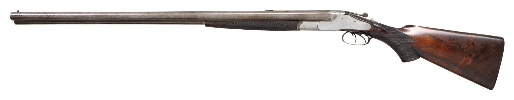 Cal. 12 x 12 2-3/4" (both) / 38-55. S# NSN. One of the unfinished guns retrieved from Kirkwood Brothers when the building was closed this interesting gun has 30" damascus barrels fitted with narrow flat top rib. Rib holds two folding leaf rear and see through front sights. Bottoms of shotgun barrels are stamped with Birmingham provisional proofs. Action remains "in the white" and features non-automatic safety, Kirkwood top fastener and independent rifle lock work that is cocked by the drop of the barrels. Rifle barrel is fired by a short trigger located in front of and above trigger for right shotgun barrel. Well marbled and stump figured European walnut pistol grip buttstock measures 14-1/4" over hand checkered horn buttplate. Nicely cut point pattern checkering is at grip and well sculpted drop points are behind locks. Grip cap is missing. Matching splinter forend with inlet horn tip has spring tension release. MEASUREMENTS: BBLS: Bore Diameter: L .719. R .719. Restriction: L .025 (mod). R .026 (mod). Wall thickness: L .033. R .035. STOCK: DAH: 2-9/16". DAC: 1-7/16". CAST: neutral. LOP: 14-1/4". WEIGHT: 8 lb. 13 oz. CONDITION: unfinished. Barrels polished and have toned to gray. Action shows preliminary polishing overall. Stocks retain nearly all of there original finish with some storage marks. Bores are bright and shiny throughout. Action is tight. Mechanically good. PROVENANCE: From the Private Collection of Berrien Moore III. (01-28462/MGM). ANTIQUE. $1,500-2,500.