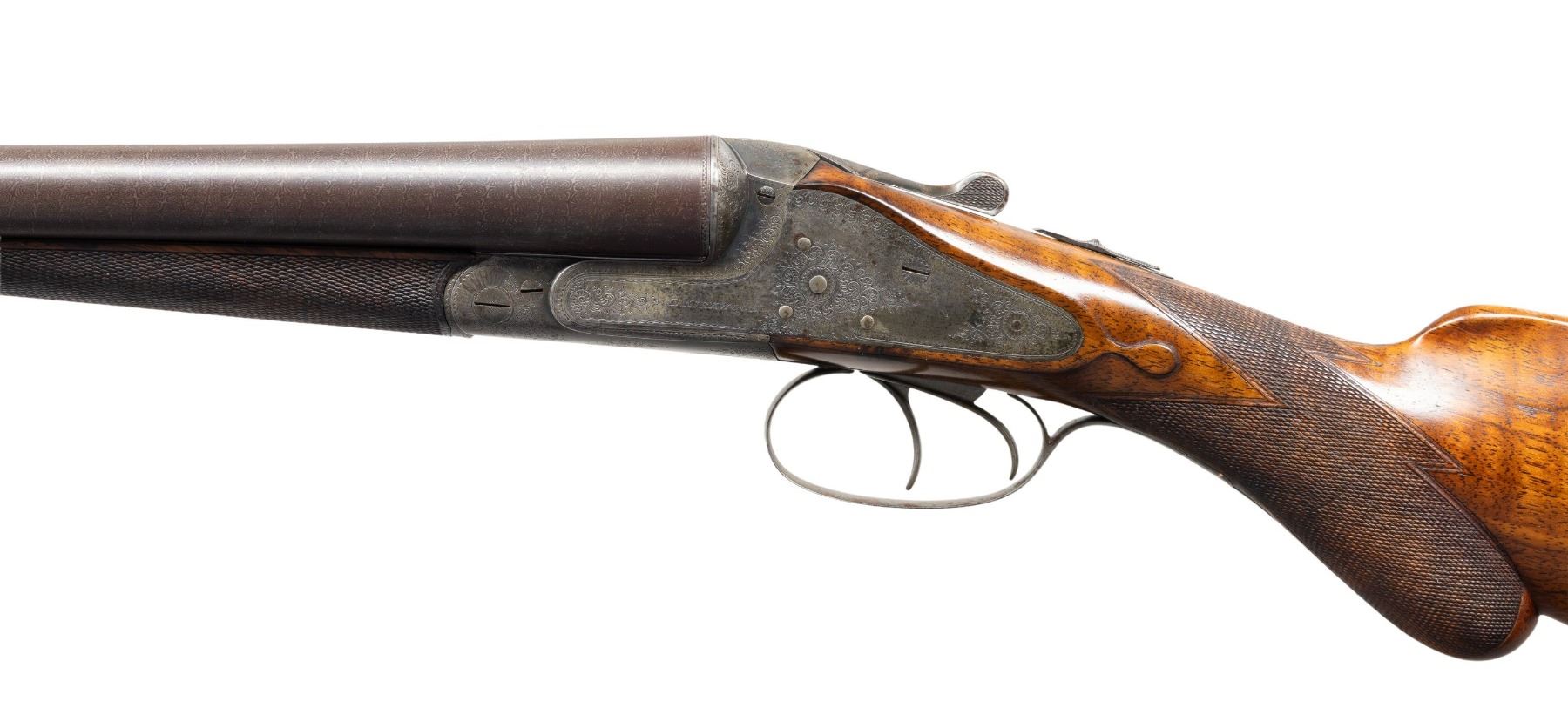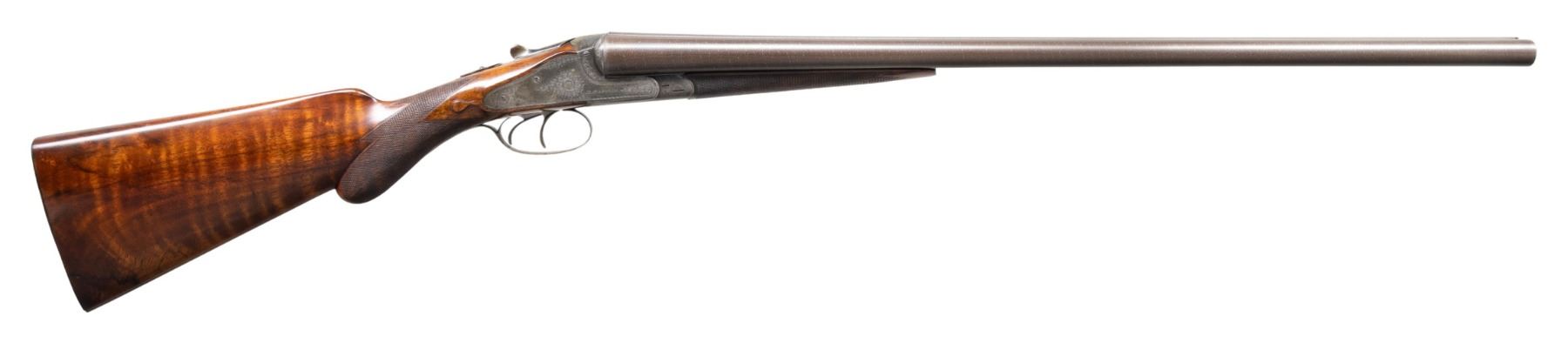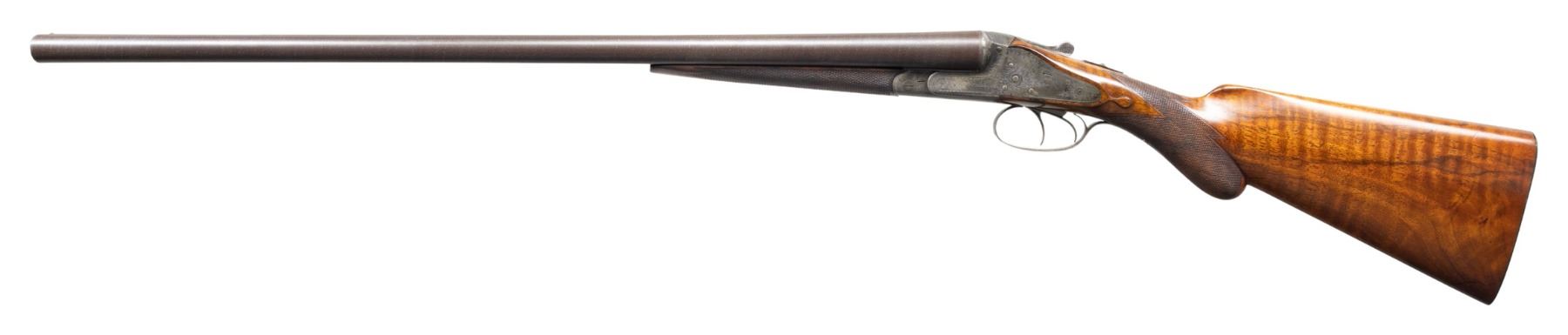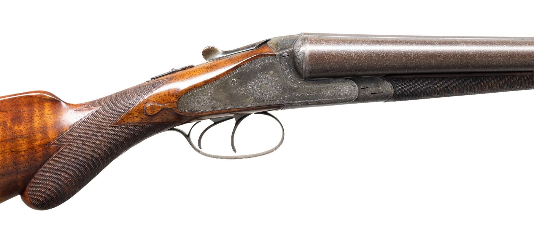 FEATHERWEIGHT SIDELOCK GAME GUN. Cal. 12 Ga. 2-5/8". S# 1296. Kirkwood advertised his featherweight guns to weigh as little as 5-1/4 lbs. in 12 gauge. It appears this gun was a special effort and tips the scales at 5lb. 1/2 oz. This was Berrien's first Kirkwood and sparked his interest in this superb American maker and his products. This gun has 26" fine three stripe damascus barrels engraved "D. Kirkwood. Boston" on narrow swamped game rib. Rib has usual Kirkwood square shouldered dolls head extension. Barrel flats are unmarked. Bottoms of barrels are stamped with British provisional proofs. Very slim and well filed back spring sidelock action features automatic safety which must be pulled backward to fire as if you were cocking a hammer gun. Action also features Kirkwood's usual top bite as well as Purdey type under bolts. Action is engraved with 50% coverage nicely cut small scroll. Each lockplate is engraved "D. Kirkwood". Steel trigger guard engraved with scroll on bow has S# on tang. Round knob Prince of Wales grip buttstock made of very nicely fiddle figured and lightly streaked European walnut measures 13-3/4" over very thin checkered horn buttplate. Buttstock has been hollowed to save weight and improve balance. It features David's typical long fluted comb, well cut multi-point pattern checkering and nicely shaped drop points. Matching splinter forend with inlet ebony tip has spring tension release. MEASUREMENTS: BBLS: Bore Diameter: L .731. R .730. Restriction: L .012 (light mod). R .007 (IC). Wall thickness: L .020. R .020 (both along bottoms of barrels otherwise mostly .025). STOCK: DAH: 2-13/16". DAC: 1-7/16"+. CAST: about 1/2" off. LOP: 13-3/4". WEIGHT: 5 lb. 1/2 oz. CONDITION: fine as partially refinished. Barrels retaining nearly all of a good quality re-brown with good definition to pattern. Action and lockplates retain about 50% original case hardening color that shows some darkening. Stocks lightly refinished with a few scattered marks. Checkering lightly worn. Bores are bright and shiny without noted problems except for minor dent removal in right barrel about 5" from muzzle. Action is tight. Mechanically good. A wonderful lightweight handmade gun. PROVENANCE: From the Private Collection of Berrien Moore III. (01-28451/MGM). ANTIQUE. $1,500-2,500.