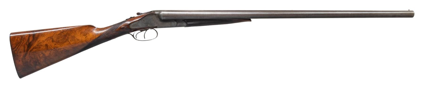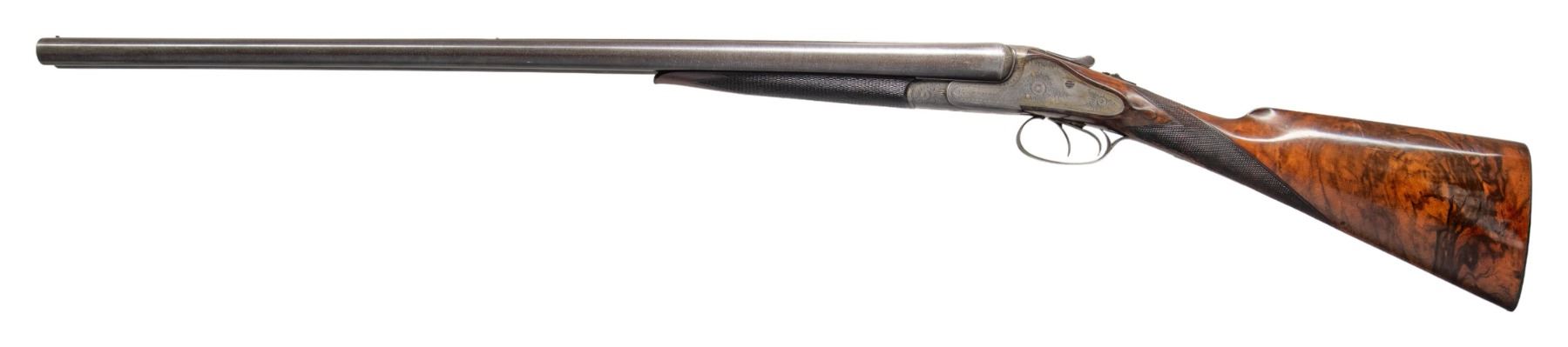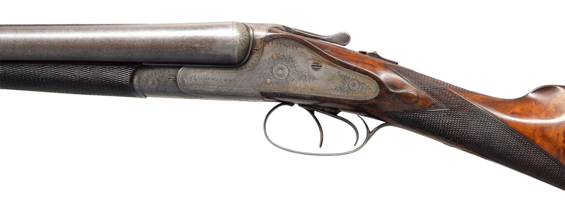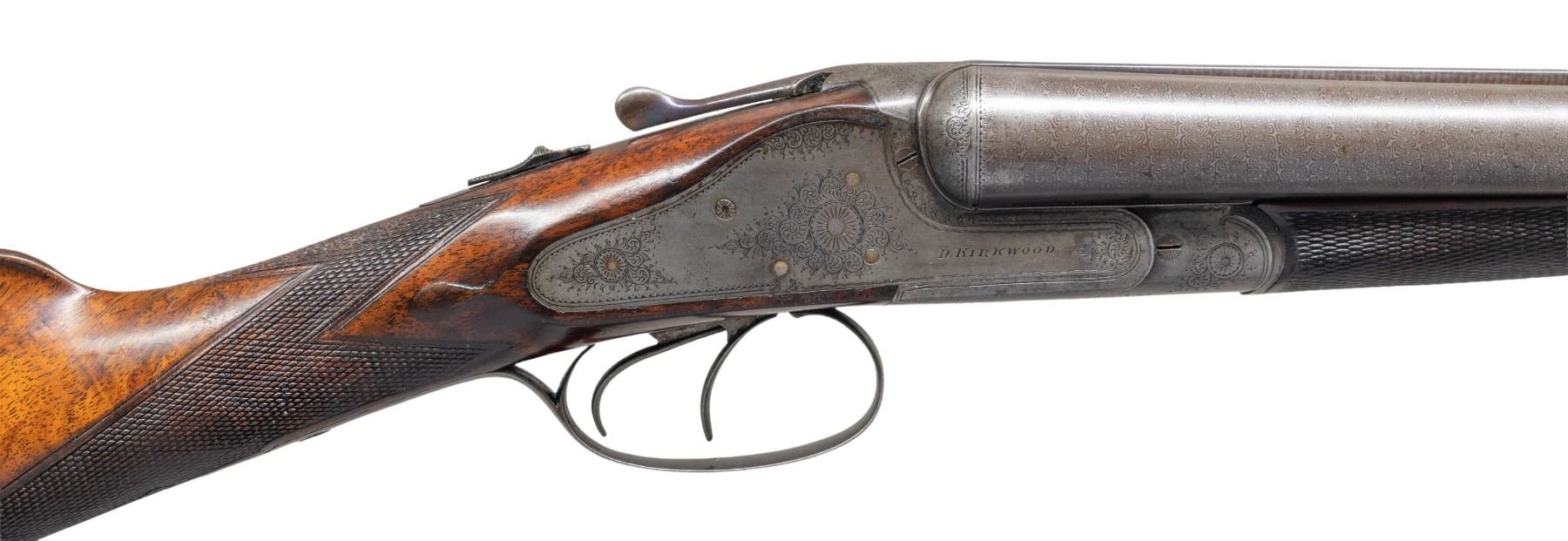 GUN. Cal. 12 Ga. 2-5/8". S# 1280. A fine example of this well made American gun which was most likely their standard $135.00 grade described as "English Damascus or Laminated Barrels, English Walnut Stock, Neatly Engraved and Well Finished". This gun has 27" three stripe damascus barrels engraved "D. Kirkwood" on swamped game rib. Bottoms of barrels are stamped with remnants of English provisional proofs. Case hardened action fitted with back spring sidelocks features automatic safety, sliding third fastener engaging dolls head rib extension and Purdey type dual under lugs. Action is nicely filed, as David apprenticed as an action filer at Mortimer's. Engraving consists of about 50% coverage nicely cut scroll. Each lockplate is engraved "D. Kirkwood". Trigger guard with scroll on bow has S# on short tang. Strikingly stump figured and marbled European walnut straight grip buttstock measures 14-1/8" over hand checkered thin horn buttplate. Well cut point pattern checkering wraps completely around grip (the mark of expert layout). Nicely shaped drop points are also present. Matching splinter forend with inlet slightly schnabled ebony tip has spring tension release. MEASUREMENTS: BBLS: Bore Diameter: L .730. R .728. Restriction: L .032 (full). R .014 (mod). Wall thickness: L .025. R .029. STOCK: DAH: 2-1/4". DAC: 1-1/2"+. CAST: about 5/8". LOP: 14-1/8". WEIGHT: 5 lb. 13 oz. CONDITION: very fine. Barrels retaining over 70% original damascus brown showing off very fine pattern. Action retains about 70% original muted case hardening color. Stocks retain over 90% original varnish finish with a good scattering of light marks and dings. Checkering is lightly worn and shows re-cutting after repair of crack at wrist. Bores are very fine; shiny with some light frosting. Action is tight. Mechanically fine. Expert repair of crack through wrist is evident upon close inspection and appears to be very strong. One can truly appreciate David's fine work by comparing the fit and finish of this gun with any offering from the "Best" British makers. PROVENANCE: From the Private Collection of Berrien Moore III. (01-28458/MGM). ANTIQUE. $2,000-4,000.