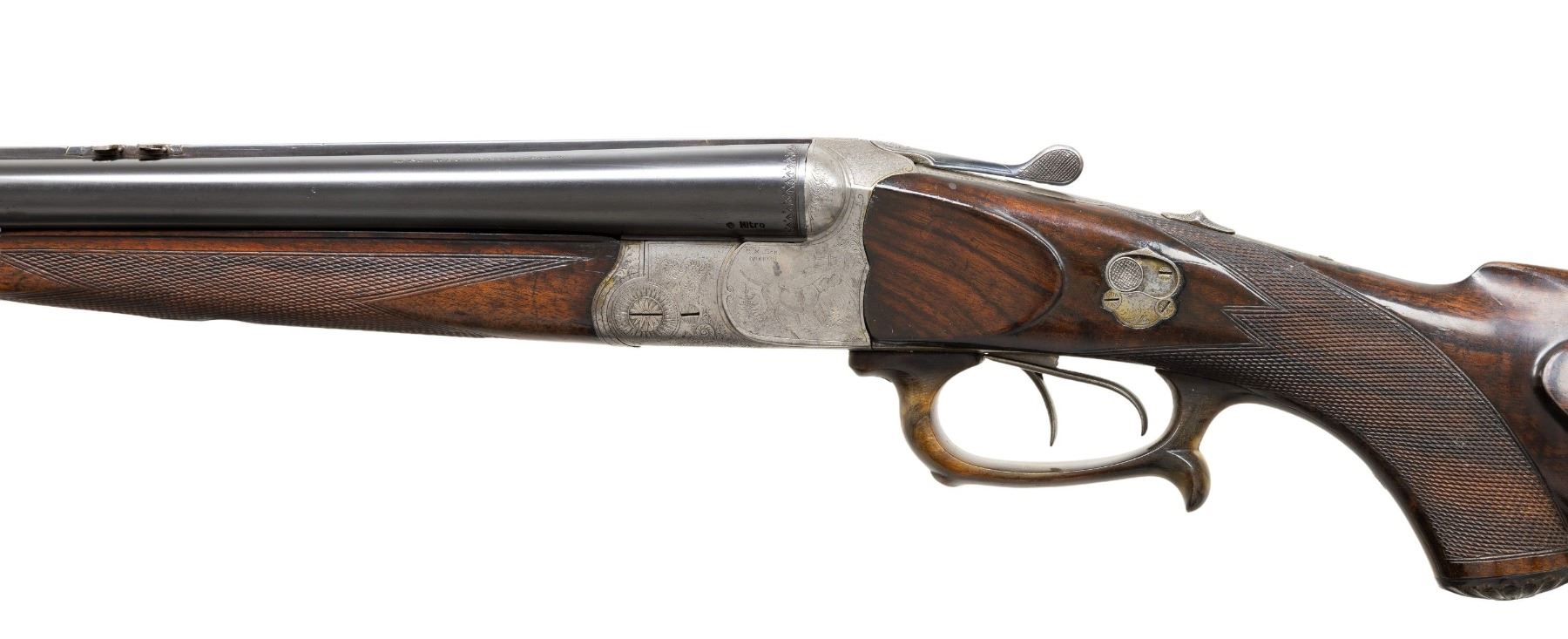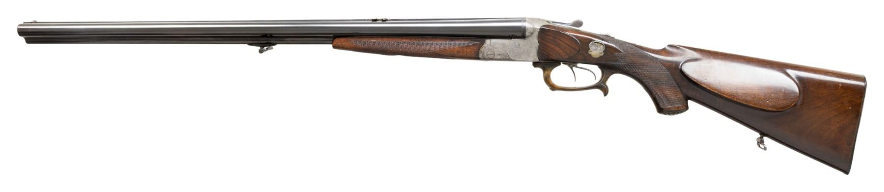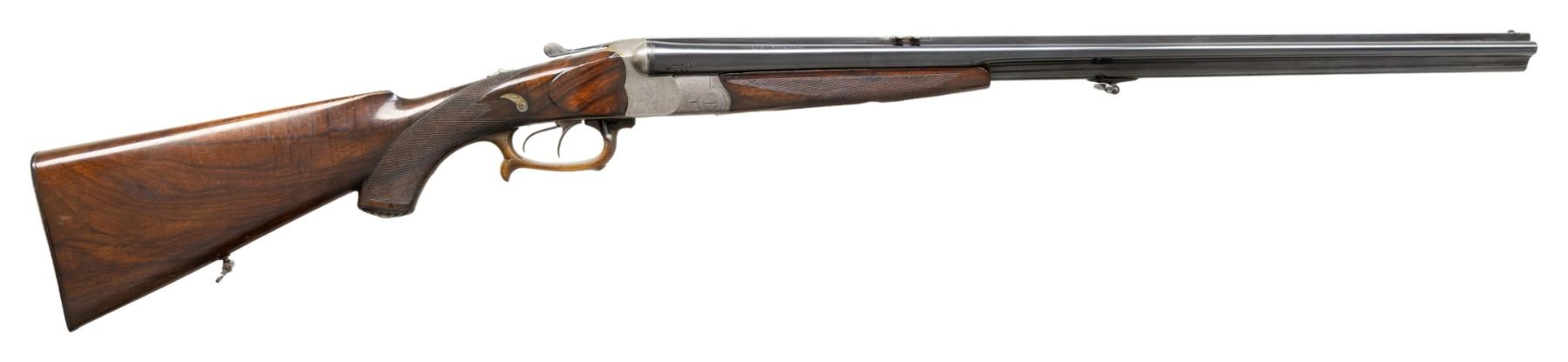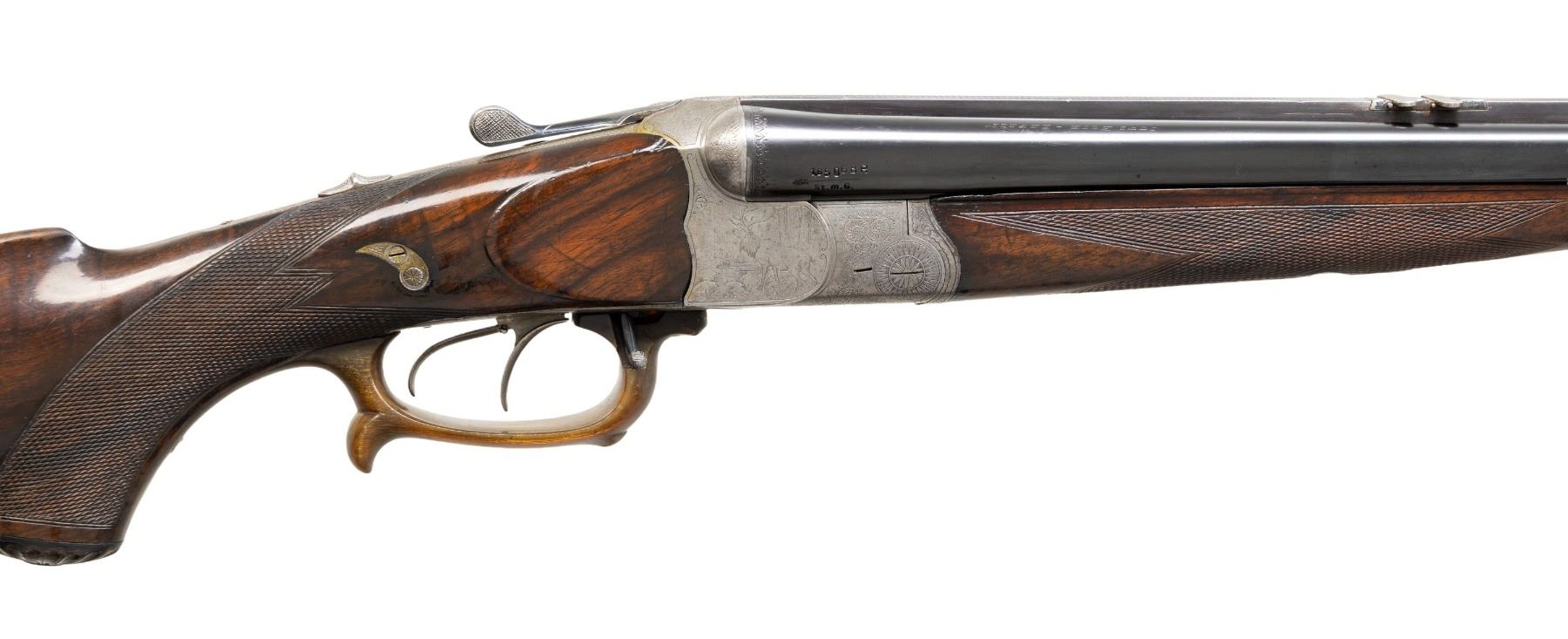 BOCK WITH CASE AND WINTER 2015 DOUBLE GUN JOURNAL. Cal. 16 Ga. 2-9/16" (rifled choke)/8x58R (360 base)/30-30 Win. S# 10377. The 26-3/4" barrel set with full length matted rib is fitted with two folding leaf rear and small bead front sights and has dolls head extension. Tops of barrels are engraved "Otto Bock-Berlin" and "Kgl. Hoflieferant". Barrel flats are stamped with Imperial German nitro proofs for 16 Ga. and 7.8mm. Bottom barrel is newly stamped "30.30 W". Coin finished blitz action with double arched back features tang safety for front trigger, side safety for rear trigger, bottom rifle selector is on right front side of trigger guard and is fired by front trigger. Action is engraved with simple scroll surrounding well detailed game scenes on sides with pointer in field with fence in background on left and a stag looking into an open meadow on right. Trigger guard is horn and has finger spur on bow. Tang extends to sunburst horn grip cap. Nicely fiddle figured European walnut capped pistol grip buttstock measures 14" over ribbed horn buttplate and features standard right hand cheekpiece, point pattern checkering and sling loop on toeline. Matching splinter forend has Deeley release. MEASUREMENTS: BBL: Bore Diameter: L .680. Restriction: L .033 (rifled choke). Wall thickness: L .019. STOCK: DAH: 2-13/16". DAC: 1-5/16". CAST: 1/2" cast off. LOP: 14". WEIGHT: 8 lb. 3 oz. UNATTACHED ACCESSORIES: combo is housed in new green canvas leather trimmed case; lined in red velvet. Reproduction maker's labels are in lid. Case contains snap caps for each caliber. Also included is the Winter 2015 issue of Double Gun Journal. CONDITION: good as mostly refinished. Barrels retaining nearly all re-black. Action cleaned to silver gray. Finely detailed engraving remains good. Stocks retain nearly all glossy refinish over many marks and dings. Checkering appears to be correctly re-run. Bores are very good; shiny, slightly dark in grooves. Action is fairly loose with barrels off face. Mechanics appear to work once you sort out what does what. Case is near new with some exterior rubs. Interior with some compressions. PROVENANCE: From the Buckstix Collection. (25-7027/MGM). MODERN. $4,000-6,000.