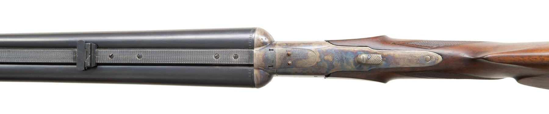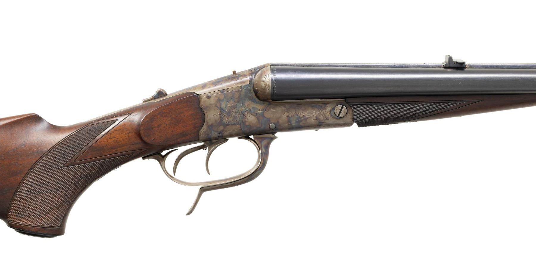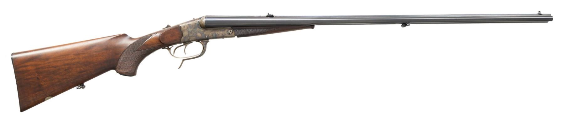 Cal. 5.6x35 (22 Hornet)/20 Ga. S# 2228. The 27-5/8" barrels are fitted with full length matted rib holding one standing, one folding rear and silver bead front sights. Bottoms of barrels are stamped with German nitro proofs for 5.4/35 and 20 gauge. Case hardened underlever boxlock type action features non-automatic safety, pin cocking indicators on top and double triggers (front set). Action is engraved with sprays of scroll within line borders. Small maker's logo "JGA" is on left side of action to the right and above S#. Horn capped pistol grip buttstock of somewhat marbled European walnut measures 14-1/8" over ribbed horn buttplate and features sculpted side panels, point pattern grip checkering, small right hand cheekpiece and vacant silver circle on toeline which is also fitted with sling loop matching the one found on barrels. Barrels take down with removal of hinge pin. Matching schnabled splinter forend screws to barrel set. MEASUREMENTS: BBLS: Bore Diameter: L .635. Restriction: L .032 (full). Wall thickness: L .026. STOCK: DAH: approx. 2-3/4". DAC: approx. 1-1/2". CAST: approx. 1/2" off. LOP: 14-1/8". WEIGHT: 6 lb. 11 oz. CONDITION: very fine original. Metal retaining over 95% barrel blue and action color. Stocks retain nearly all of their oil finish with some minor scratches and marks. Checkering very lightly worn. A fair amount of wood is chipped away from exposed end of forend that is designed to have no iron. Bores are bright and shiny. Action is tight. Trigger will set (note safety must be pulled back to fire). PROVENANCE: From the Buckstix Collection. (25-6450). CURIO. $3,500-5,000.