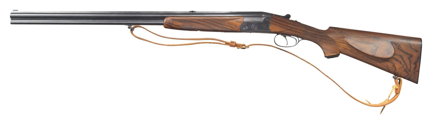 SEMPERT & KREIGOFF. Cal. 20 Ga. 2-5/8"/6.5x52 (25-35 Winchester) S# 13911. The 25-5/8" demi-bloc barrels are fitted with full length matted rib with dolls head extension holding flip-up rear and silver bead front sights. Left side of top barrel is engraved "SEMPERT & KREIGOFF, SUHL." Bottoms of barrels are stamped with November 1929 German nitro proofs for 20 gauge and 6.5x52 (25-35 Winchester drops into chamber). Blue, scallop backed, blitz, O/U action features safety on top tang along with pin cocking indicators and double triggers (front set). Action is engraved with line borders and sprays of scroll. Trigger guard is steel. Newly made capped pistol grip buttstock of nicely marbled European walnut measures 14-1/2" over checkered horn buttplate and features right hand cheekpiece, point pattern checkering and sling loop on toeline matching loop on bottom barrel. Matching one piece slim forend has Deeley release. Rifle is fitted with leather sling. MEASUREMENTS: BBLS: Bore Diameter: O .629. Restriction: O .011 (light mod). Wall thickness: O .020. STOCK: DAH: 2-3/4". DAC: 1-5/8". CAST: about 1/2" off. LOP: 14-1/2". WEIGHT: 5 lb. 10 oz. CONDITION: very fine as restored. Metal parts retaining nearly all of a professional re-black. Very finely made stocks retain all of their original oil finish with a few handling and assembly marks, most noticable a 1-1/4" shallow dent on left side of forend in front of action. Bores are fine. There are plugged scope mounting holes in top rib. Mechanically good except action has a hint of looseness. Trigger will set. PROVENANCE: Estate of Lloyd Robinson. (25-6667/MGM). CURIO. $2,500-3,500.