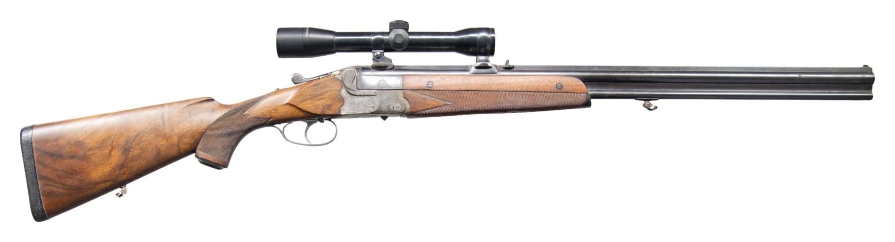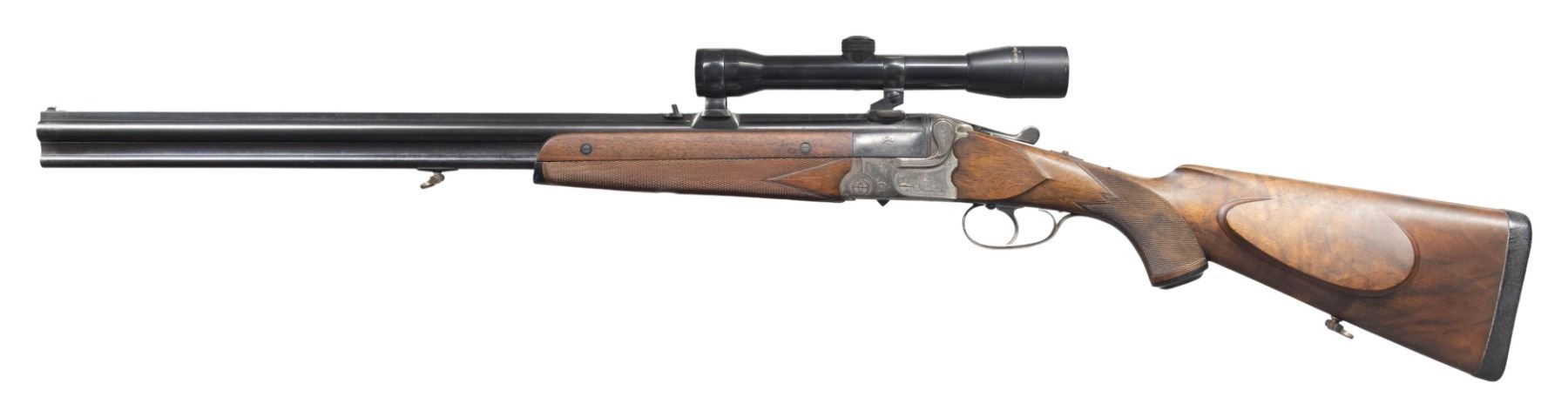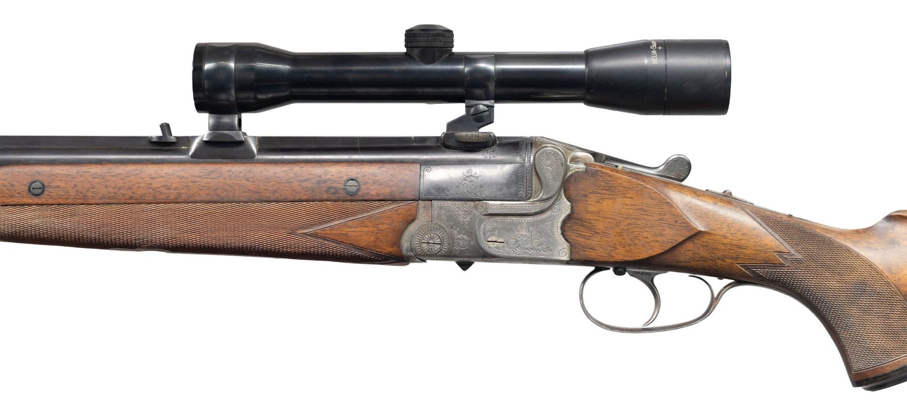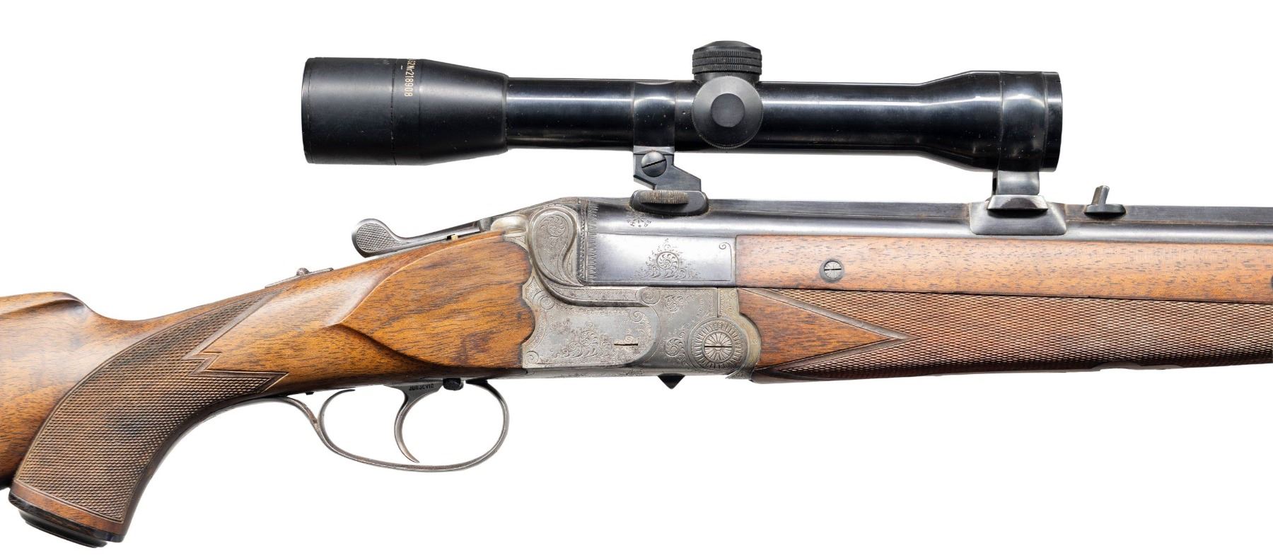 SHOTGUN BARRELS, SCOPE & CASE. Cal. 20 Ga./20 Ga. - 20 Ga./7x57R. S# 43235. The 28-1/4" 20 Ga. O/U barrels are fitted with full length matted rib. The 25-5/8" rifle/shotgun barrels are fitted with matching rib holding one standing leaf rear and silver bead front sights and claw scope bases. Maker's name and address is engraved in milled out portion of rib on both barrels. Shotgun barrels are stamped with October 1936 German nitro proofs for 20 gauge. Coin finished scallop back O/U single Kirsten action features non-automatic tang safety and selective "Jurjevic" single trigger. Action is engraved with sprays of scroll within scroll and line borders. Trigger guard is steel. Lightly figured and veined European walnut horn capped pistol grip buttstock measures 14-3/8" over black leather covered pad and features shadow line right hand cheekpiece, point pattern checkering and sling loop on toeline matching ones found on both barrel sets. Matching three piece ejector forend with horn tip has Deeley release and serves both barrel sets. MEASUREMENTS: BBLS: Bore Diameters: O .639 U 637. Restriction: O.004 (IC). U .004 (IC). Wall thickness: O .032. U .032. STOCK: DAH: 2-3/4". DAC: 1-1/2". CAST: about 1/4" off. LOP: 14-3/8". WEIGHT: 6 lb. 9 oz. Rifle/Shotgun BBLS: Bore Diameter: O .638. Restriction: O .028 (IMod). Wall thickness: O .029. WEIGHT: 7 lb. 4 oz. UNATTACHED ACCESSORIES: rifle is mounted with Kahles Helia-Super 4X scope with duplex reticle in soldered on claw rings (rear with windage). Rifle is housed in brown vinyl case lined in blue cloth containing a test target and Lothar Walther box containing 2-20 gauge snap caps and 1 for 7x57R. CONDITION: good as partially restored. Both barrel sets retaining most of a re-black over considerable minor frosting and pitting. Action is cleaned to coin finish and shows staining from rust mostly on right side. Stocks nicely refinished in oil have need of more oil added. Checkering is very nicely re-cut. All shotgun bores are bright and shiny without noted problems. Rifle bore is also fine but a bit dark. Action is tight. Trigger and ejectors appear to work well. Case is good. Scope is fine on exterior; optically clear. Case is good. (25-5050/MGM). CURIO. $2,500-3,500.