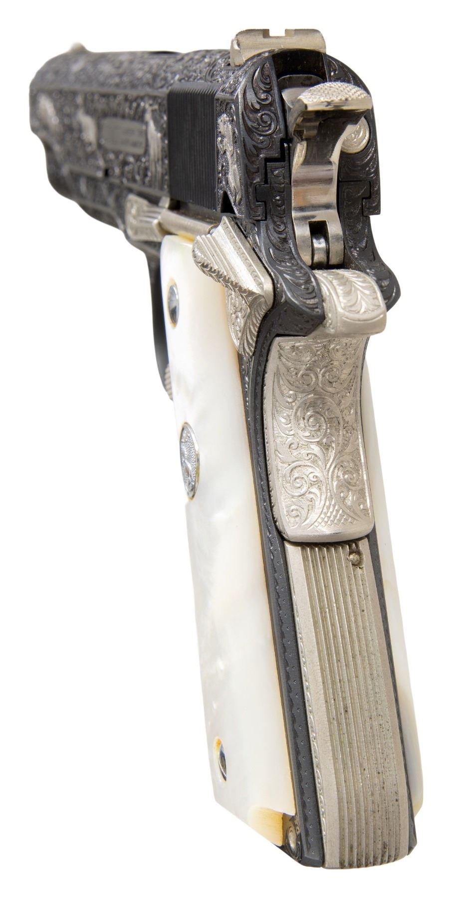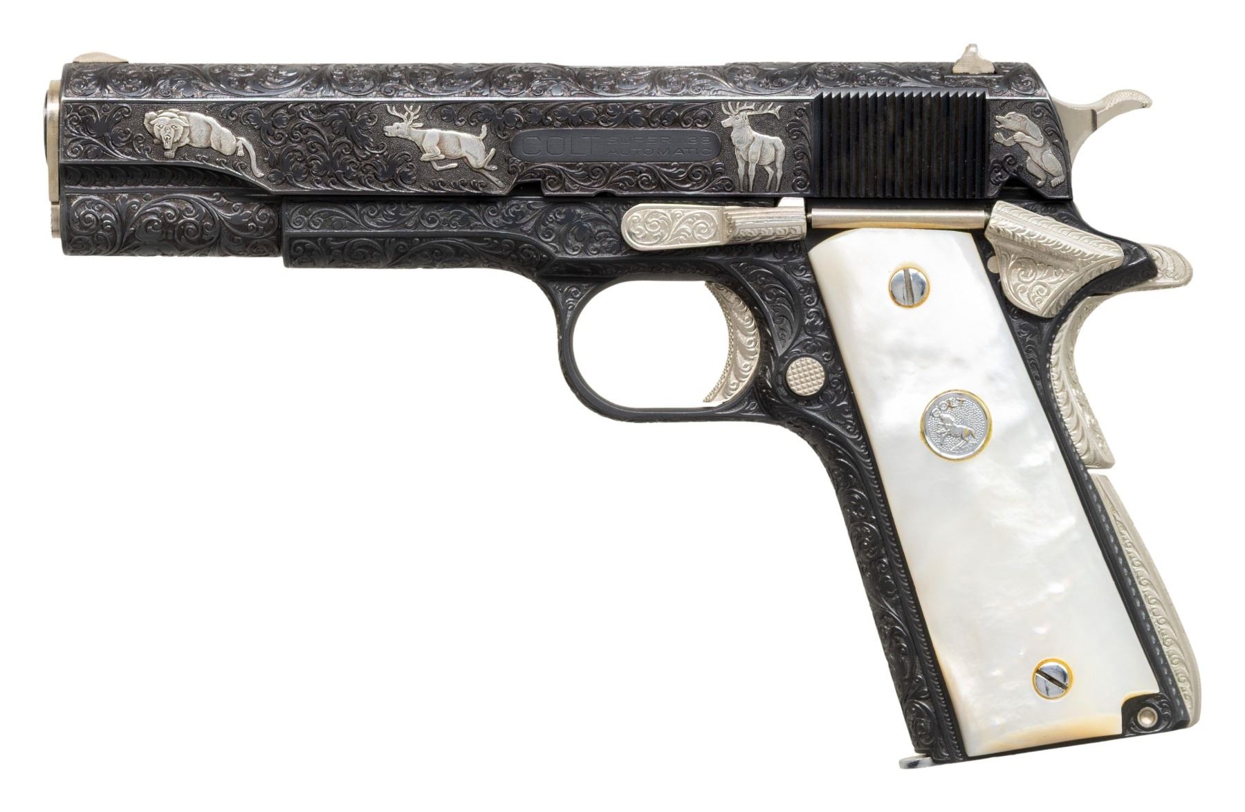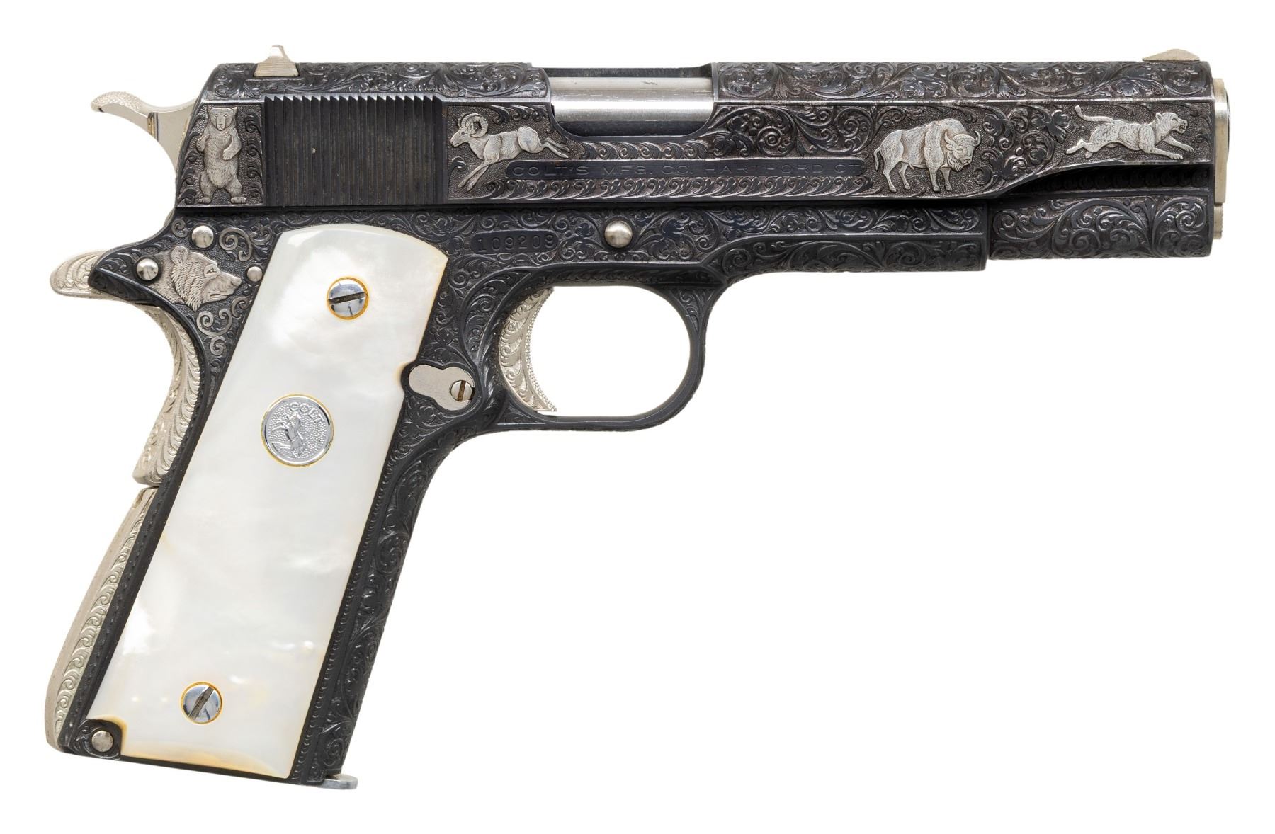 PISTOL. Cal. 38 Super. S# 109209. Bbl. 5" with "COLT .38 SUPER AUTO"; in the white at ejection port area. Mfg. 1953 (1929-1973) as a pre-70 series commercial model. Fully engraved with two tone blued and nickeled finish having the addition of 4 silver inlaid animals on each side of the slide plus another at top right rear of the frame. The engraving is bank note scroll with shaded backgrounds and distinct borders. Signed under left grip below each screw bushing and vertically under the right grip along the back strap; signature appears to be "GHO". Colt slide markings and serial number are within oval banners; no trigger guard markings. All blued with nickel accents to include barrel bushing, spring plug, slide lock, trigger (short with checkered face), grip screws, grip medallions, 1911 style wide spur hammer, grip safety, plunger tube, arched mainspring housing (grooved), both sights, extractor, thumb safety, magazine latch assembly, and its 3 frame pins. Colt genuine pearl grips. Spring guide has bullet shaped nose like those used in Gold Cups. MAGS: factory 9 rd.; nickeled with engraved floorplate. CONDITION: all aspects are near excellent and it appears new. A fine example with stellar grips, superb workmanship and a pleasing design upon a seldom enhanced model. (25-4291/NW). CURIO. $3,000-5,000.
