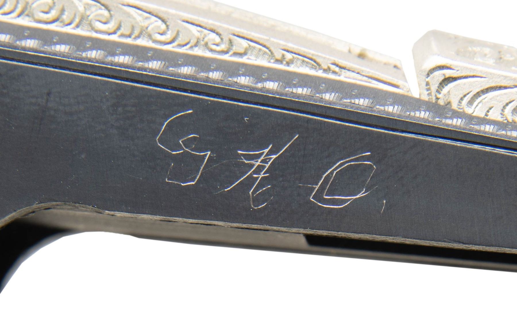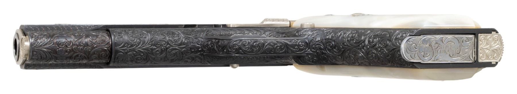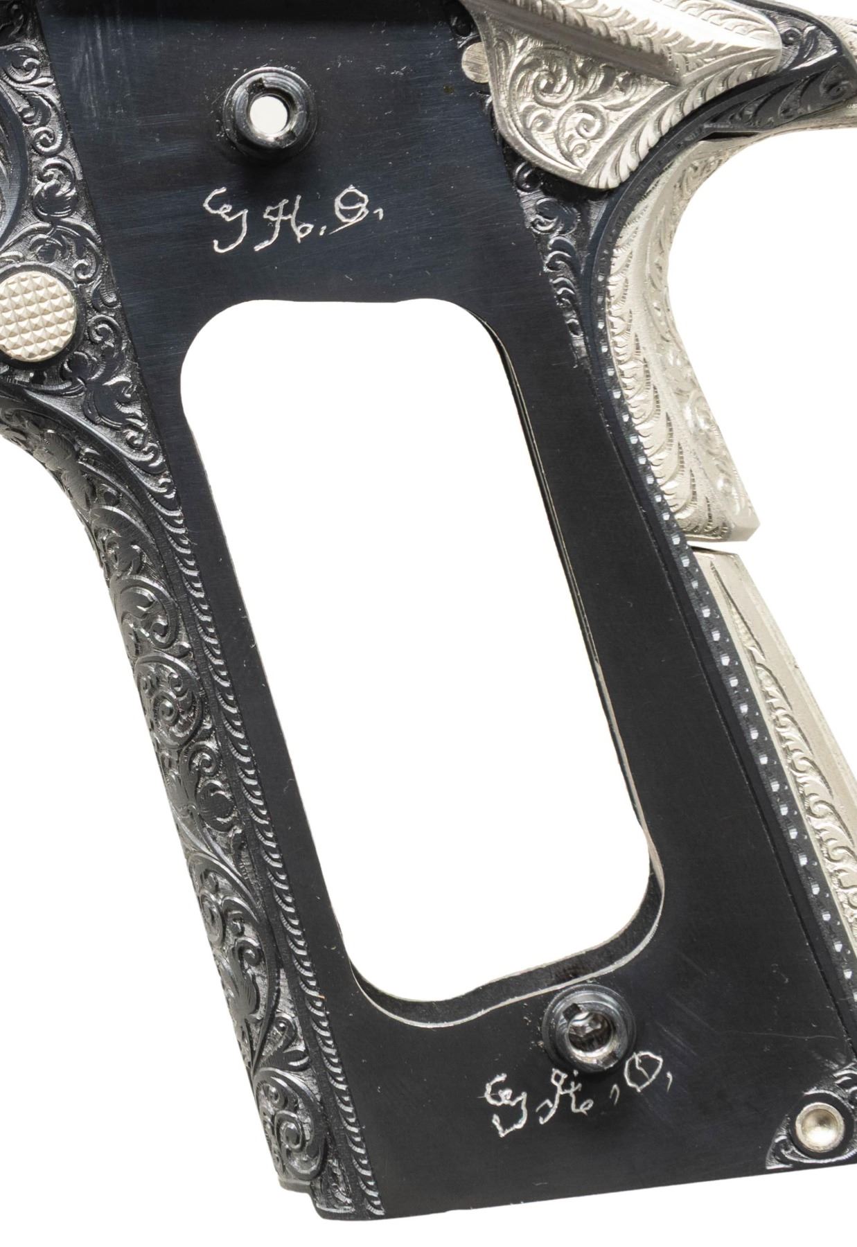 PISTOL. Cal. 38 Super. S# 109209. Bbl. 5" with "COLT .38 SUPER AUTO"; in the white at ejection port area. Mfg. 1953 (1929-1973) as a pre-70 series commercial model. Fully engraved with two tone blued and nickeled finish having the addition of 4 silver inlaid animals on each side of the slide plus another at top right rear of the frame. The engraving is bank note scroll with shaded backgrounds and distinct borders. Signed under left grip below each screw bushing and vertically under the right grip along the back strap; signature appears to be "GHO". Colt slide markings and serial number are within oval banners; no trigger guard markings. All blued with nickel accents to include barrel bushing, spring plug, slide lock, trigger (short with checkered face), grip screws, grip medallions, 1911 style wide spur hammer, grip safety, plunger tube, arched mainspring housing (grooved), both sights, extractor, thumb safety, magazine latch assembly, and its 3 frame pins. Colt genuine pearl grips. Spring guide has bullet shaped nose like those used in Gold Cups. MAGS: factory 9 rd.; nickeled with engraved floorplate. CONDITION: all aspects are near excellent and it appears new. A fine example with stellar grips, superb workmanship and a pleasing design upon a seldom enhanced model. (25-4291/NW). CURIO. $3,000-5,000.